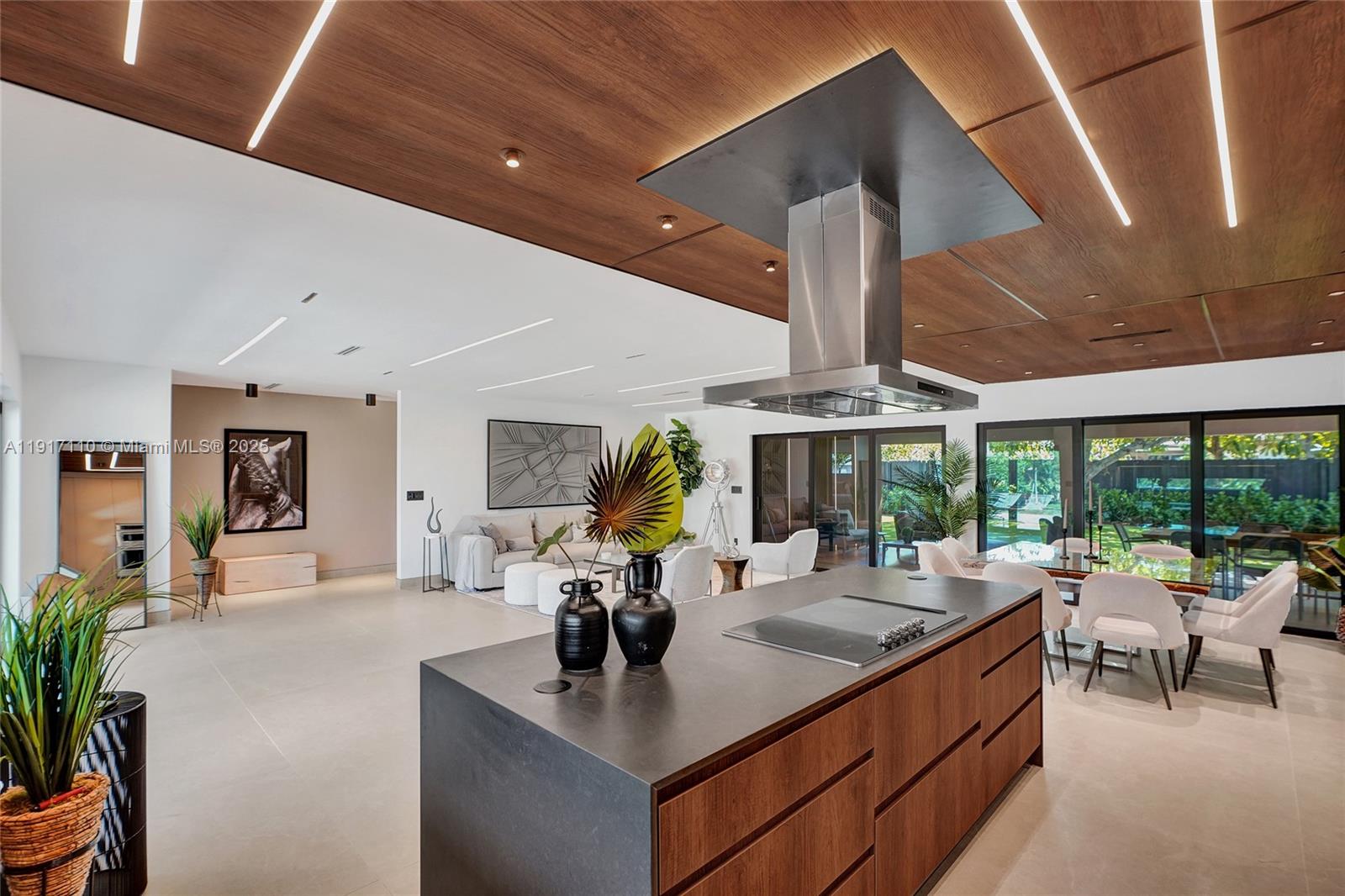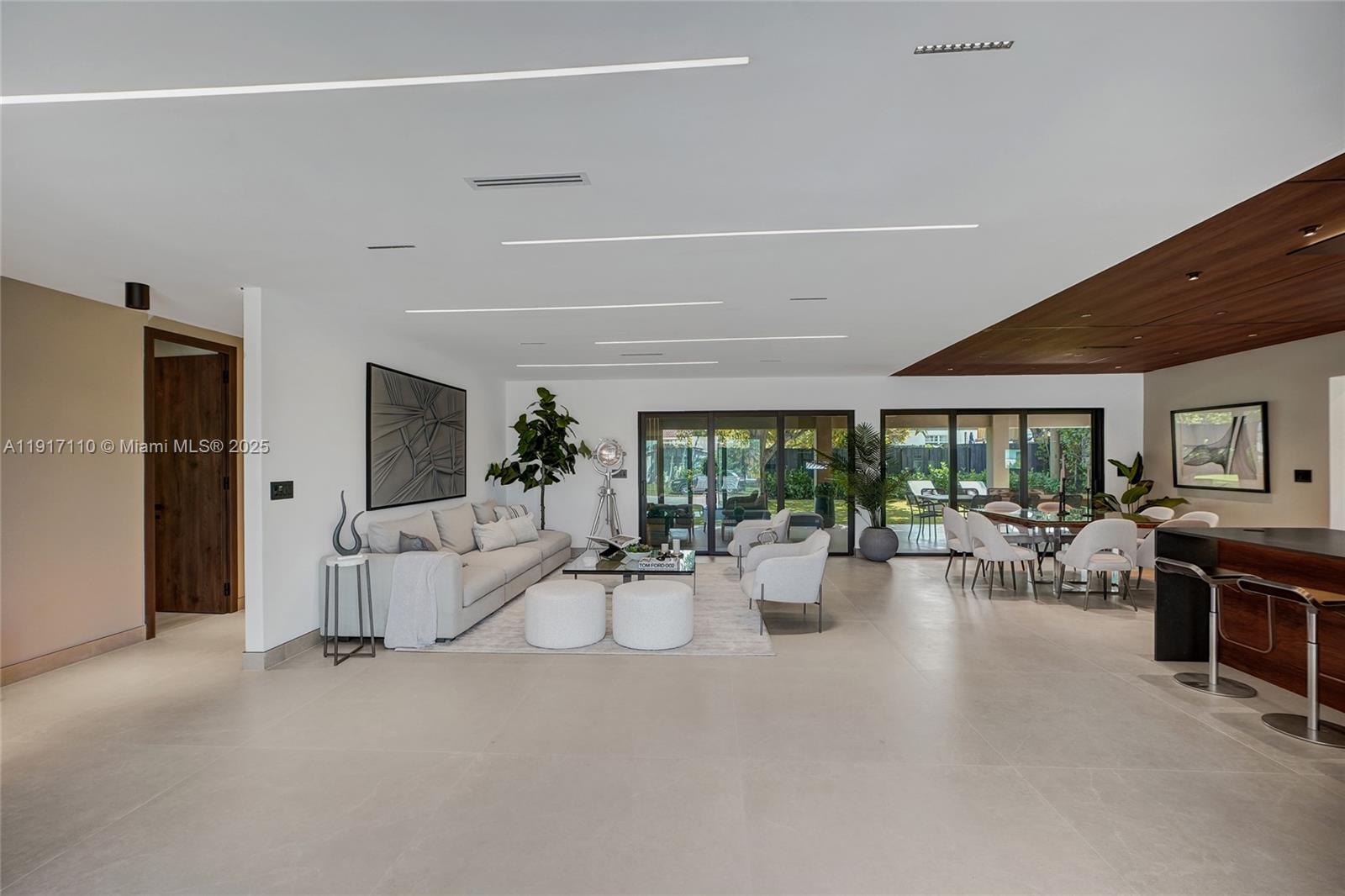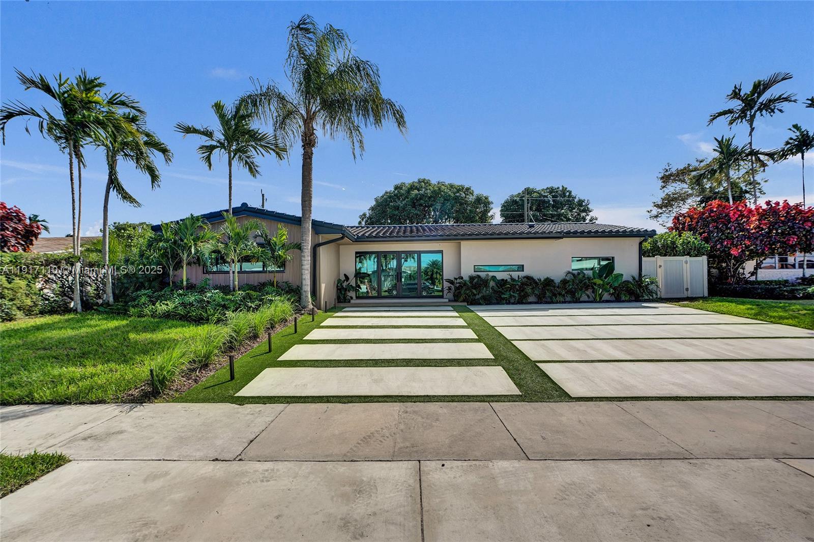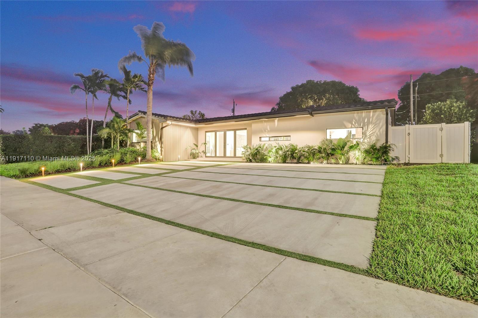 Stunning, fully remodeled modern home featuring clean architectural lines, warm natural tones, and top-quality finishes throughout. The open-concept layout highlights a sleek Italian-style kitchen with custom wood cabinetry, quartz countertops, and top-of-the-line appliances, including stainless steel appliances. This elegant residence features impact-resistant windows and doors, Italian-built-in closets, large porcelain floors, high ceilings, and designer LED lighting. The spacious living and dining areas are surrounded by glass sliders that fill the home with natural light and create a perfect indoor-outdoor flow. The outdoor space is designed for entertaining, featuring a built-in BBQ, artificial grass, and beautifully landscaped gardens. Every detail combines luxury and functionality