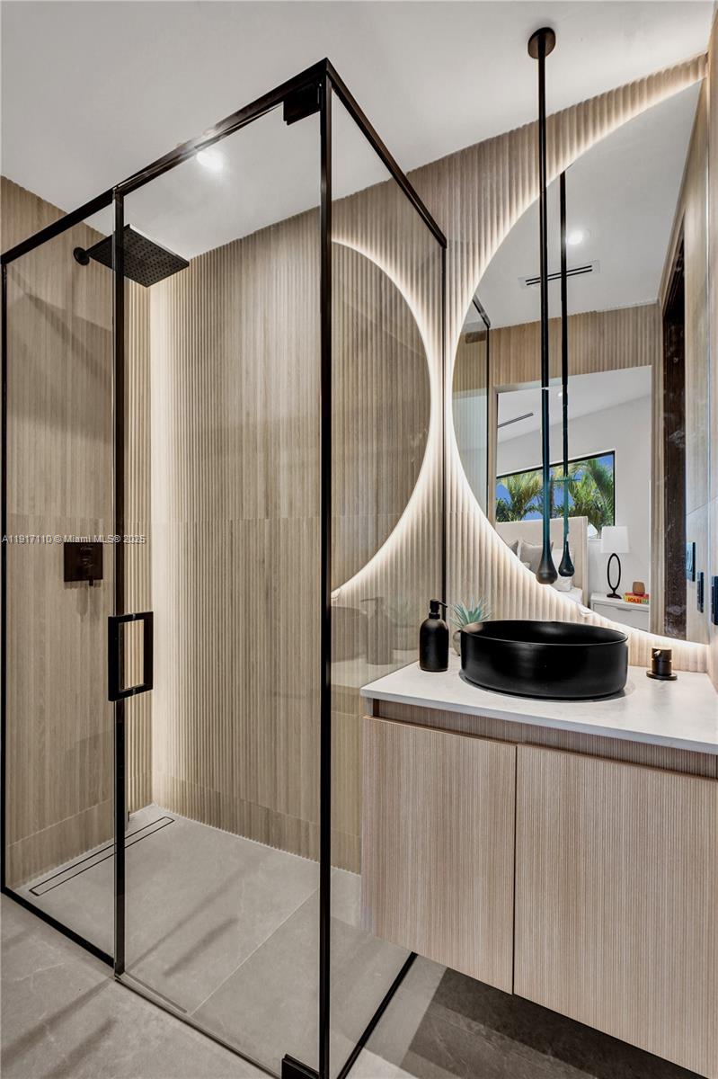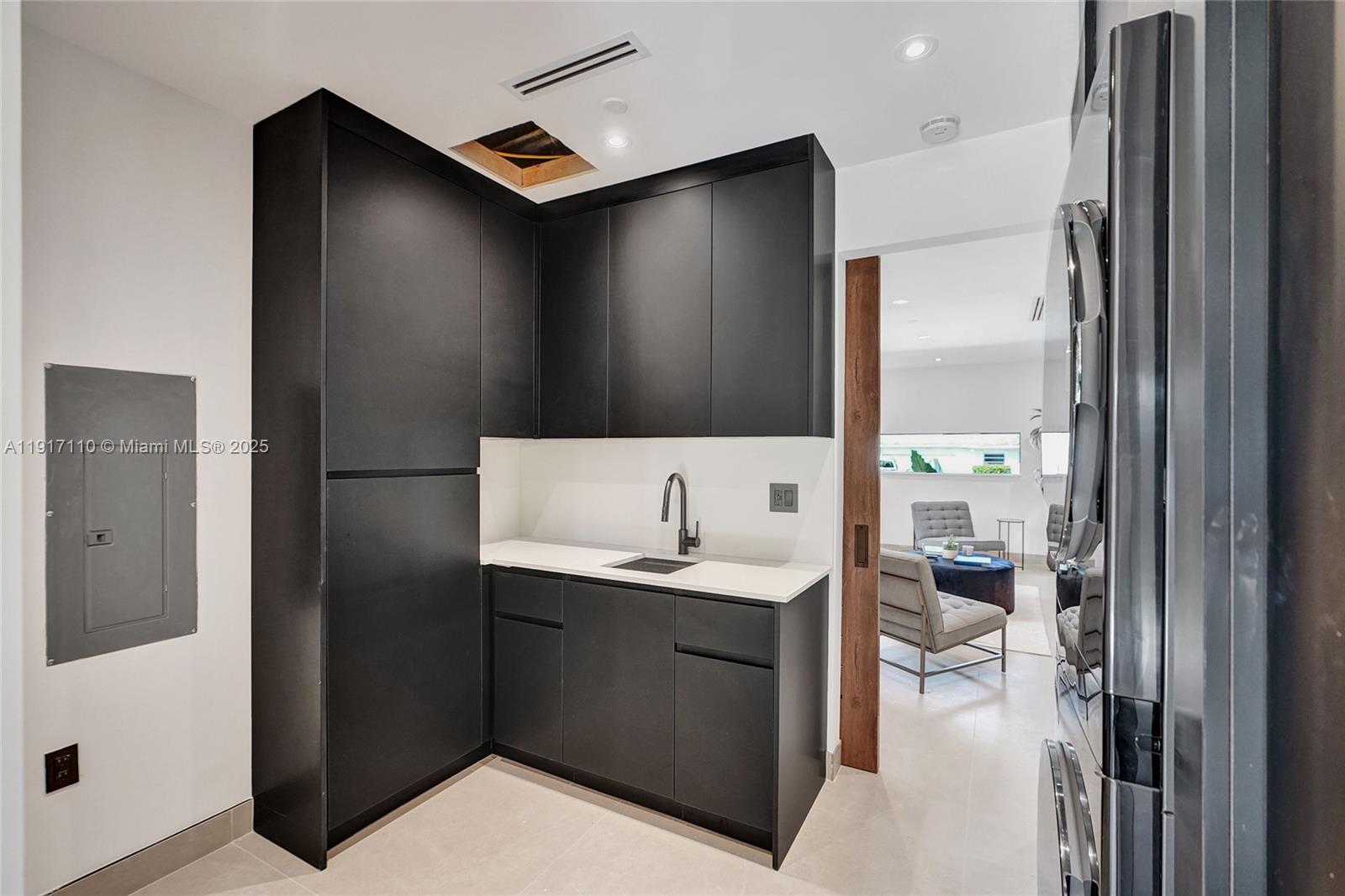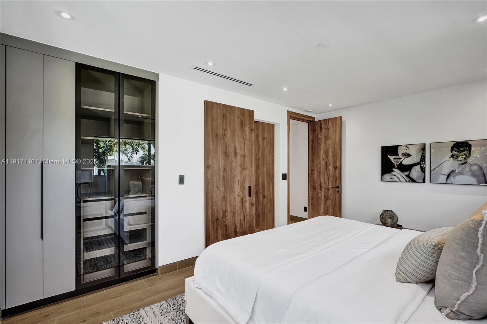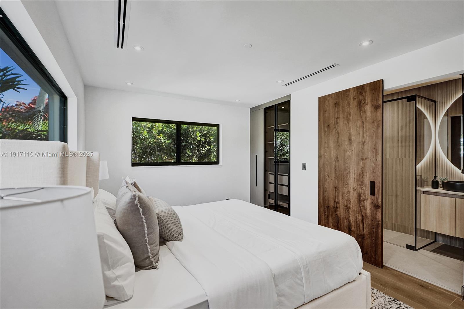 Stunning, fully remodeled modern home featuring clean architectural lines, warm natural tones, and top-quality finishes throughout. The open-concept layout highlights a sleek Italian-style kitchen with custom wood cabinetry, quartz countertops, and top-of-the-line appliances, including stainless steel appliances. This elegant residence features impact-resistant windows and doors, Italian-built-in closets, large porcelain floors, high ceilings, and designer LED lighting. The spacious living and dining areas are surrounded by glass sliders that fill the home with natural light and create a perfect indoor-outdoor flow. The outdoor space is designed for entertaining, featuring a built-in BBQ, artificial grass, and beautifully landscaped gardens. Every detail combines luxury and functionality