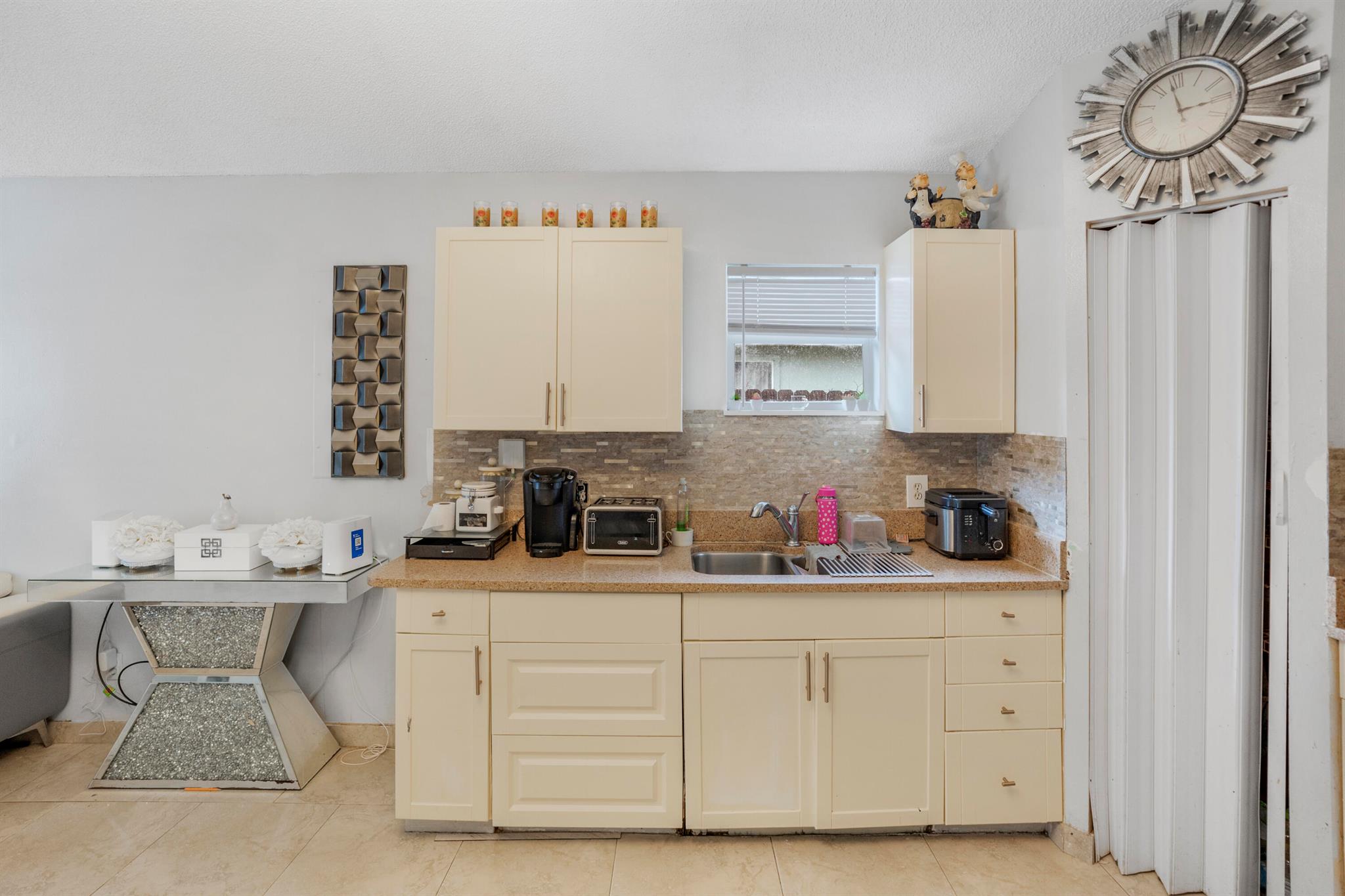 This charming home is being sold as is. It features two bedrooms and two bathrooms, with a remodeled garage that has been converted into an additional living space (a big room that can serve as another bedroom). The enclosed porch now serves as a cozy living room and kitchen area. The entire house boasts new tile flooring and upgraded bathrooms. The kitchen has been freshly painted, and new tiles have been added to the backsplash, giving it a modern and refreshed look.Additionally, there's great rental potential, as one section of the house can be used as a separate unit. This section includes its own bedroom, bathroom, kitchen, and a walk-in closet, plus a separate entrance for privacy.