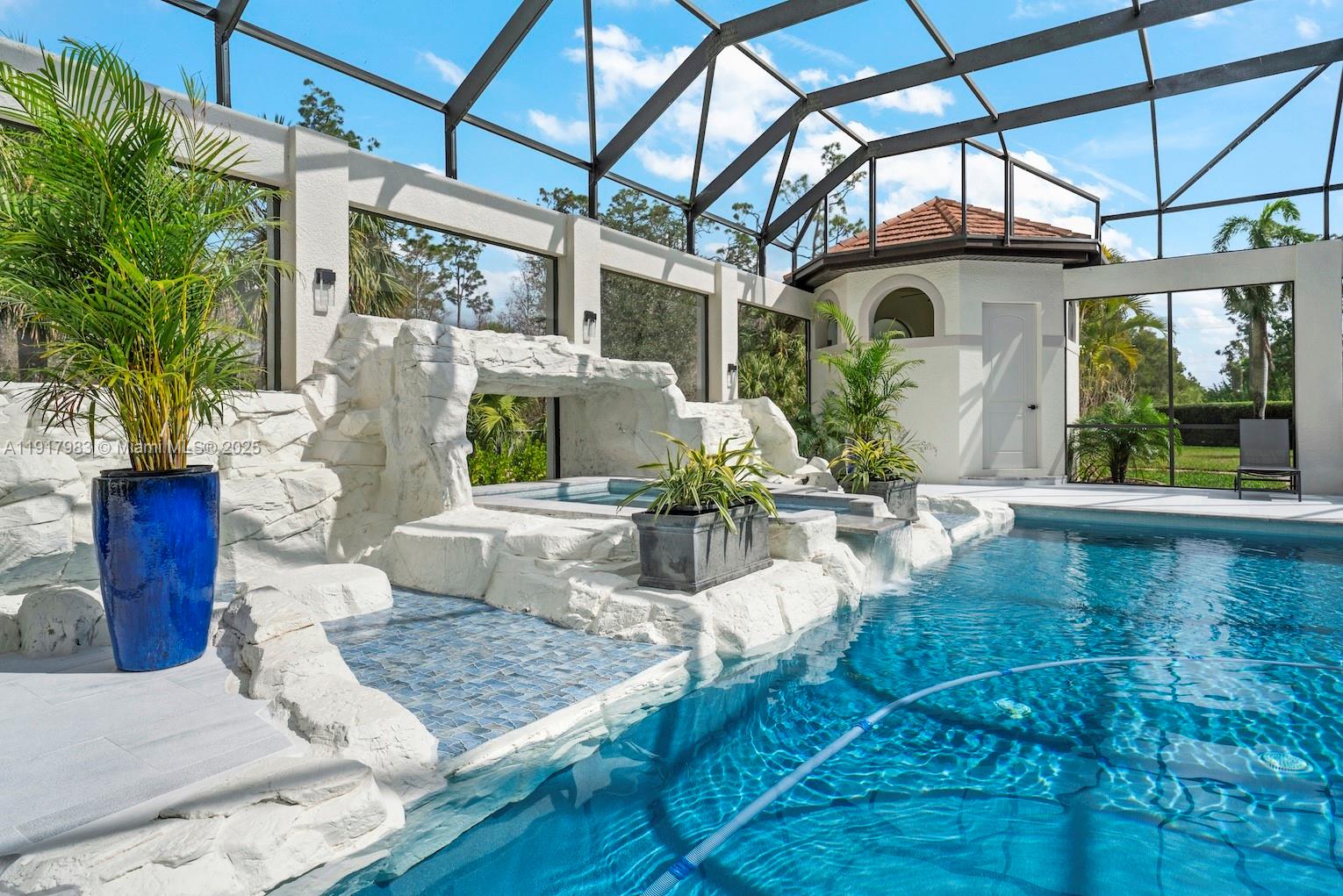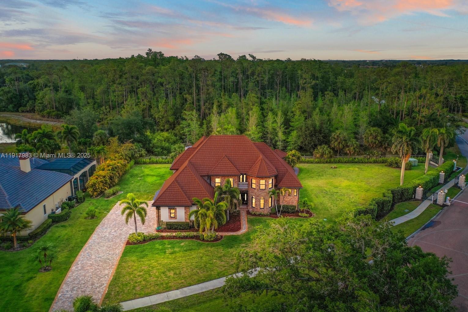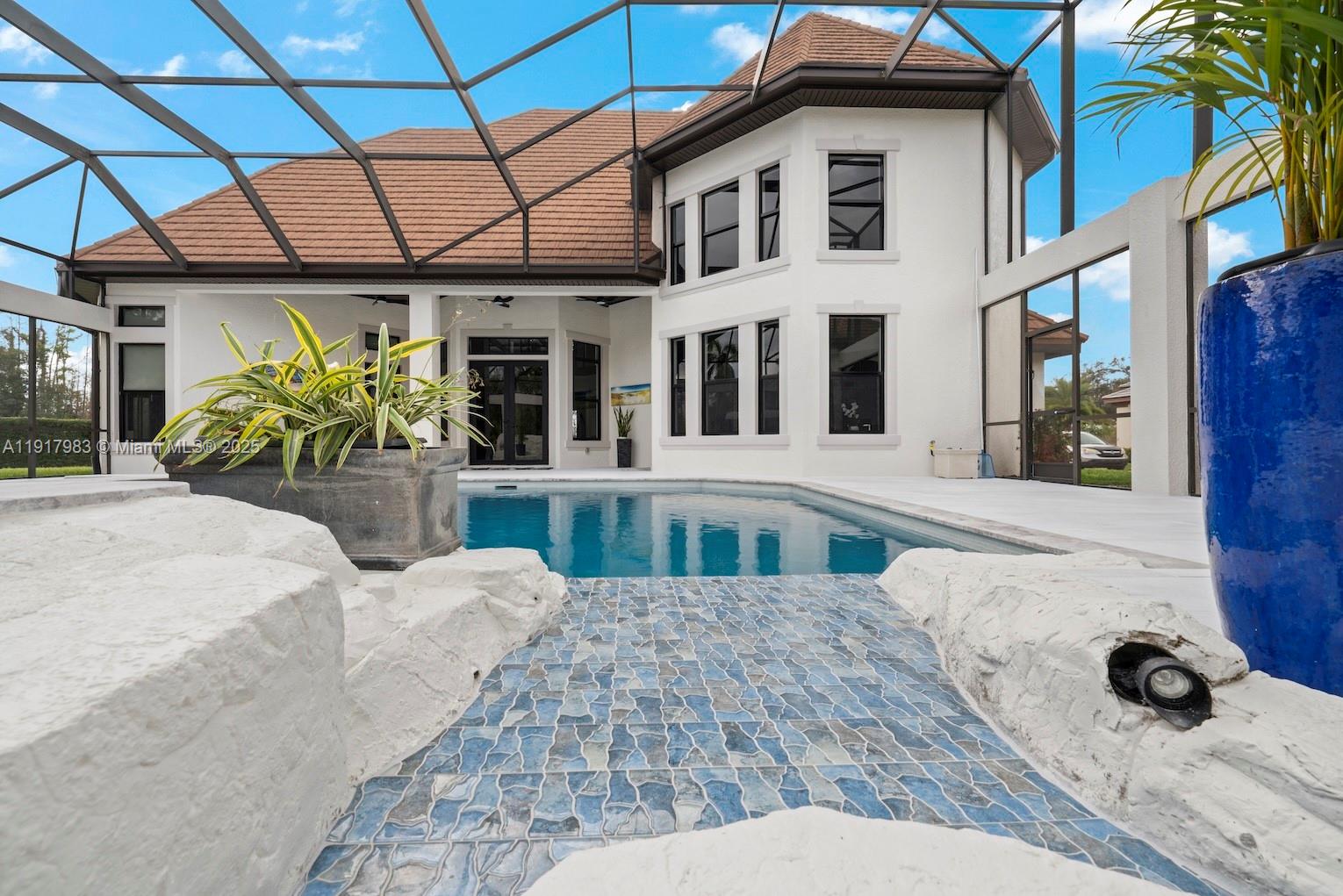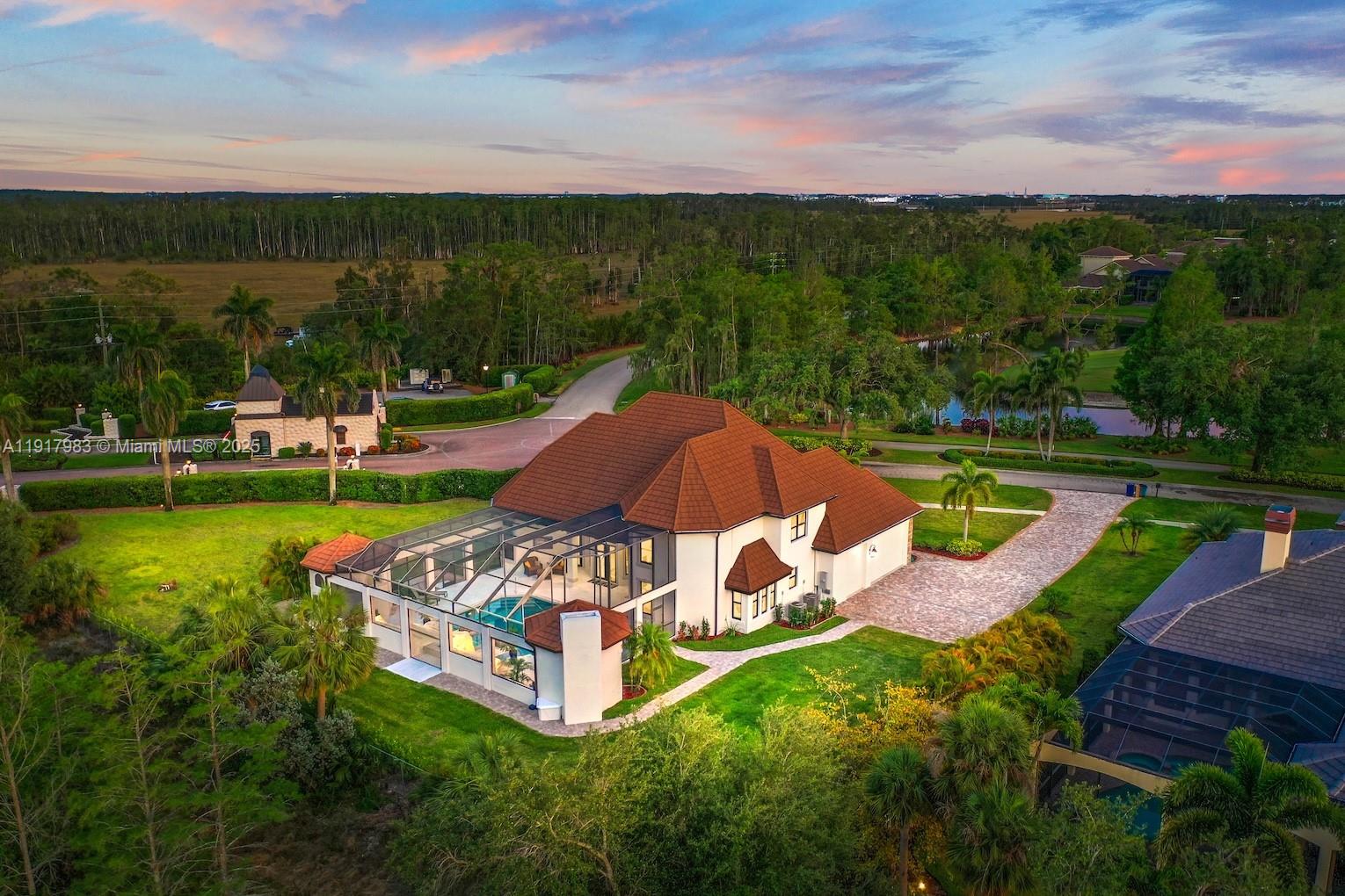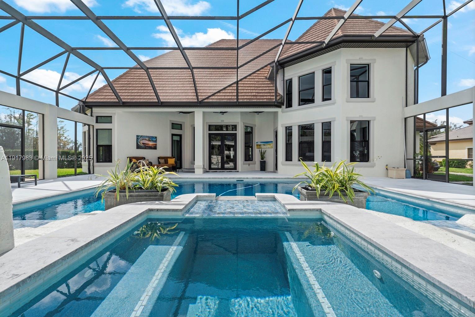 Discover this completely renovated Castle-style estate featuring 4 bedrooms, 4.5 baths, plus a spacious den, all nestled on an oversized premium lot. This extraordinary residence offers a seamless blend of luxury, comfort, and resort-style living with preserve views. The backyard is a true tropical oasis, showcasing a custom oversized pool with multiple waterfalls, a heated spa, and a beautifully designed outdoor kitchen and grill area—perfect for entertaining. An outdoor full bathroom provides added convenience for poolside gatherings. Inside, the home features tile and wood flooring throughout, a large open gourmet kitchen with high-end finishes, and a first-floor primary suite offering privacy and comfort. The architectural details and thoughtful layout create an inviting atmosphere with plenty of natural light. Additional highlights include a stone-coated metal roof, spacious living areas, and an oversized den ideal for an office, gym, or media room. This rare offering combines elegance, quality craftsmanship, and resort-style amenities—truly a one-of-a-kind property. Easy access to the gate and clubhouse. Mandatory equity membership fee of $115,000 due at closing.