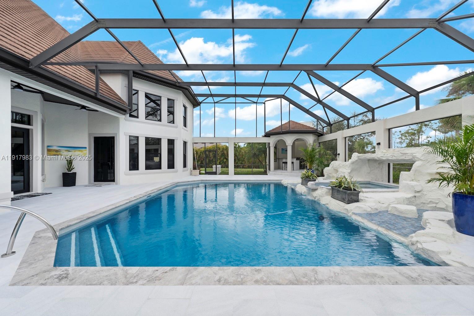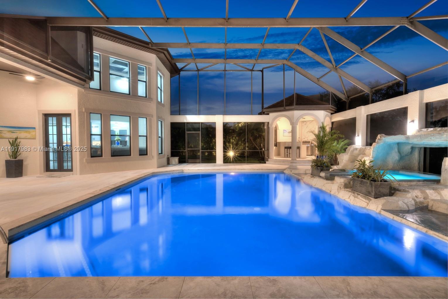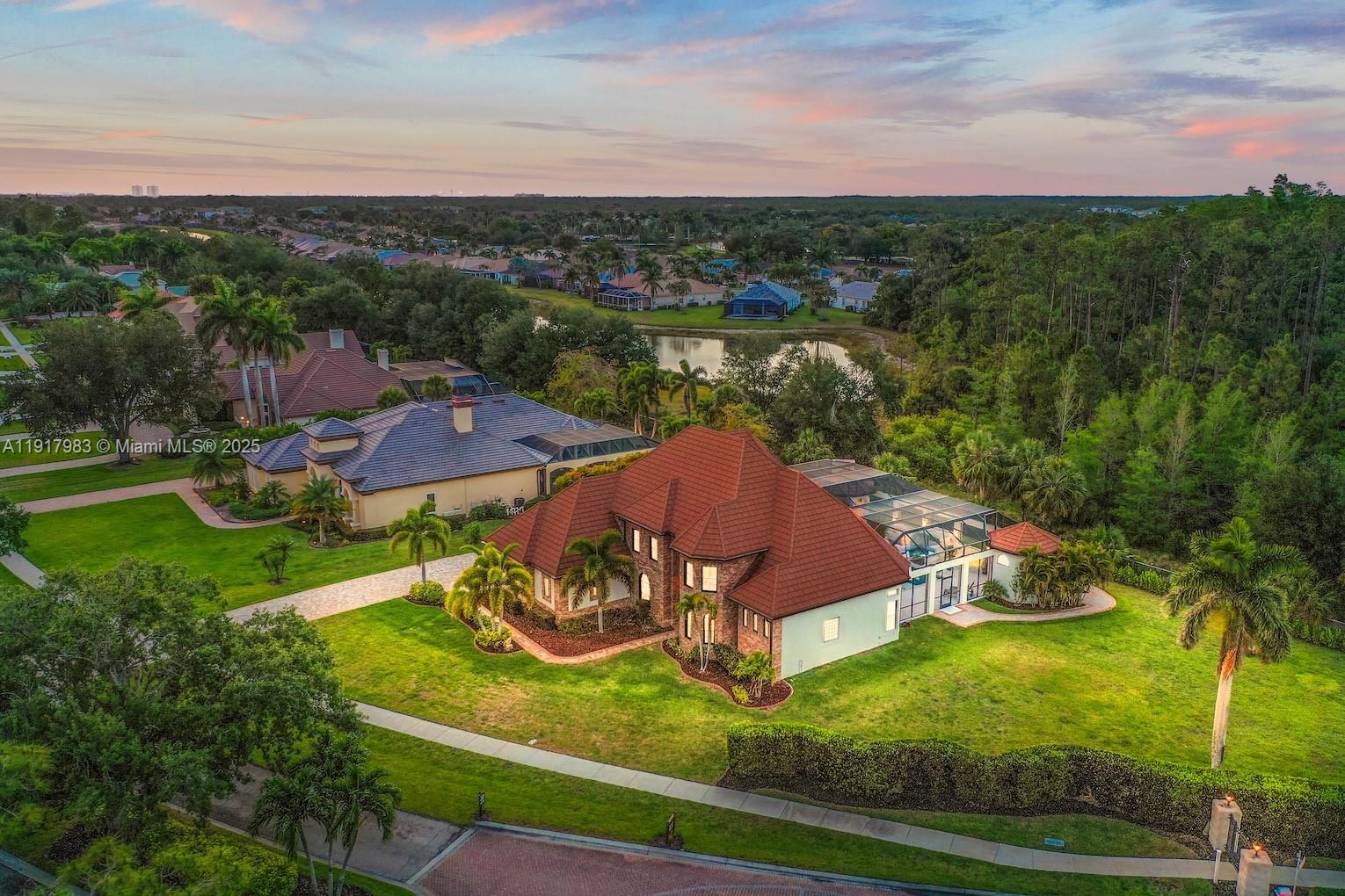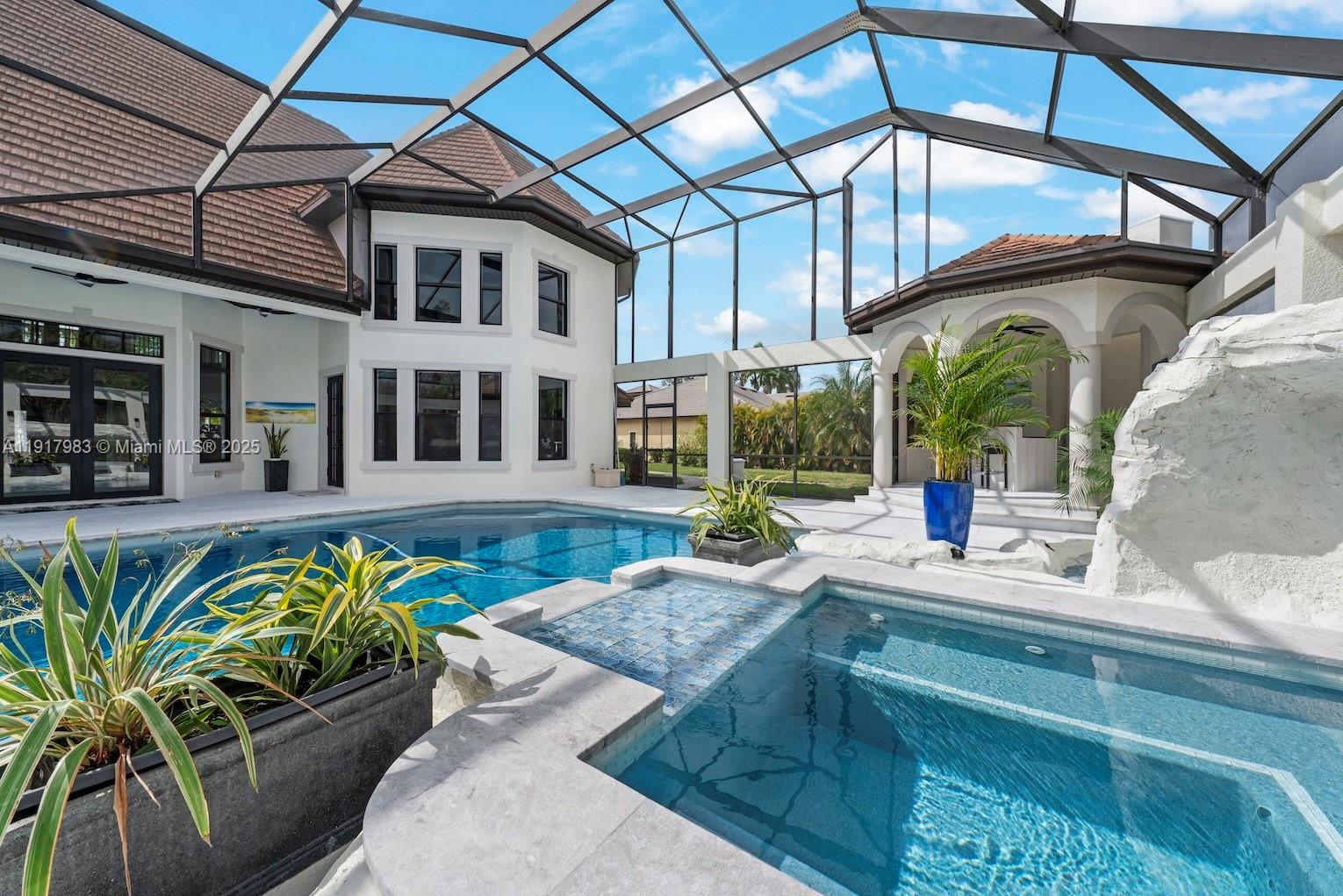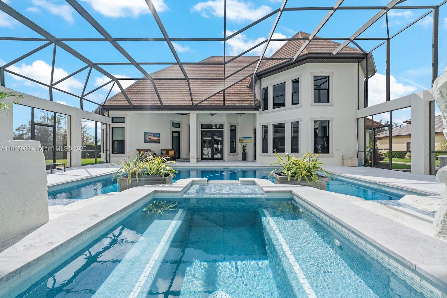 Discover this completely renovated Castle-style estate featuring 4 bedrooms, 4.5 baths, plus a spacious den, all nestled on an oversized premium lot. This extraordinary residence offers a seamless blend of luxury, comfort, and resort-style living with preserve views. The backyard is a true tropical oasis, showcasing a custom oversized pool with multiple waterfalls, a heated spa, and a beautifully designed outdoor kitchen and grill area—perfect for entertaining. An outdoor full bathroom provides added convenience for poolside gatherings. Inside, the home features tile and wood flooring throughout, a large open gourmet kitchen with high-end finishes, and a first-floor primary suite offering privacy and comfort. The architectural details and thoughtful layout create an inviting atmosphere with plenty of natural light. Additional highlights include a stone-coated metal roof, spacious living areas, and an oversized den ideal for an office, gym, or media room. This rare offering combines elegance, quality craftsmanship, and resort-style amenities—truly a one-of-a-kind property. Easy access to the gate and clubhouse. Mandatory equity membership fee of $115,000 due at closing.