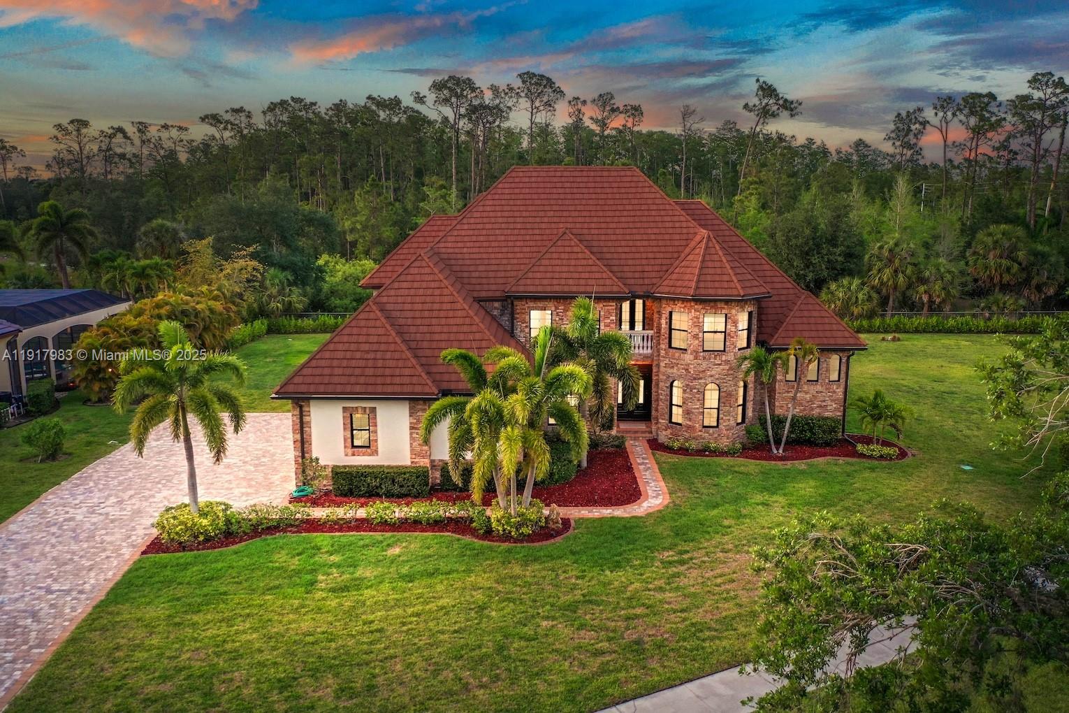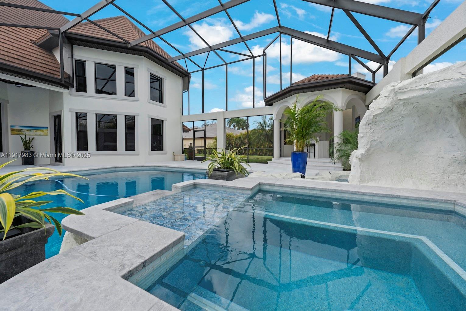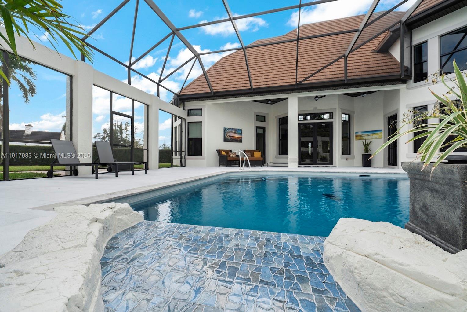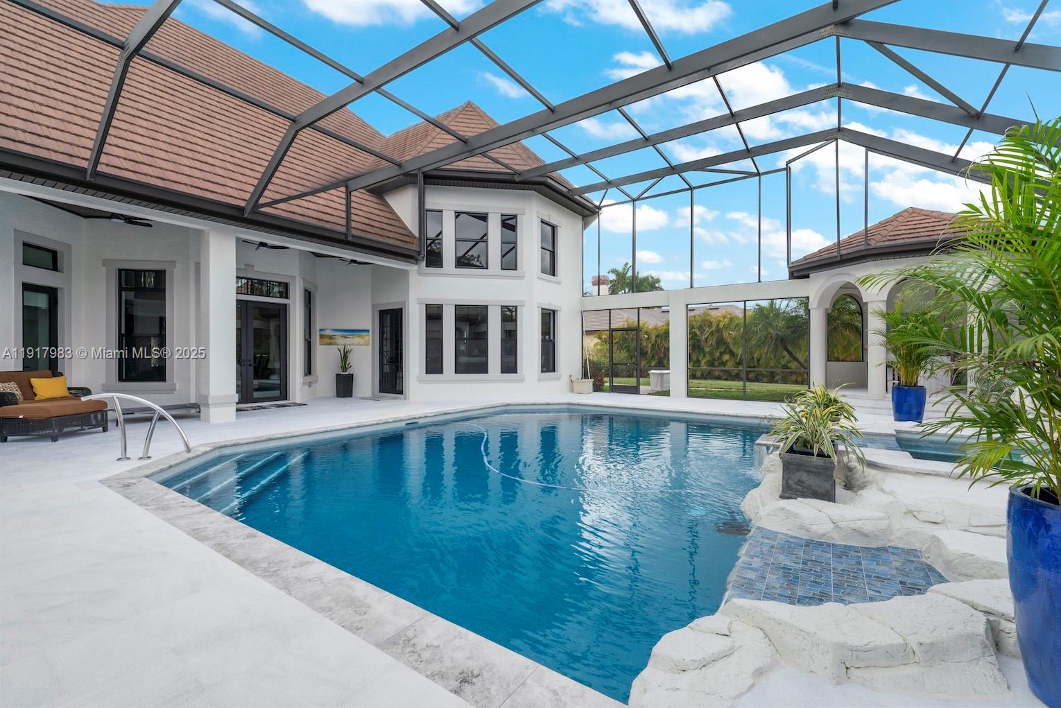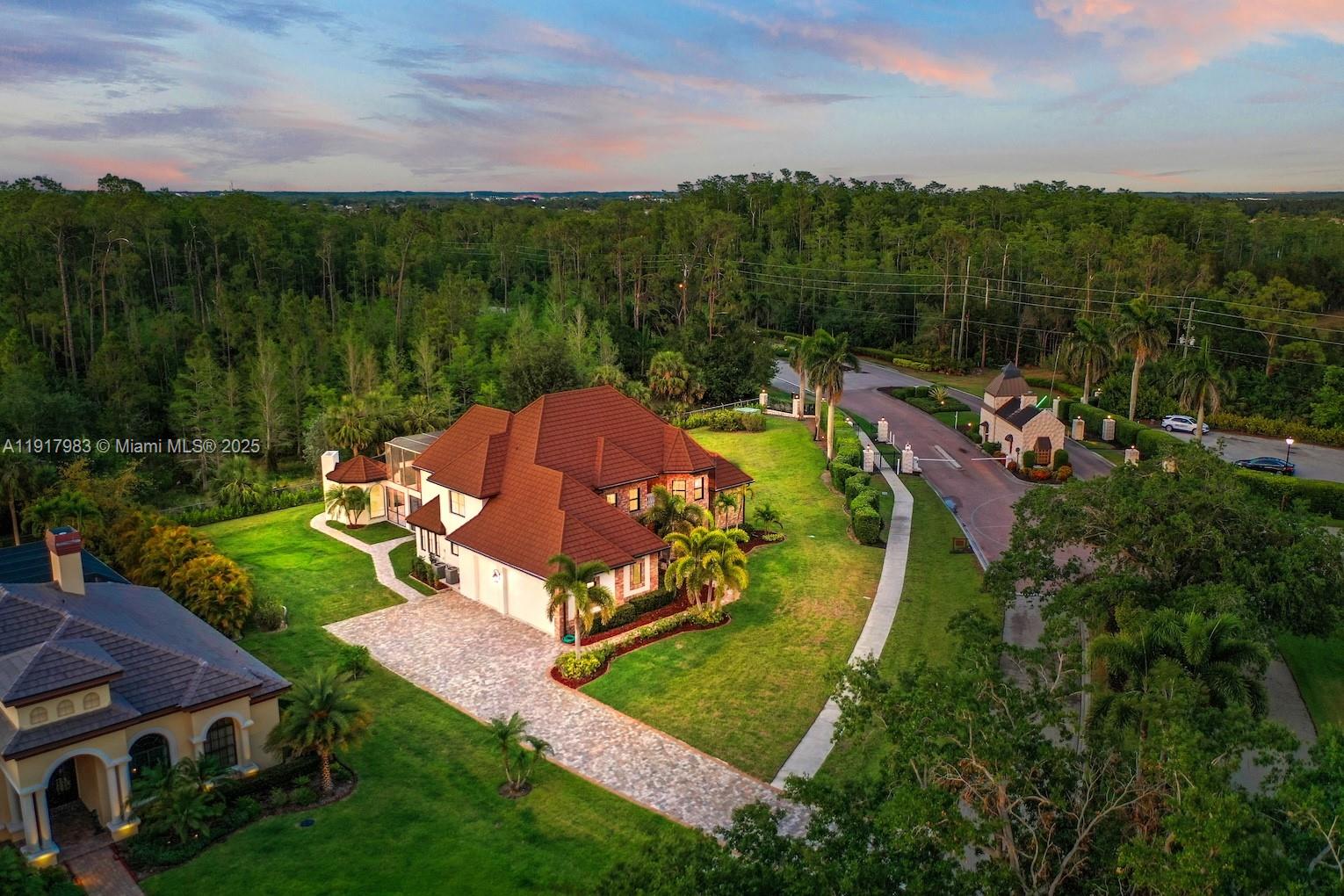 Discover this completely renovated Castle-style estate featuring 4 bedrooms, 4.5 baths, plus a spacious den, all nestled on an oversized premium lot. This extraordinary residence offers a seamless blend of luxury, comfort, and resort-style living with preserve views. The backyard is a true tropical oasis, showcasing a custom oversized pool with multiple waterfalls, a heated spa, and a beautifully designed outdoor kitchen and grill area—perfect for entertaining. An outdoor full bathroom provides added convenience for poolside gatherings. Inside, the home features tile and wood flooring throughout, a large open gourmet kitchen with high-end finishes, and a first-floor primary suite offering privacy and comfort. The architectural details and thoughtful layout create an inviting atmosphere with plenty of natural light. Additional highlights include a stone-coated metal roof, spacious living areas, and an oversized den ideal for an office, gym, or media room. This rare offering combines elegance, quality craftsmanship, and resort-style amenities—truly a one-of-a-kind property. Easy access to the gate and clubhouse. Mandatory equity membership fee of $115,000 due at closing.