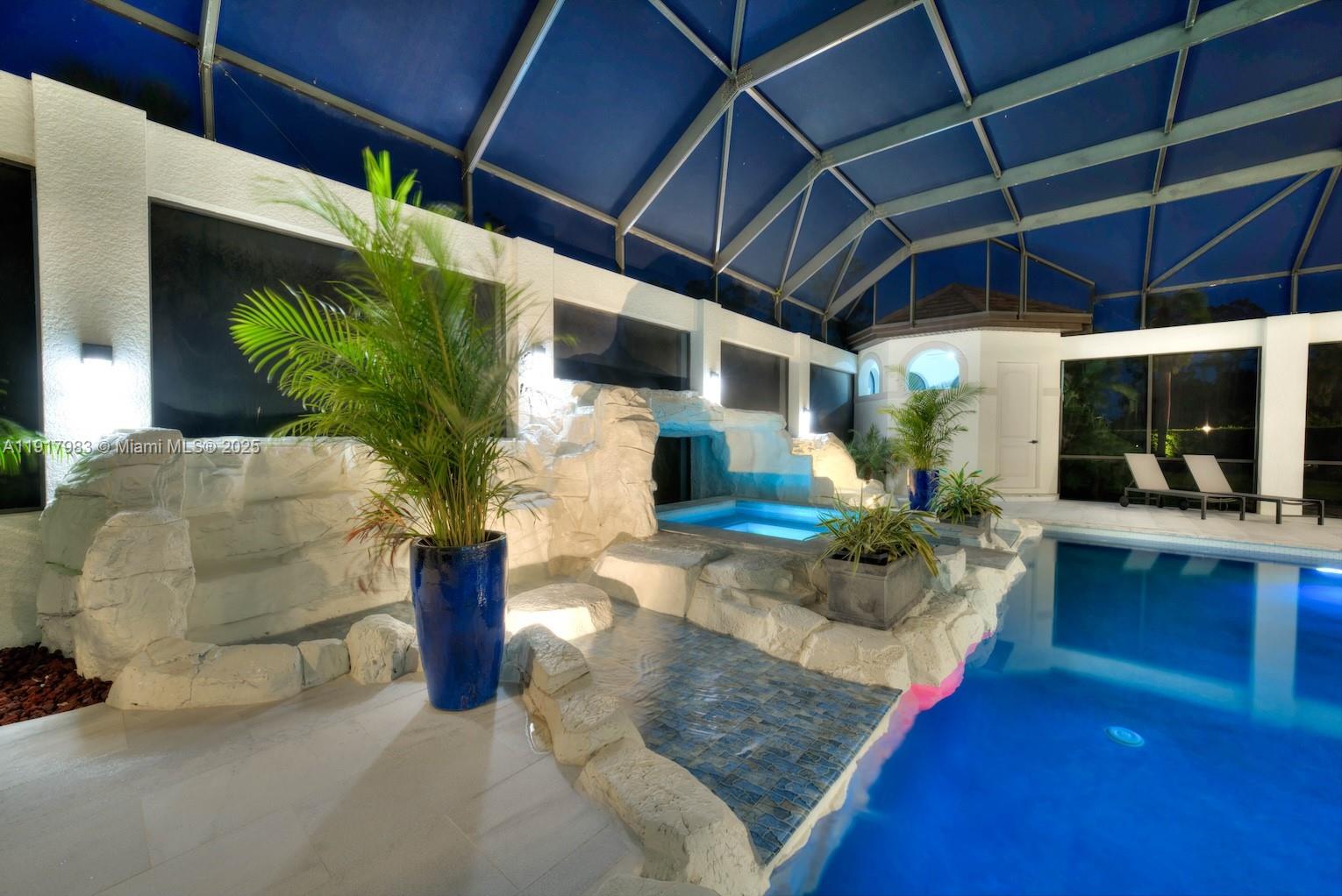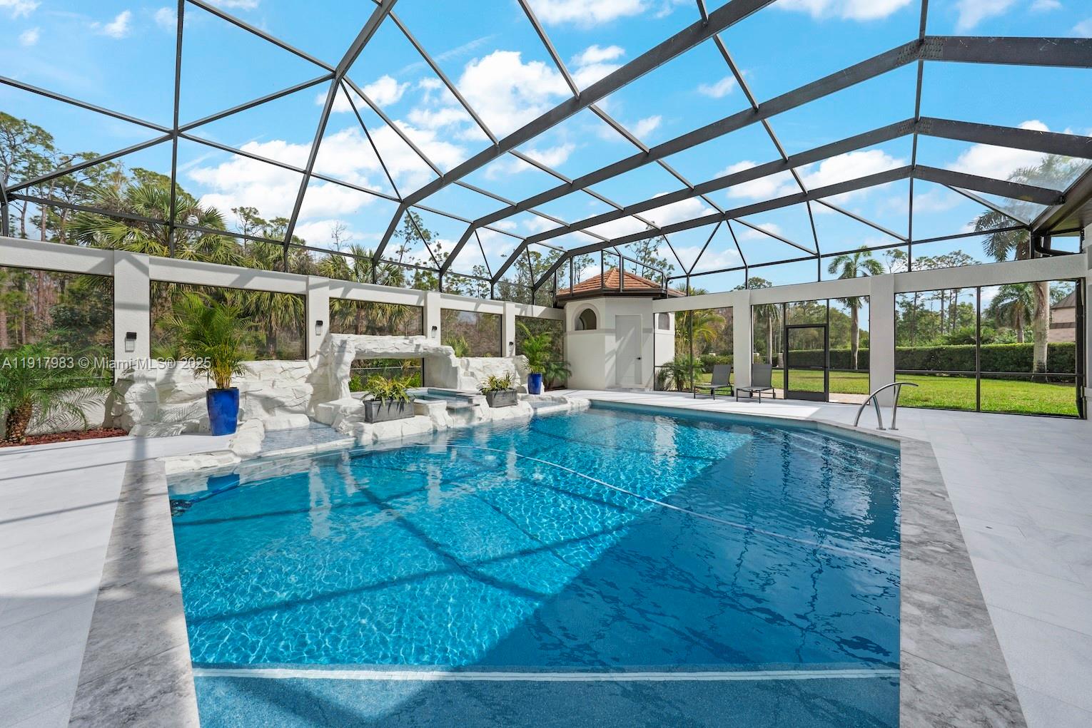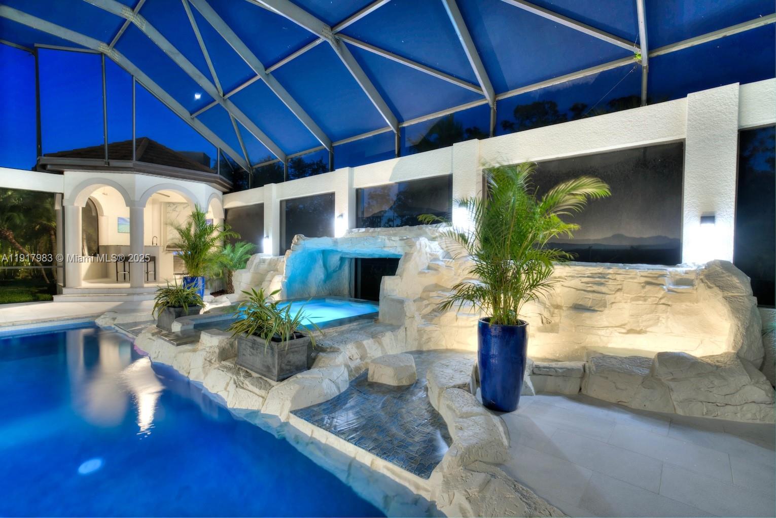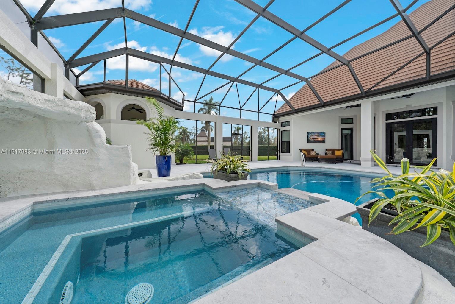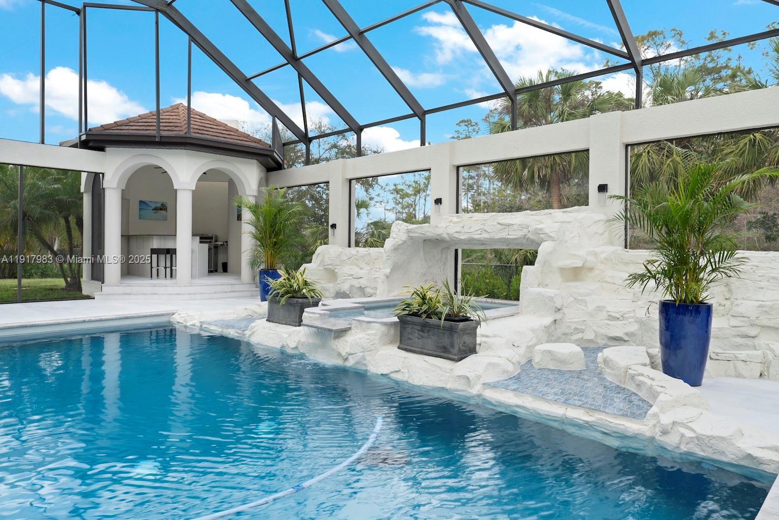 Discover this completely renovated Castle-style estate featuring 4 bedrooms, 4.5 baths, plus a spacious den, all nestled on an oversized premium lot. This extraordinary residence offers a seamless blend of luxury, comfort, and resort-style living with preserve views. The backyard is a true tropical oasis, showcasing a custom oversized pool with multiple waterfalls, a heated spa, and a beautifully designed outdoor kitchen and grill area—perfect for entertaining. An outdoor full bathroom provides added convenience for poolside gatherings. Inside, the home features tile and wood flooring throughout, a large open gourmet kitchen with high-end finishes, and a first-floor primary suite offering privacy and comfort. The architectural details and thoughtful layout create an inviting atmosphere with plenty of natural light. Additional highlights include a stone-coated metal roof, spacious living areas, and an oversized den ideal for an office, gym, or media room. This rare offering combines elegance, quality craftsmanship, and resort-style amenities—truly a one-of-a-kind property. Easy access to the gate and clubhouse. Mandatory equity membership fee of $115,000 due at closing.