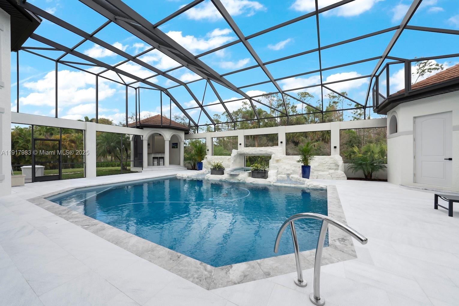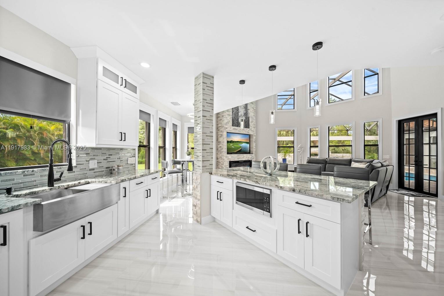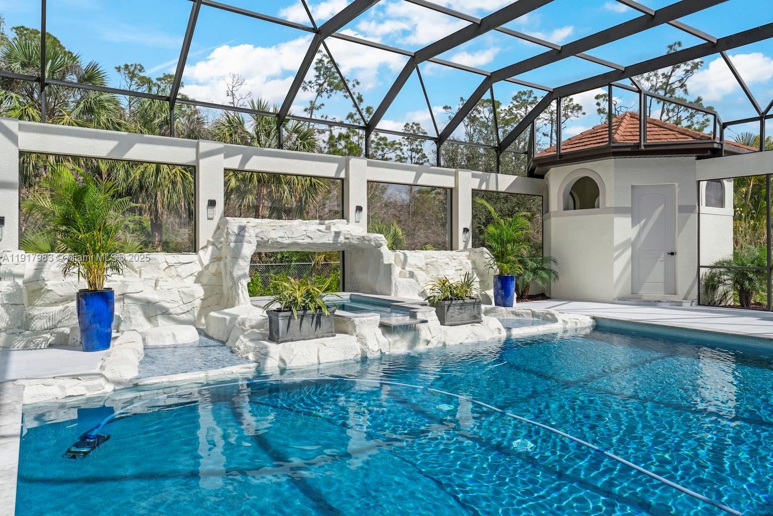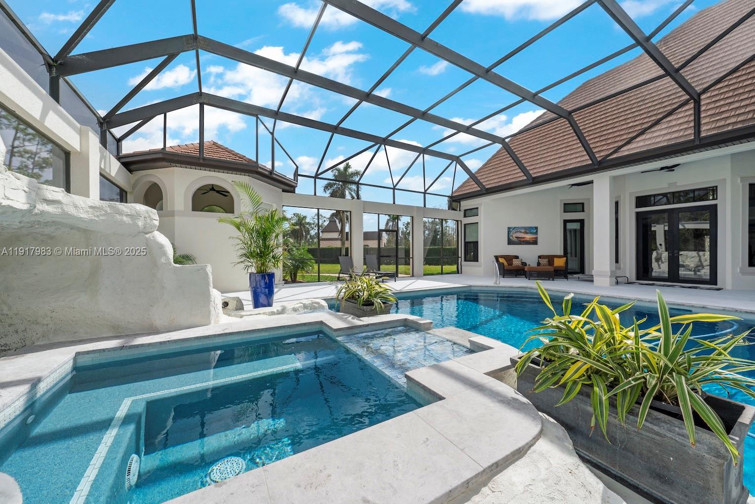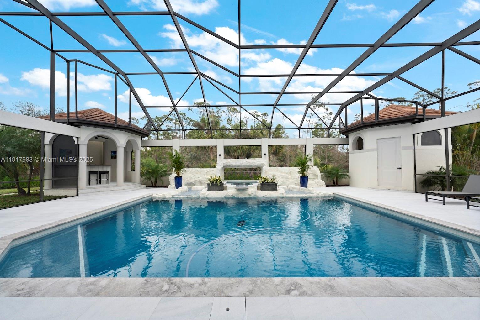 Discover this completely renovated Castle-style estate featuring 4 bedrooms, 4.5 baths, plus a spacious den, all nestled on an oversized premium lot. This extraordinary residence offers a seamless blend of luxury, comfort, and resort-style living with preserve views. The backyard is a true tropical oasis, showcasing a custom oversized pool with multiple waterfalls, a heated spa, and a beautifully designed outdoor kitchen and grill area—perfect for entertaining. An outdoor full bathroom provides added convenience for poolside gatherings. Inside, the home features tile and wood flooring throughout, a large open gourmet kitchen with high-end finishes, and a first-floor primary suite offering privacy and comfort. The architectural details and thoughtful layout create an inviting atmosphere with plenty of natural light. Additional highlights include a stone-coated metal roof, spacious living areas, and an oversized den ideal for an office, gym, or media room. This rare offering combines elegance, quality craftsmanship, and resort-style amenities—truly a one-of-a-kind property. Easy access to the gate and clubhouse. Mandatory equity membership fee of $115,000 due at closing.