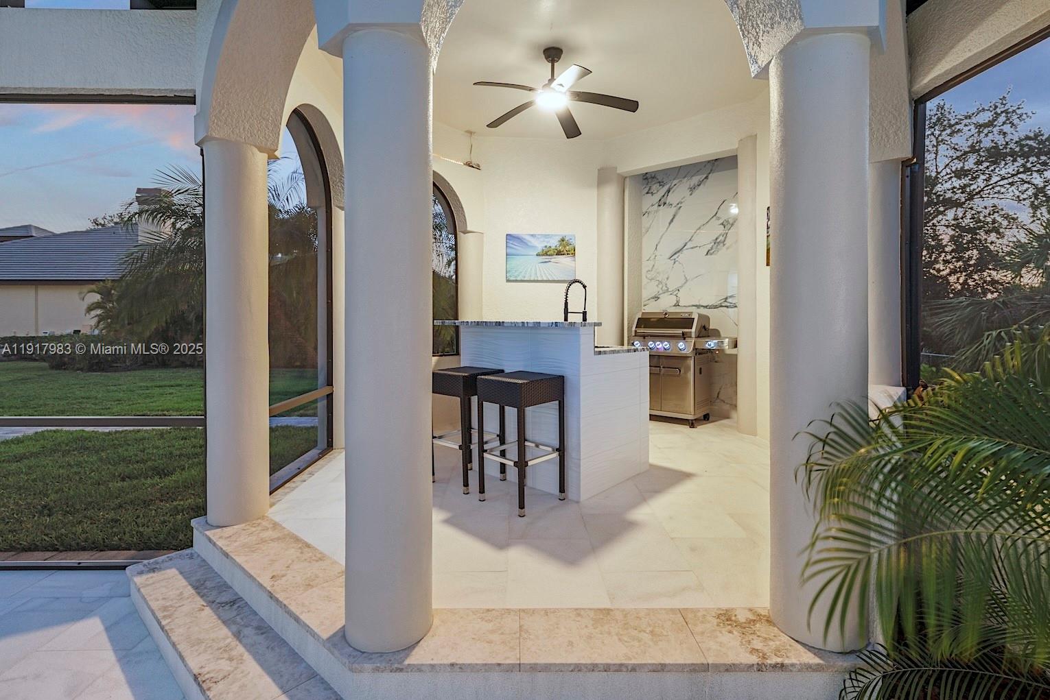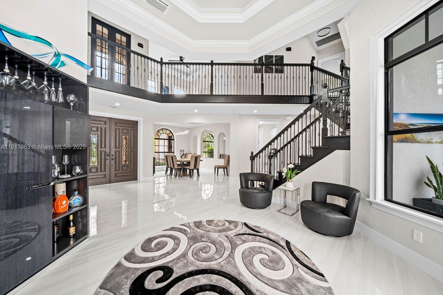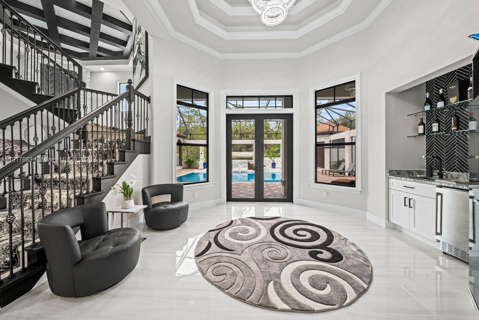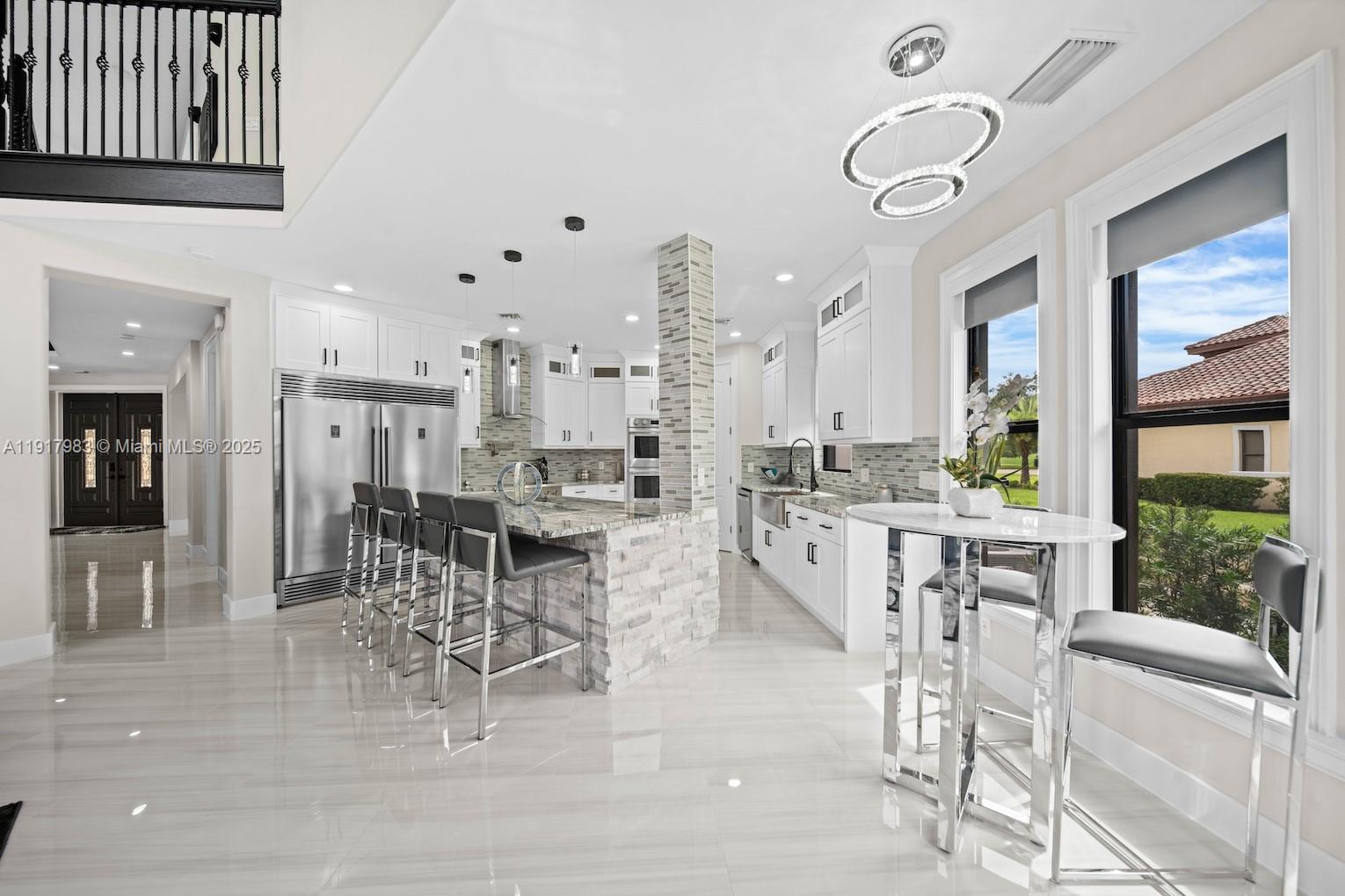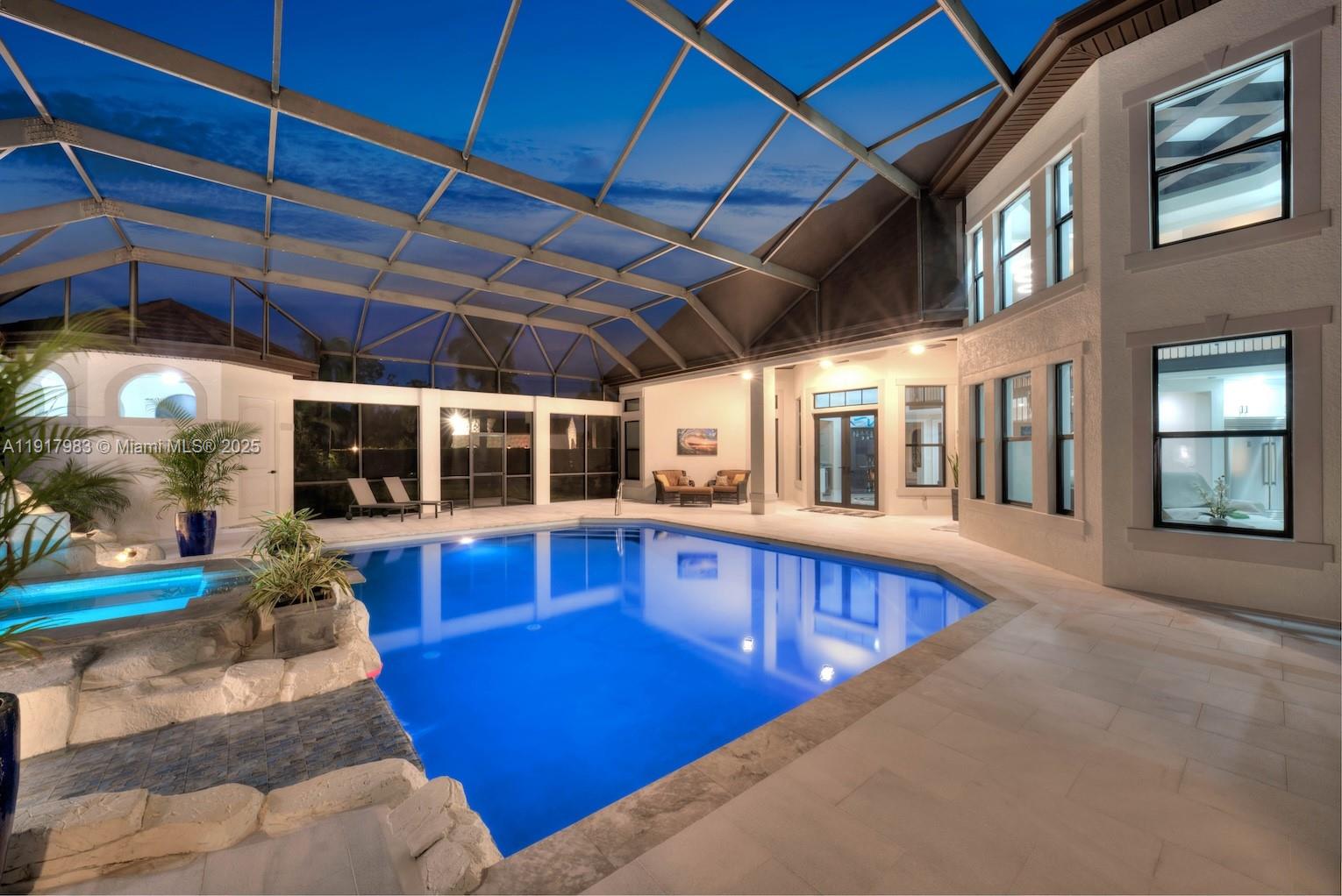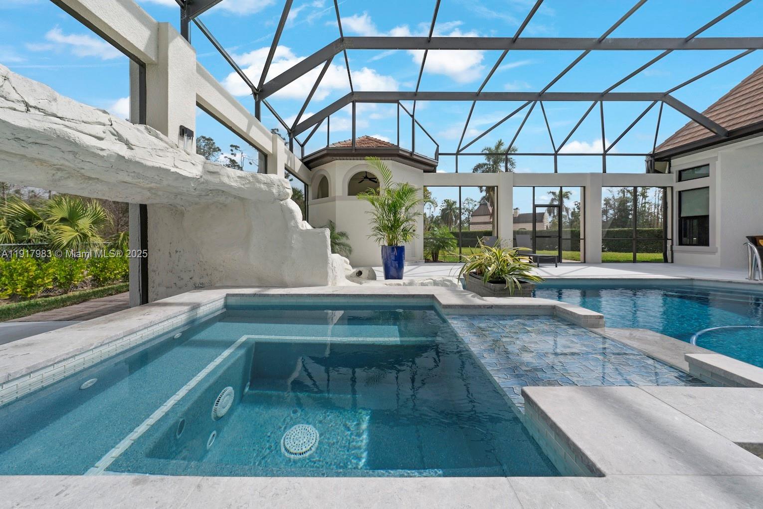 Discover this completely renovated Castle-style estate featuring 4 bedrooms, 4.5 baths, plus a spacious den, all nestled on an oversized premium lot. This extraordinary residence offers a seamless blend of luxury, comfort, and resort-style living with preserve views. The backyard is a true tropical oasis, showcasing a custom oversized pool with multiple waterfalls, a heated spa, and a beautifully designed outdoor kitchen and grill area—perfect for entertaining. An outdoor full bathroom provides added convenience for poolside gatherings. Inside, the home features tile and wood flooring throughout, a large open gourmet kitchen with high-end finishes, and a first-floor primary suite offering privacy and comfort. The architectural details and thoughtful layout create an inviting atmosphere with plenty of natural light. Additional highlights include a stone-coated metal roof, spacious living areas, and an oversized den ideal for an office, gym, or media room. This rare offering combines elegance, quality craftsmanship, and resort-style amenities—truly a one-of-a-kind property. Easy access to the gate and clubhouse. Mandatory equity membership fee of $115,000 due at closing.