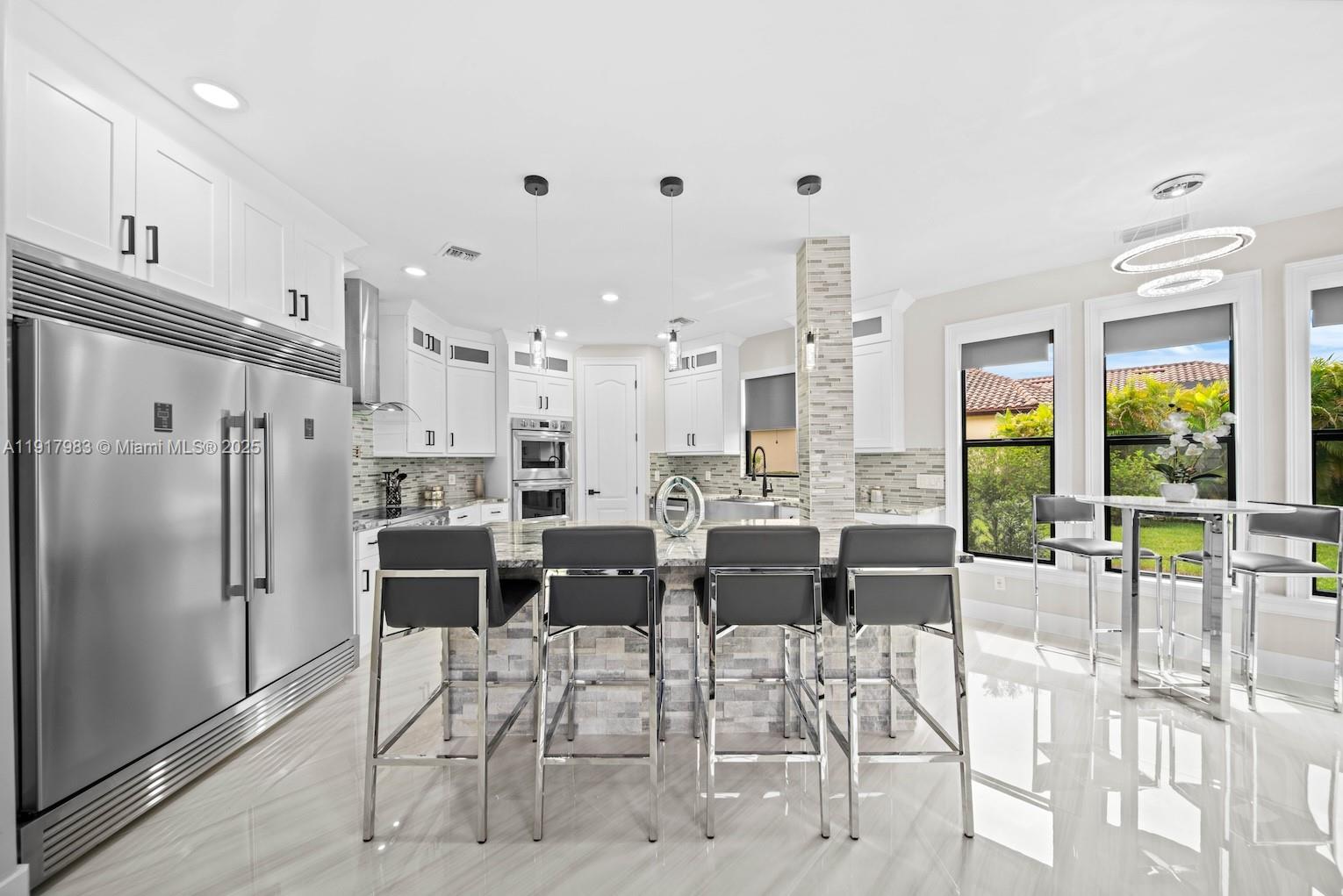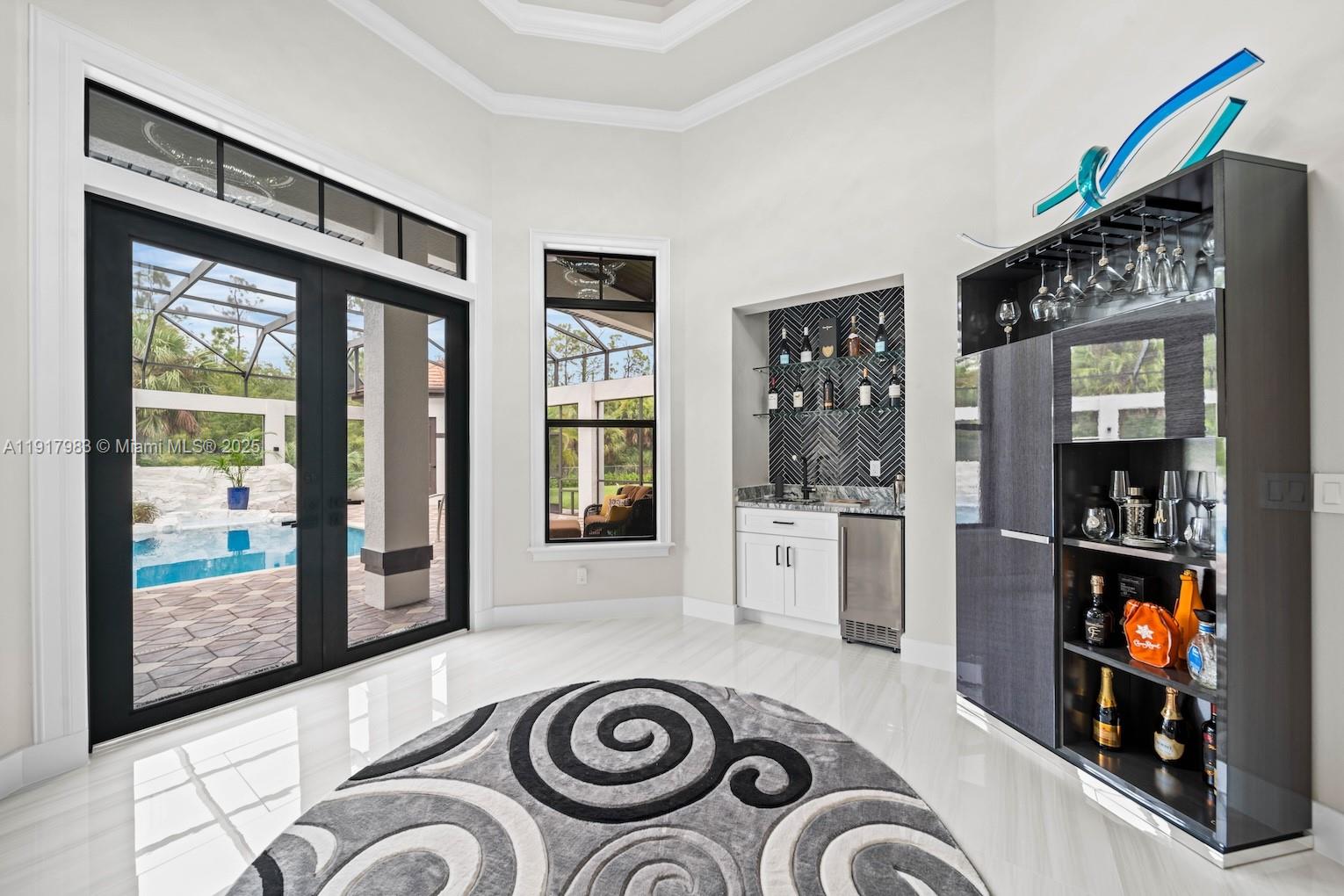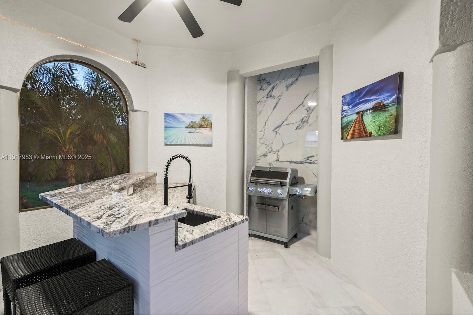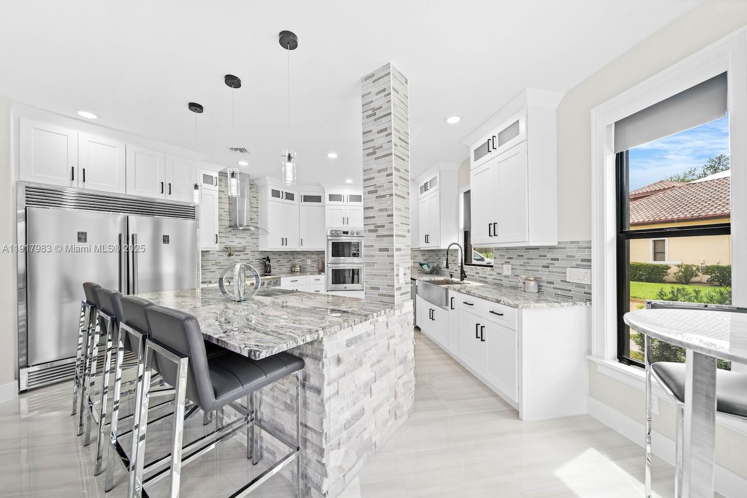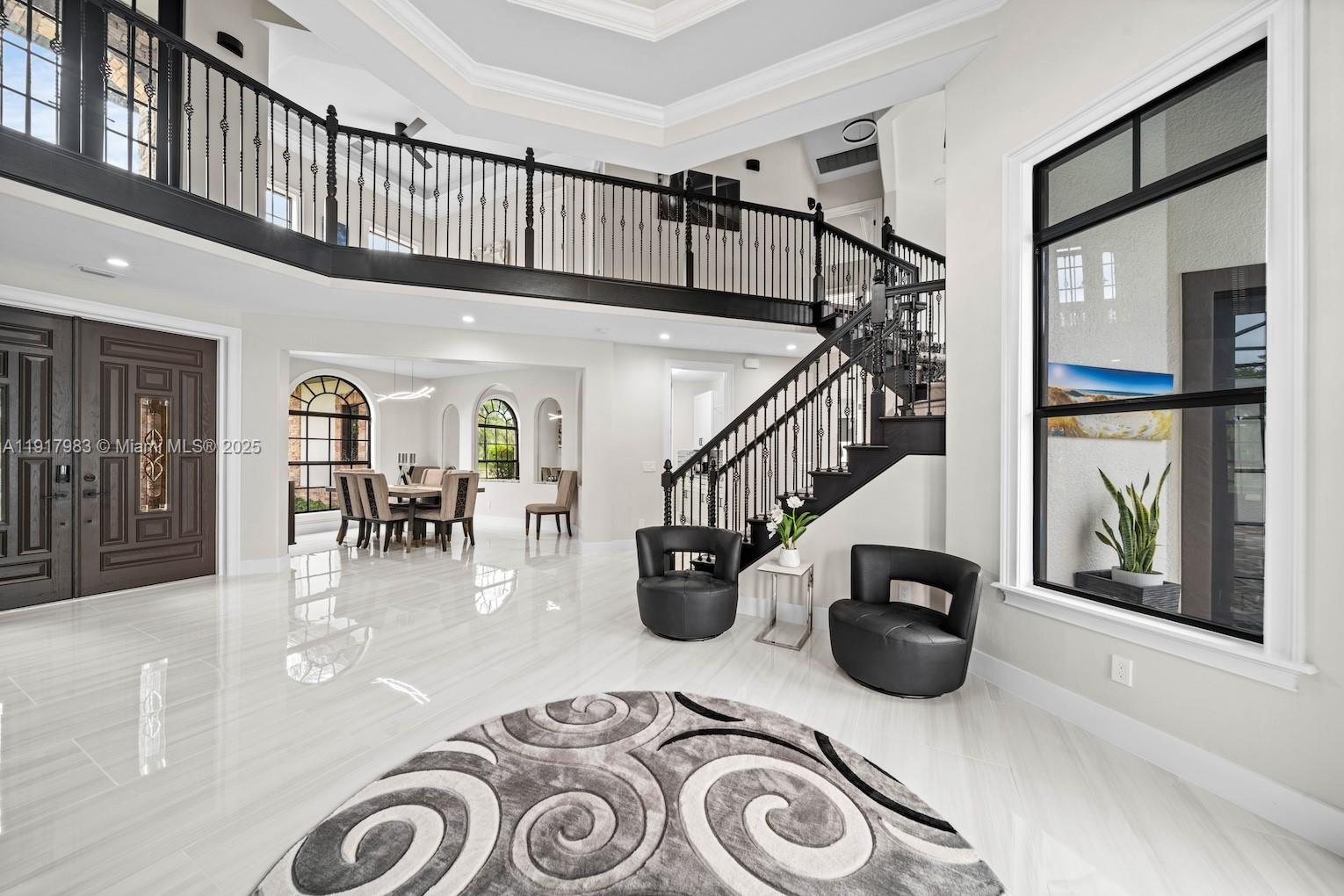 Discover this completely renovated Castle-style estate featuring 4 bedrooms, 4.5 baths, plus a spacious den, all nestled on an oversized premium lot. This extraordinary residence offers a seamless blend of luxury, comfort, and resort-style living with preserve views. The backyard is a true tropical oasis, showcasing a custom oversized pool with multiple waterfalls, a heated spa, and a beautifully designed outdoor kitchen and grill area—perfect for entertaining. An outdoor full bathroom provides added convenience for poolside gatherings. Inside, the home features tile and wood flooring throughout, a large open gourmet kitchen with high-end finishes, and a first-floor primary suite offering privacy and comfort. The architectural details and thoughtful layout create an inviting atmosphere with plenty of natural light. Additional highlights include a stone-coated metal roof, spacious living areas, and an oversized den ideal for an office, gym, or media room. This rare offering combines elegance, quality craftsmanship, and resort-style amenities—truly a one-of-a-kind property. Easy access to the gate and clubhouse. Mandatory equity membership fee of $115,000 due at closing.