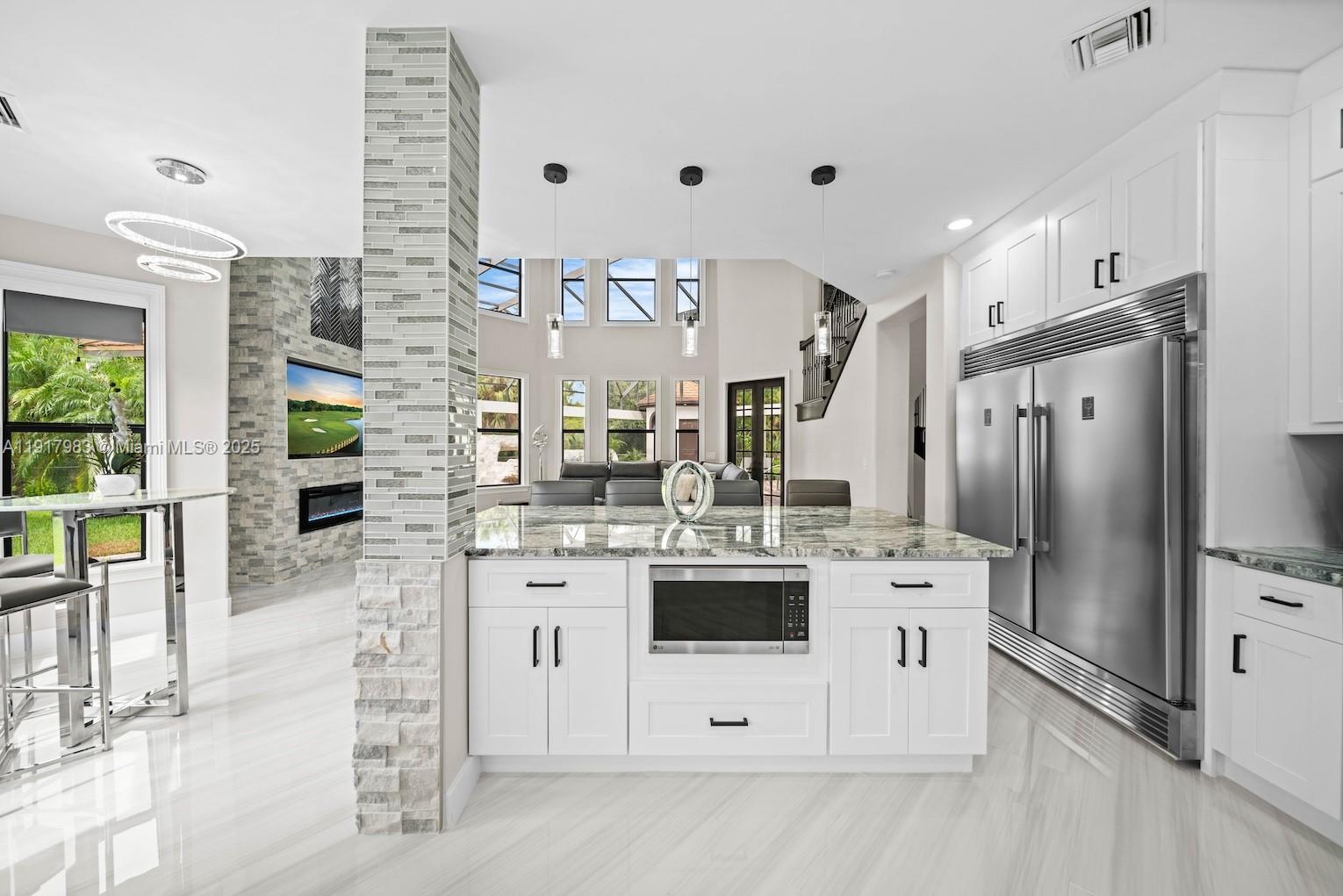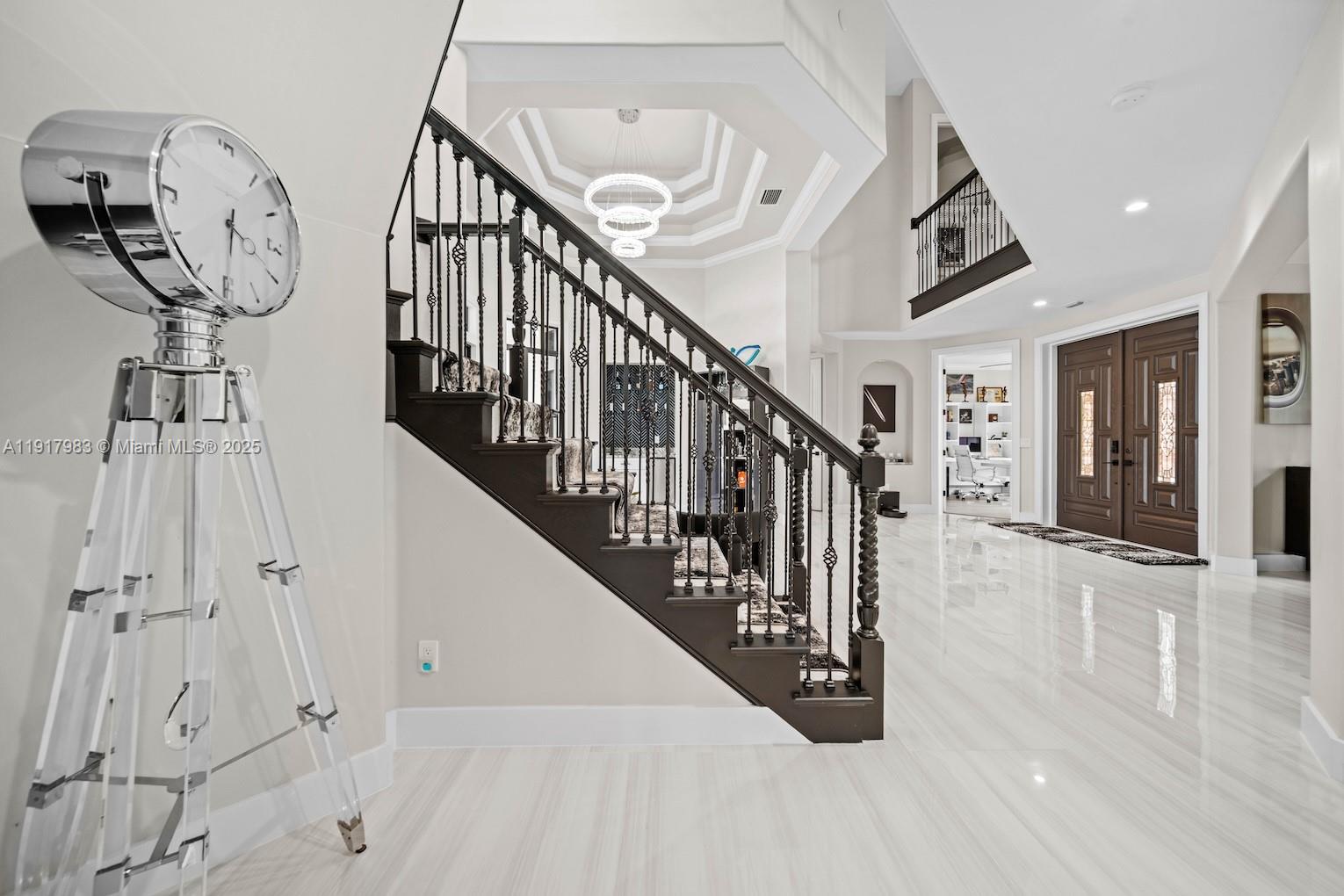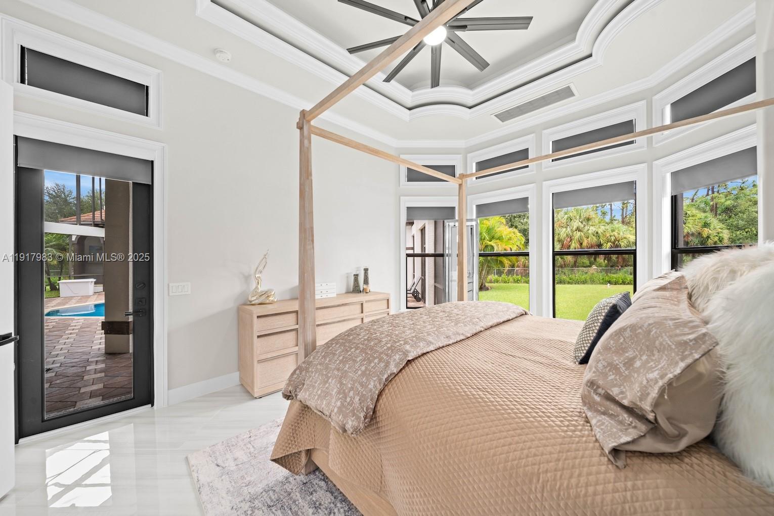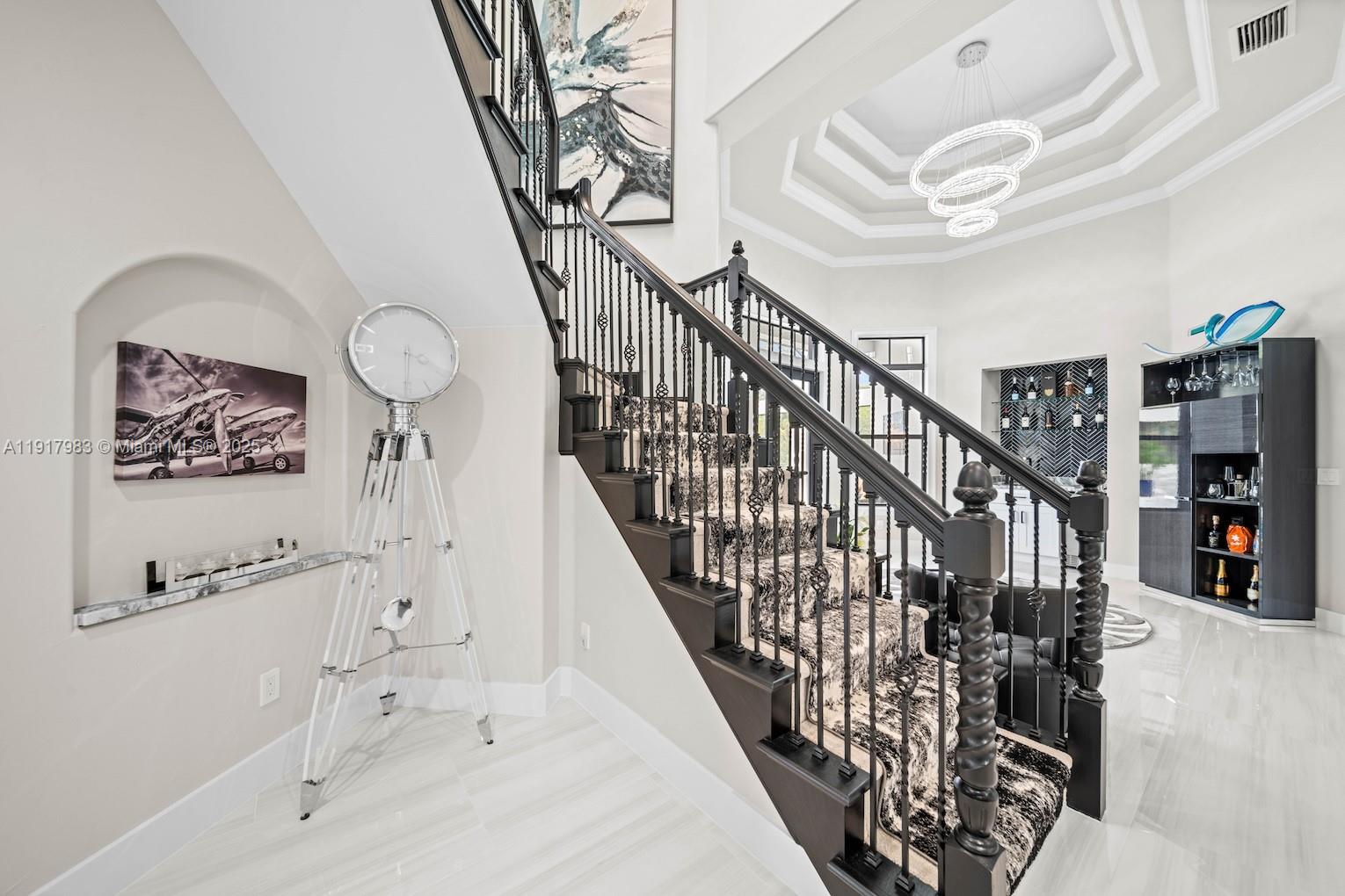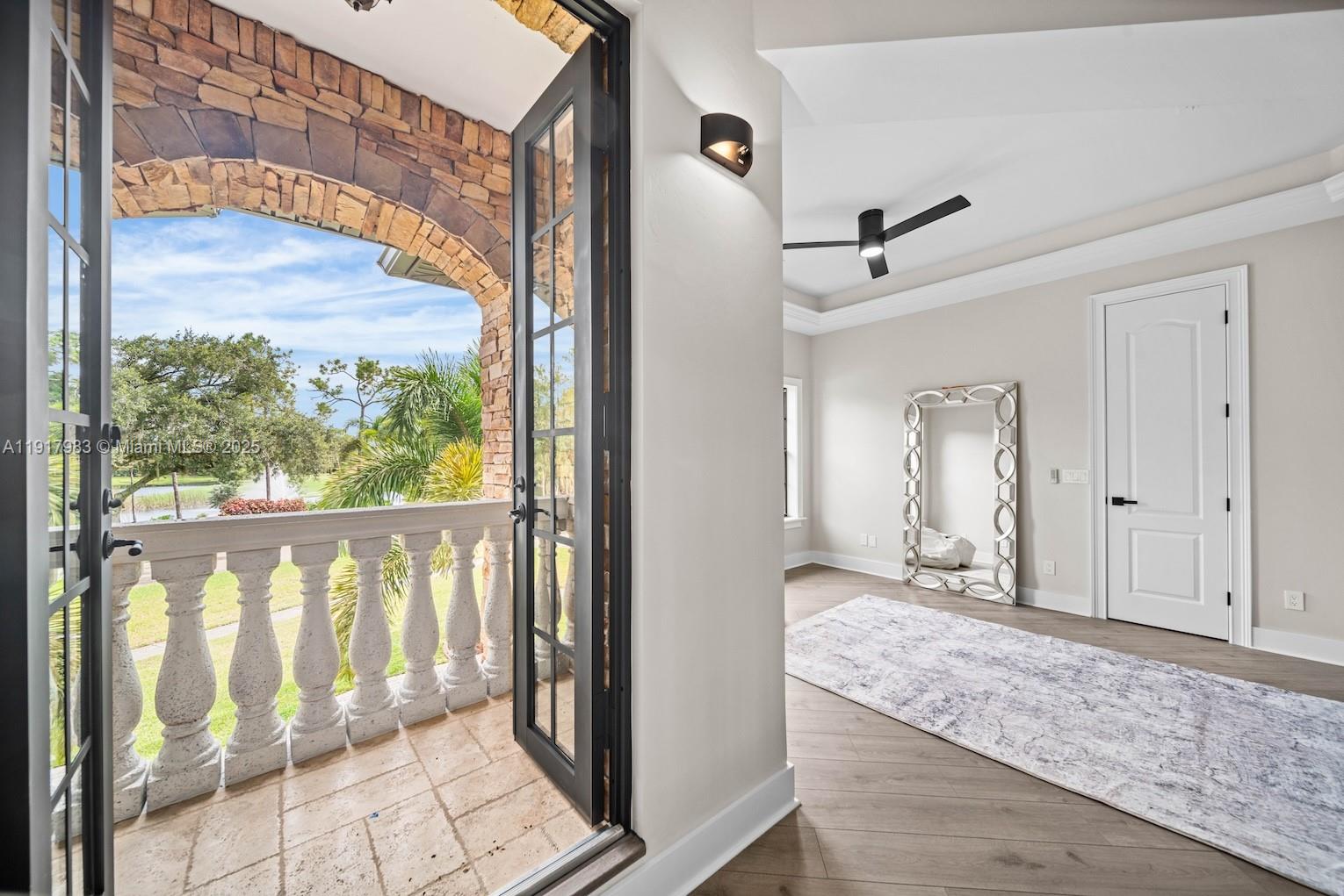 Discover this completely renovated Castle-style estate featuring 4 bedrooms, 4.5 baths, plus a spacious den, all nestled on an oversized premium lot. This extraordinary residence offers a seamless blend of luxury, comfort, and resort-style living with preserve views. The backyard is a true tropical oasis, showcasing a custom oversized pool with multiple waterfalls, a heated spa, and a beautifully designed outdoor kitchen and grill area—perfect for entertaining. An outdoor full bathroom provides added convenience for poolside gatherings. Inside, the home features tile and wood flooring throughout, a large open gourmet kitchen with high-end finishes, and a first-floor primary suite offering privacy and comfort. The architectural details and thoughtful layout create an inviting atmosphere with plenty of natural light. Additional highlights include a stone-coated metal roof, spacious living areas, and an oversized den ideal for an office, gym, or media room. This rare offering combines elegance, quality craftsmanship, and resort-style amenities—truly a one-of-a-kind property. Easy access to the gate and clubhouse. Mandatory equity membership fee of $115,000 due at closing.