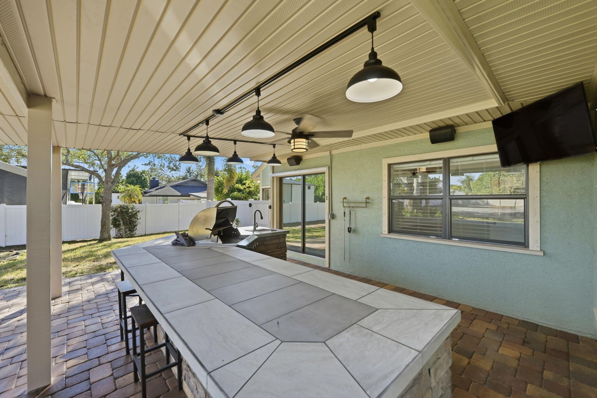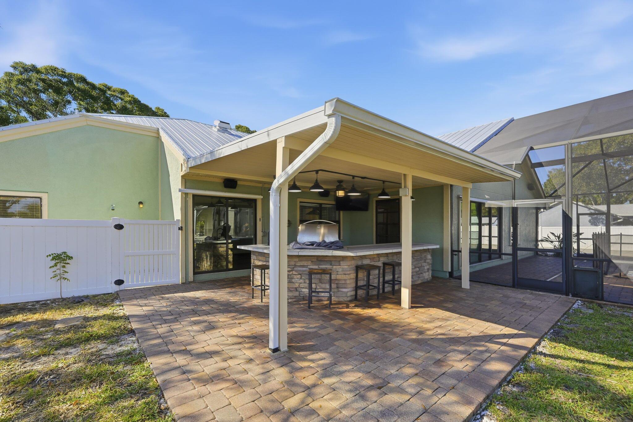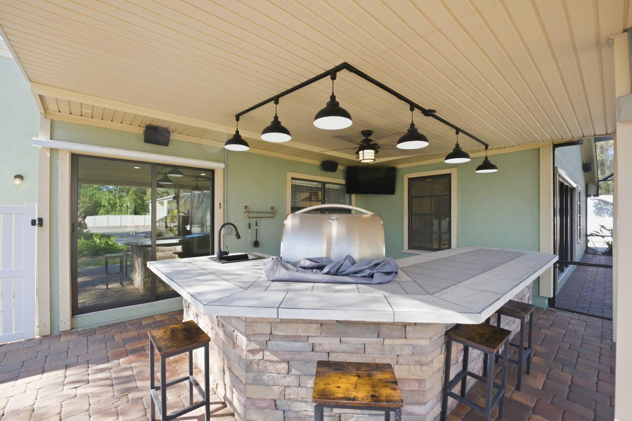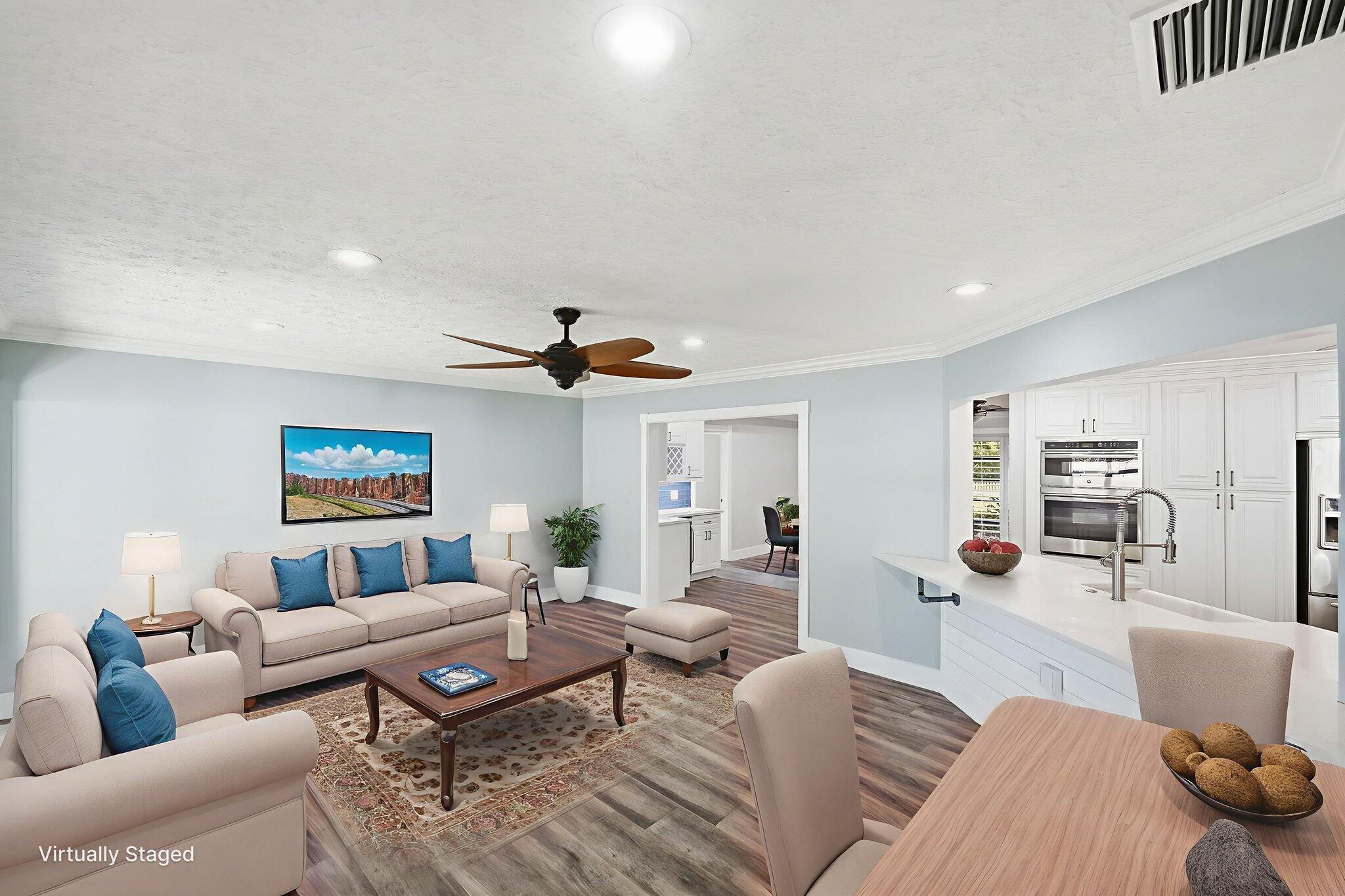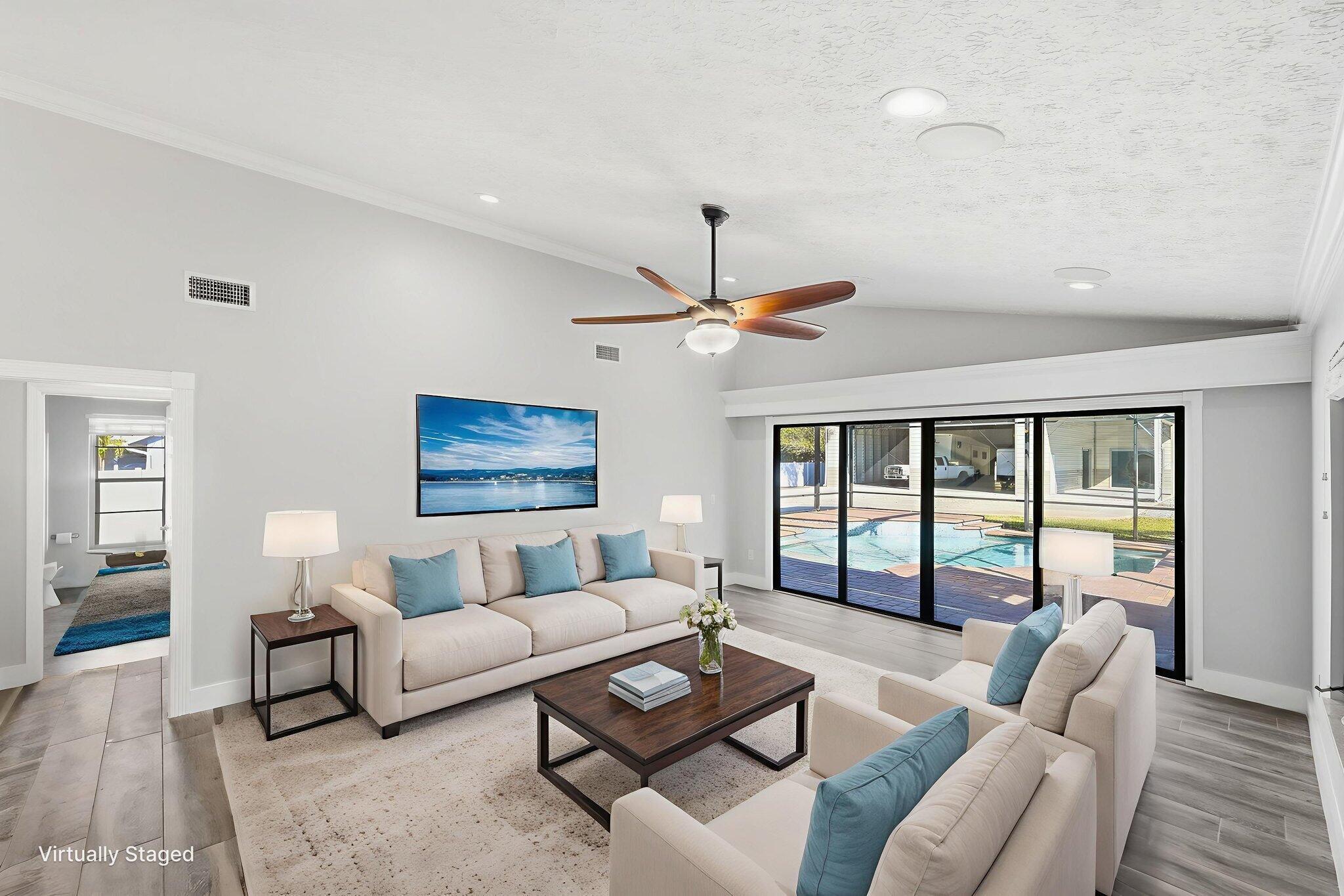 Located on 0.91 acres, this well-maintained home features numerous updates and versatile living spaces. Interior features include 3 bedrooms, 2 full baths, a primary suite with soaking tub and separate shower, a separate living room, open family room, and flexible dining/bonus room. The kitchen offers an induction cooktop, soft-close cabinetry, quartz countertops, a ceramic farm sink, and updated appliances. A bar area with wine storage and a separate laundry room add convenience for entertaining. Fresh paint, crown molding, canned lighting, and integrated sound complete the interior. Exterior highlights include a newer roof and gutters (2022), dual AC, fully fenced yard with electric gate, and a covered summer kitchen updated in 2025 with grill, sink, fridge, and pavers. The heated
