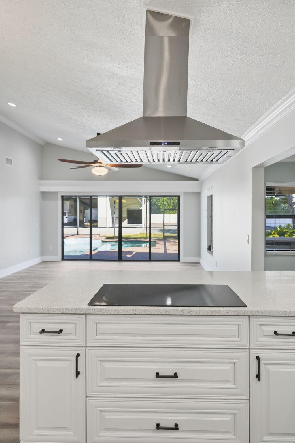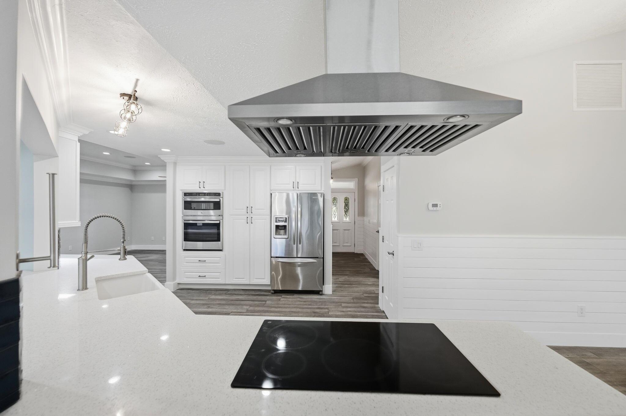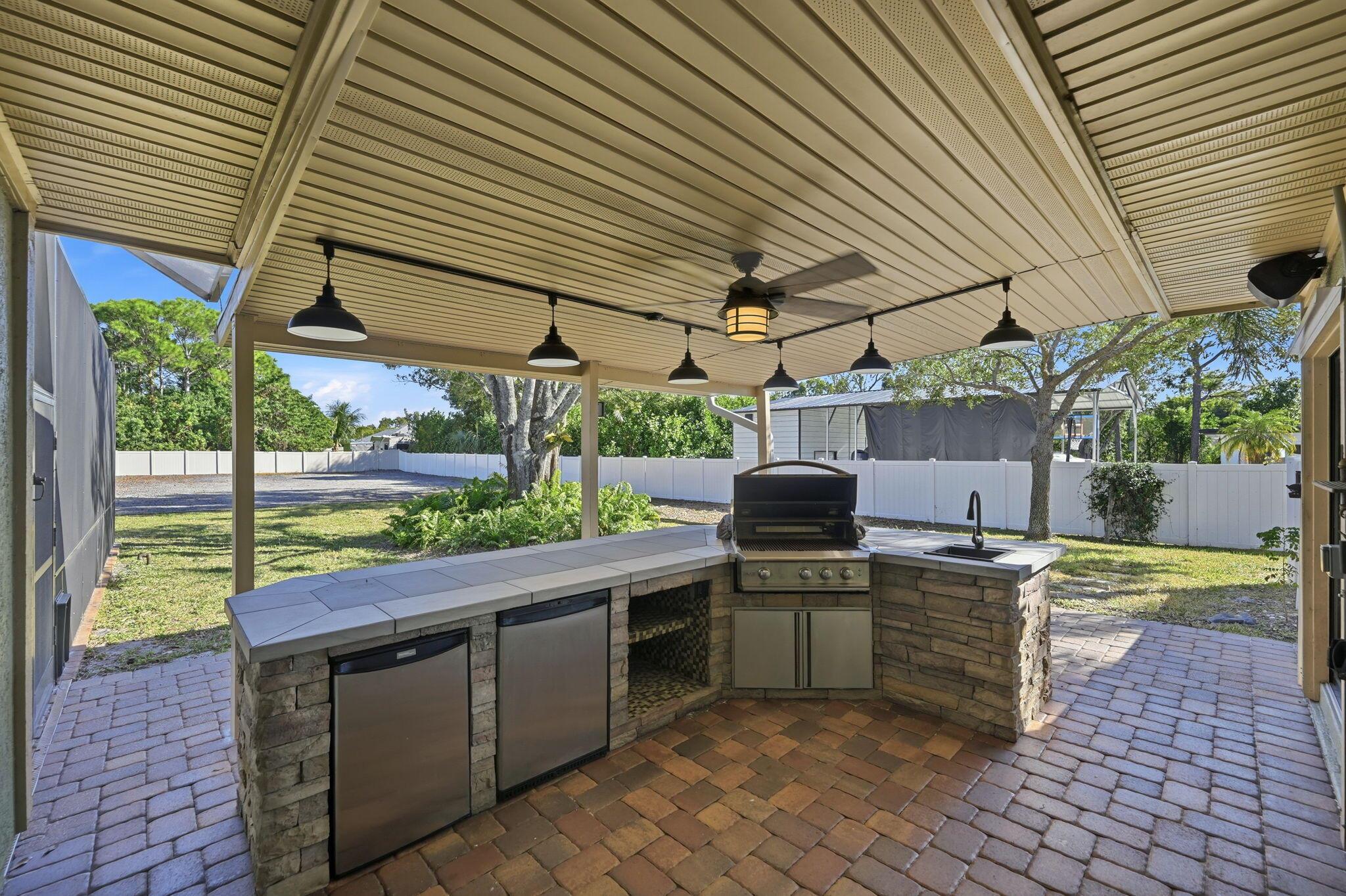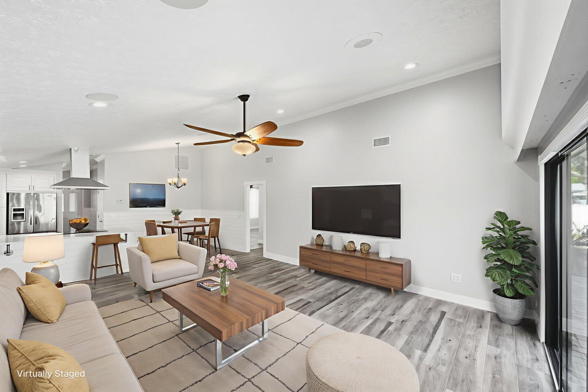 Located on 0.91 acres, this well-maintained home features numerous updates and versatile living spaces. Interior features include 3 bedrooms, 2 full baths, a primary suite with soaking tub and separate shower, a separate living room, open family room, and flexible dining/bonus room. The kitchen offers an induction cooktop, soft-close cabinetry, quartz countertops, a ceramic farm sink, and updated appliances. A bar area with wine storage and a separate laundry room add convenience for entertaining. Fresh paint, crown molding, canned lighting, and integrated sound complete the interior. Exterior highlights include a newer roof and gutters (2022), dual AC, fully fenced yard with electric gate, and a covered summer kitchen updated in 2025 with grill, sink, fridge, and pavers. The heated