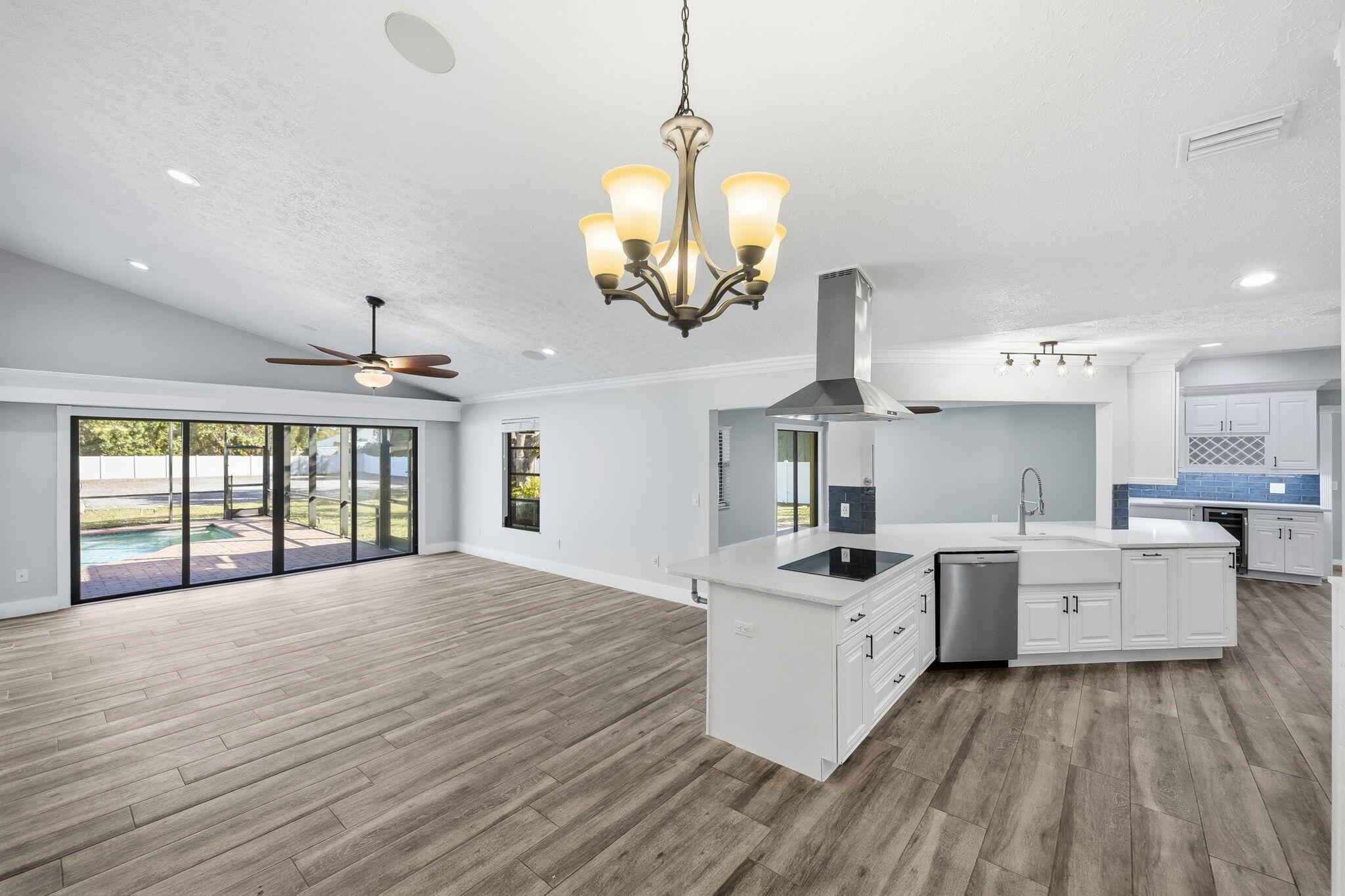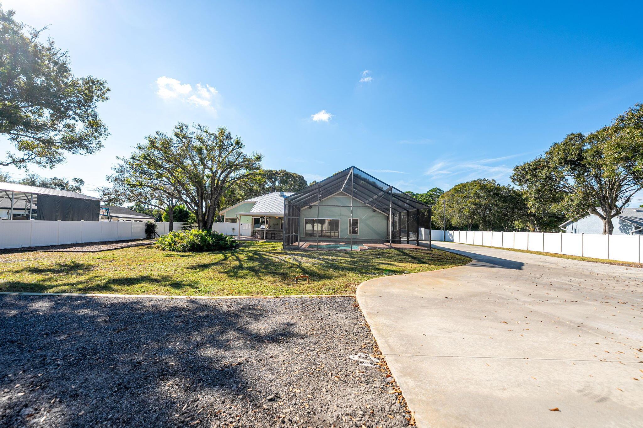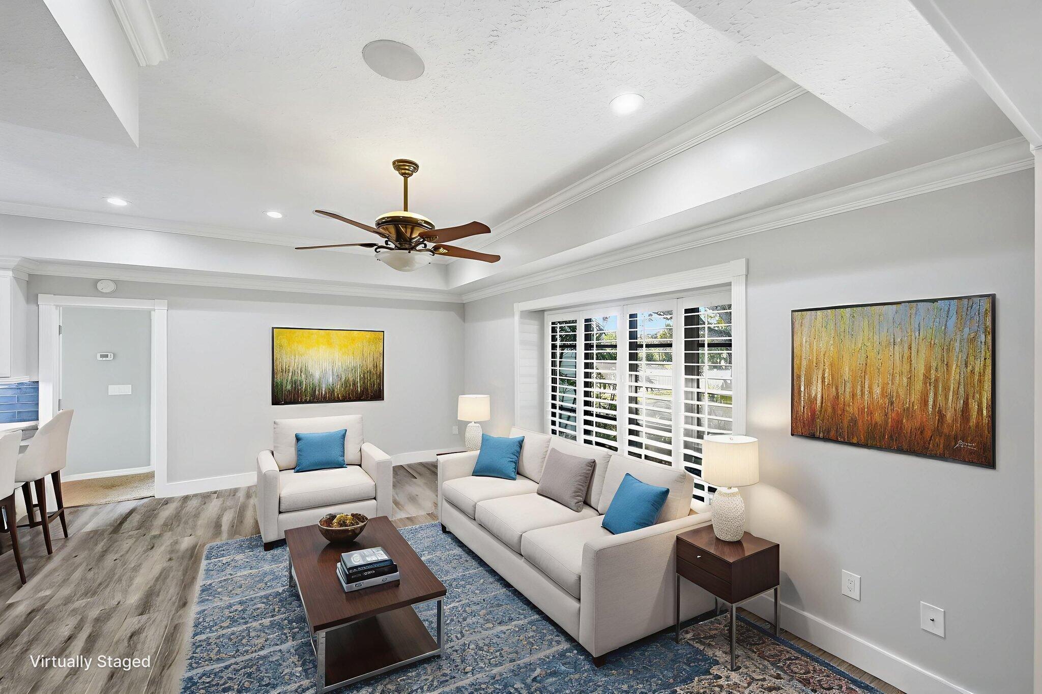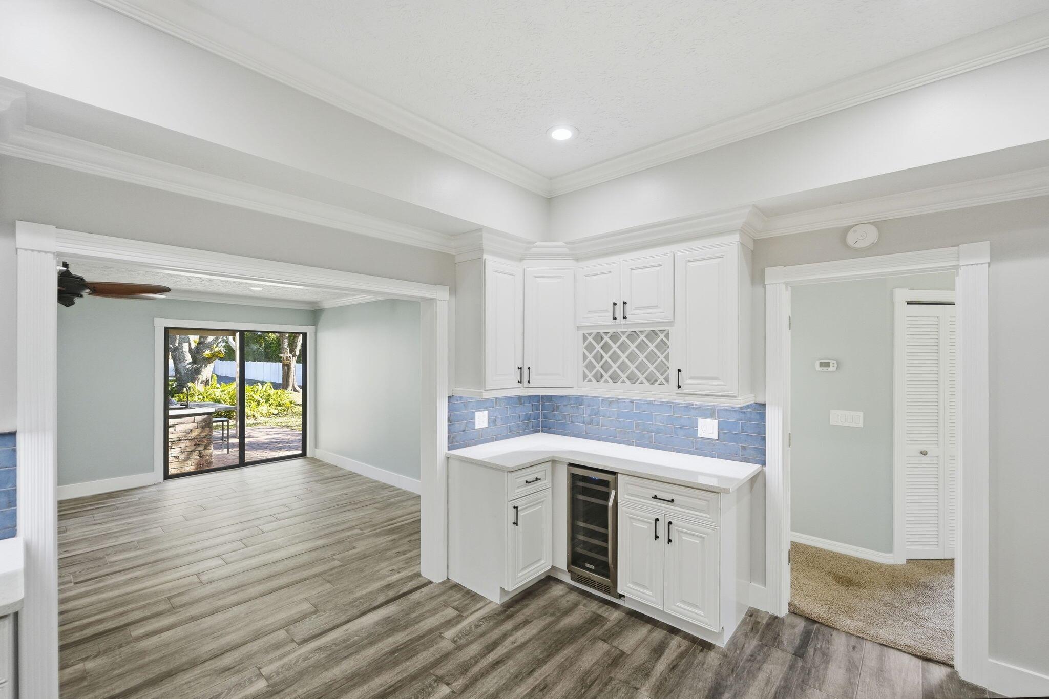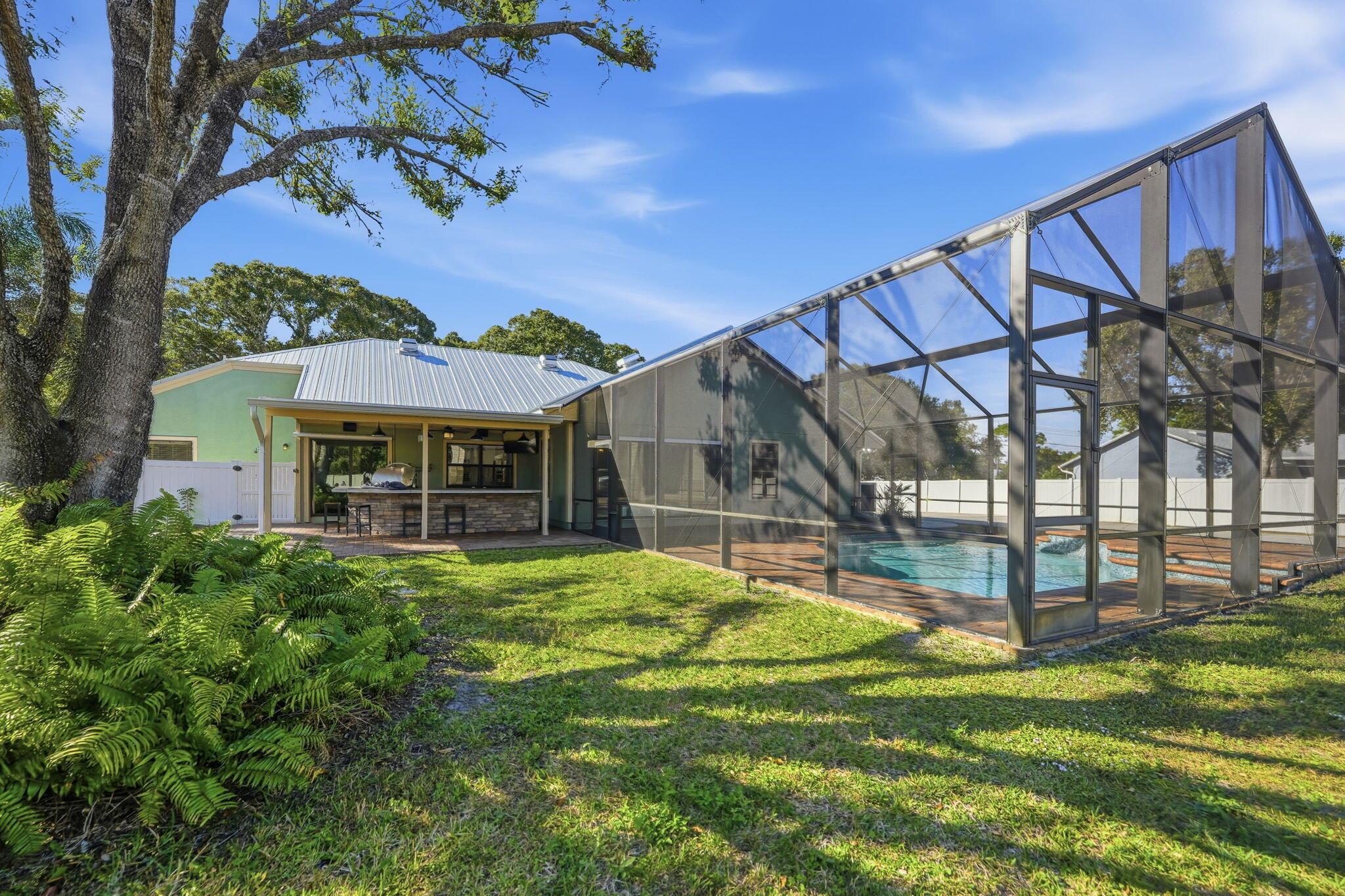Located on 0.91 acres, this well-maintained home features numerous updates and versatile living spaces. Interior features include 3 bedrooms, 2 full baths, a primary suite with soaking tub and separate shower, a separate living room, open family room, and flexible dining/bonus room. The kitchen offers an induction cooktop, soft-close cabinetry, quartz countertops, a ceramic farm sink, and updated appliances. A bar area with wine storage and a separate laundry room add convenience for entertaining. Fresh paint, crown molding, canned lighting, and integrated sound complete the interior. Exterior highlights include a newer roof and gutters (2022), dual AC, fully fenced yard with electric gate, and a covered summer kitchen updated in 2025 with grill, sink, fridge, and pavers. The heated