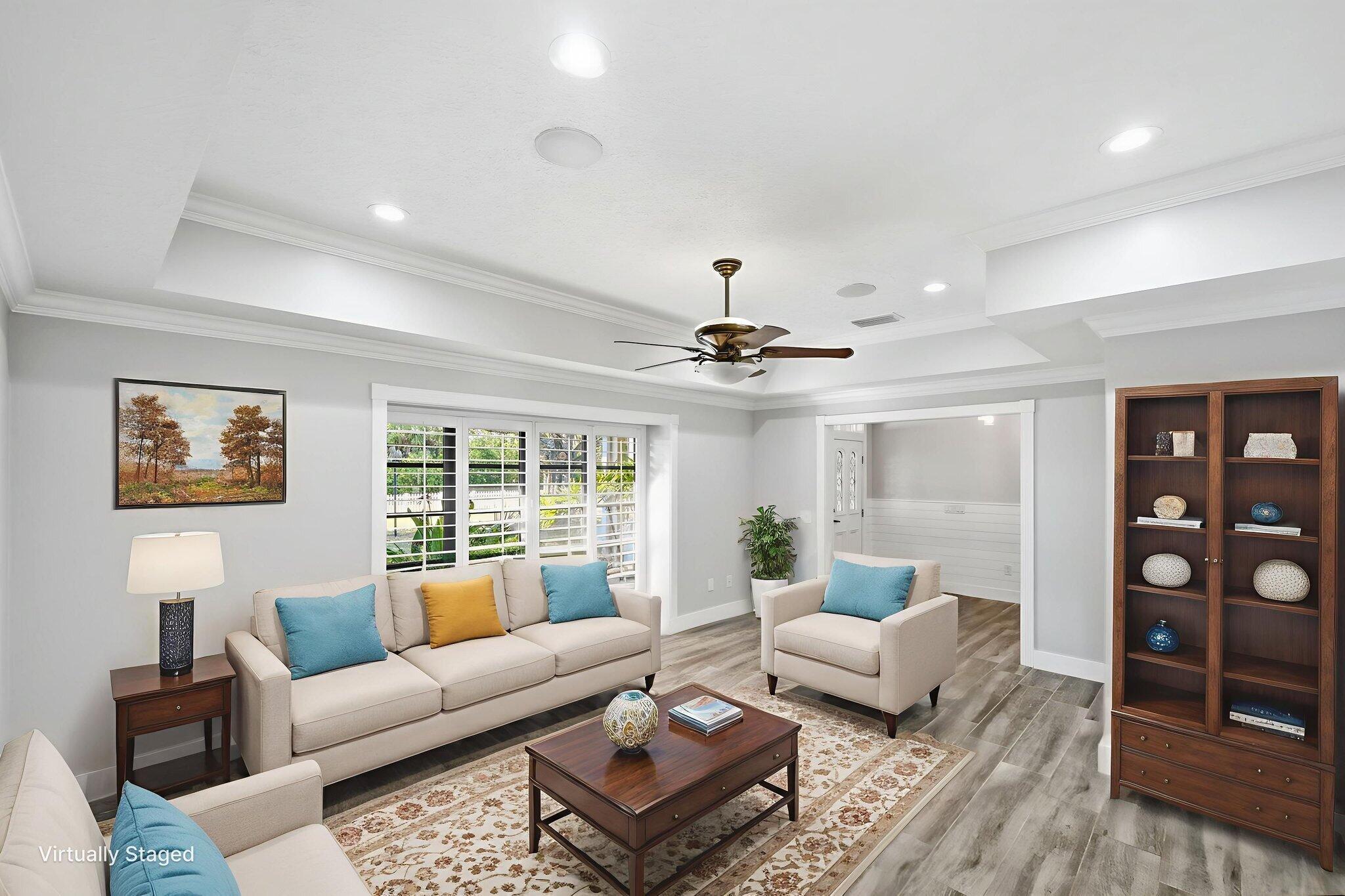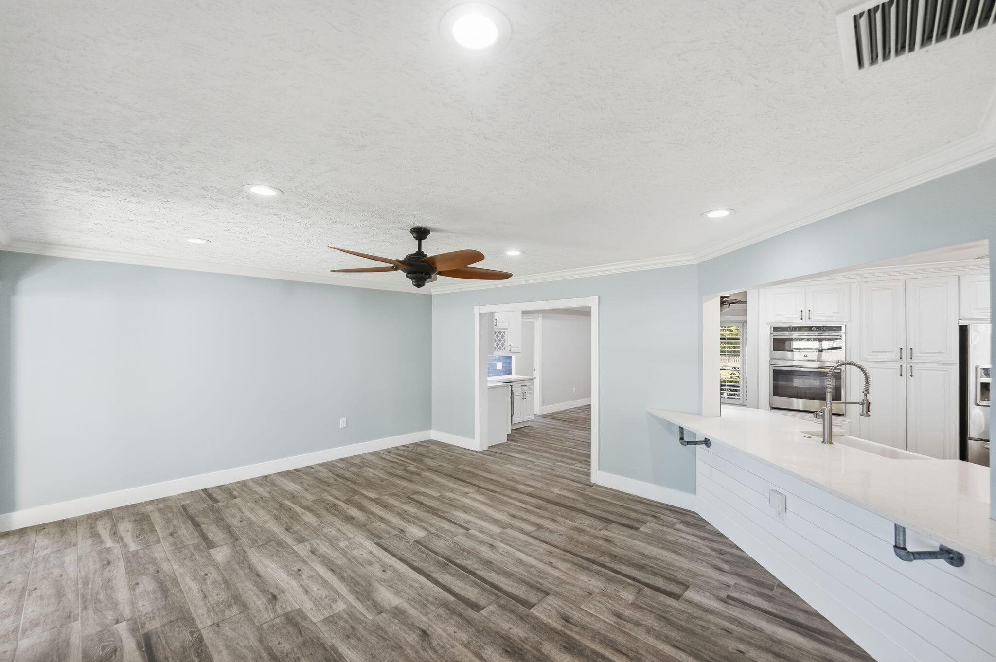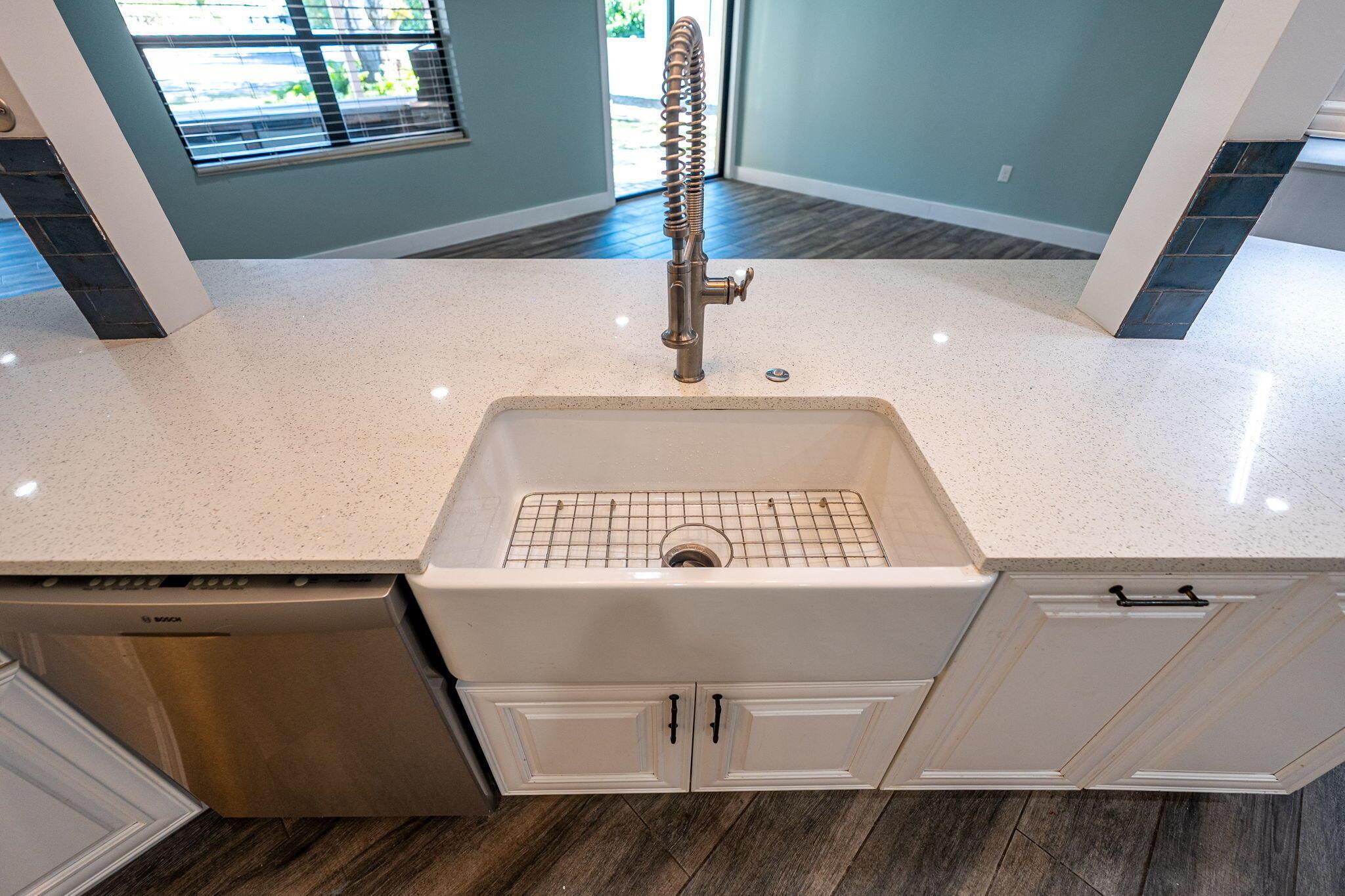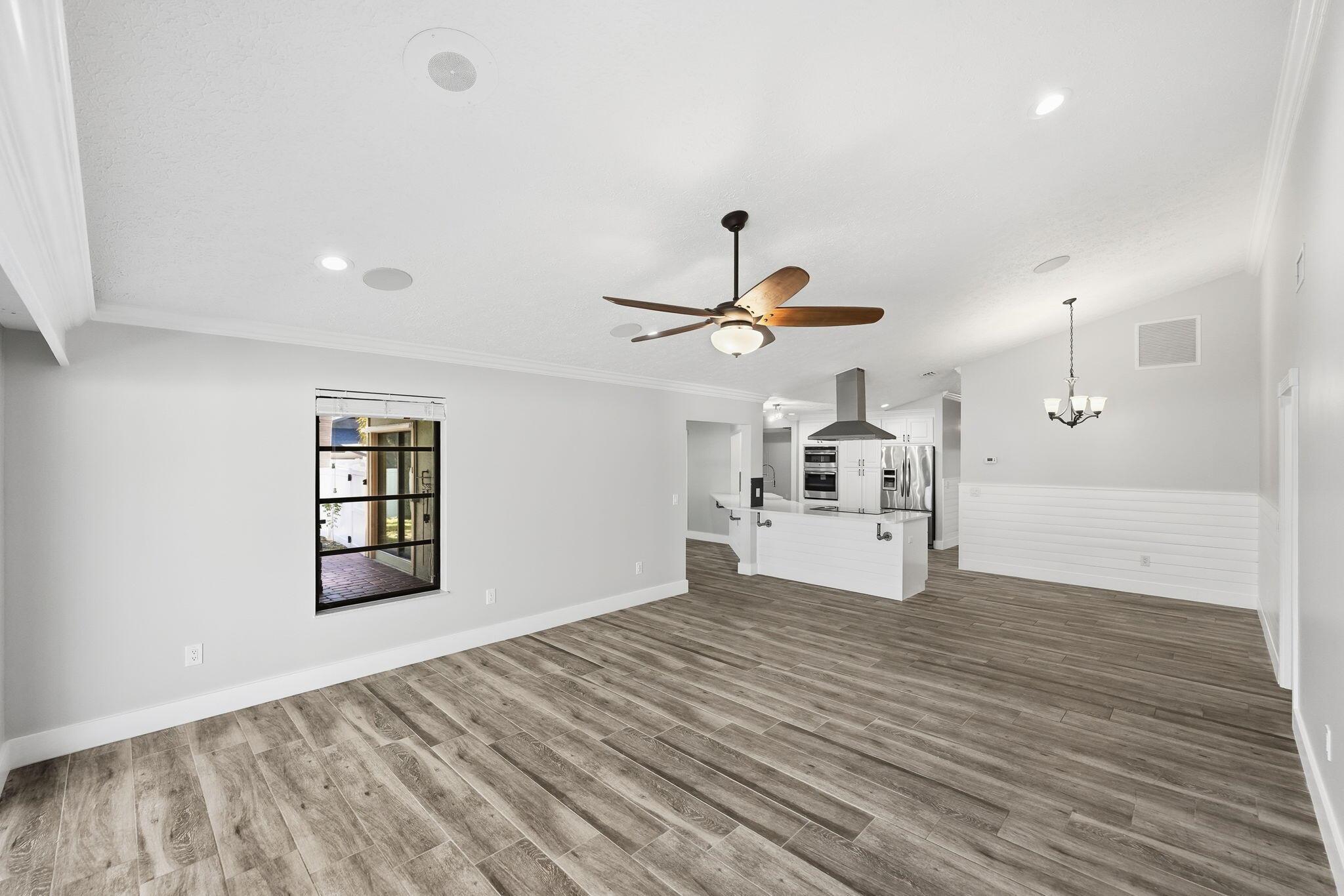 Located on 0.91 acres, this well-maintained home features numerous updates and versatile living spaces. Interior features include 3 bedrooms, 2 full baths, a primary suite with soaking tub and separate shower, a separate living room, open family room, and flexible dining/bonus room. The kitchen offers an induction cooktop, soft-close cabinetry, quartz countertops, a ceramic farm sink, and updated appliances. A bar area with wine storage and a separate laundry room add convenience for entertaining. Fresh paint, crown molding, canned lighting, and integrated sound complete the interior. Exterior highlights include a newer roof and gutters (2022), dual AC, fully fenced yard with electric gate, and a covered summer kitchen updated in 2025 with grill, sink, fridge, and pavers. The heated