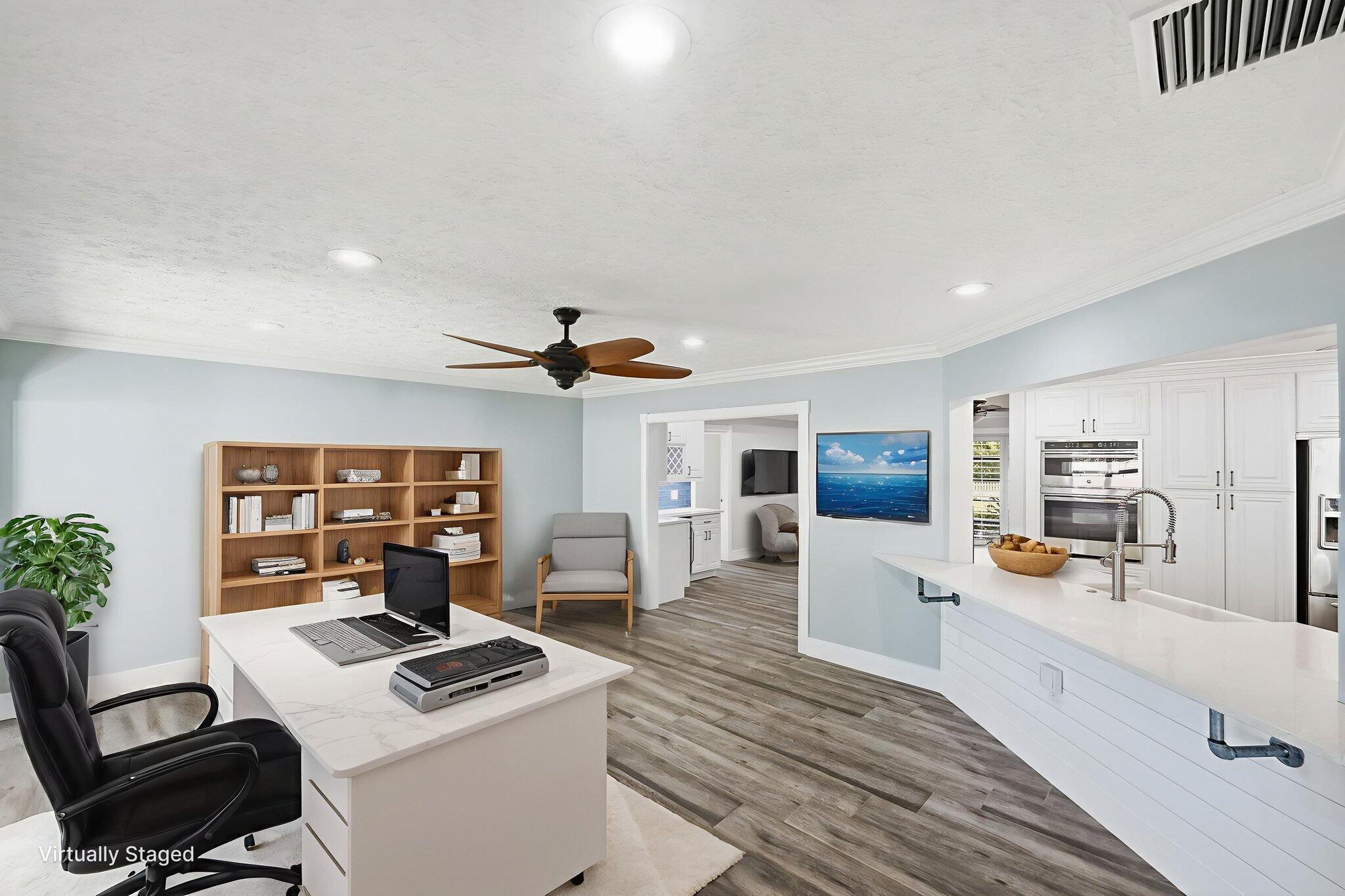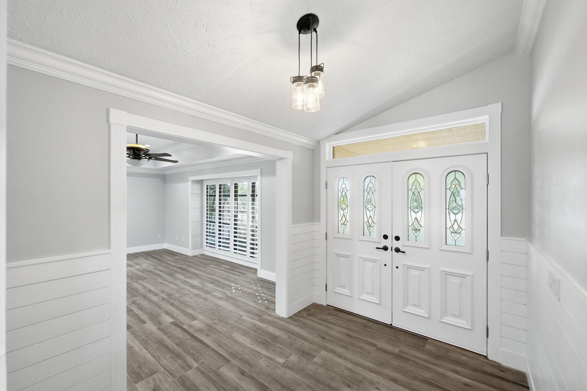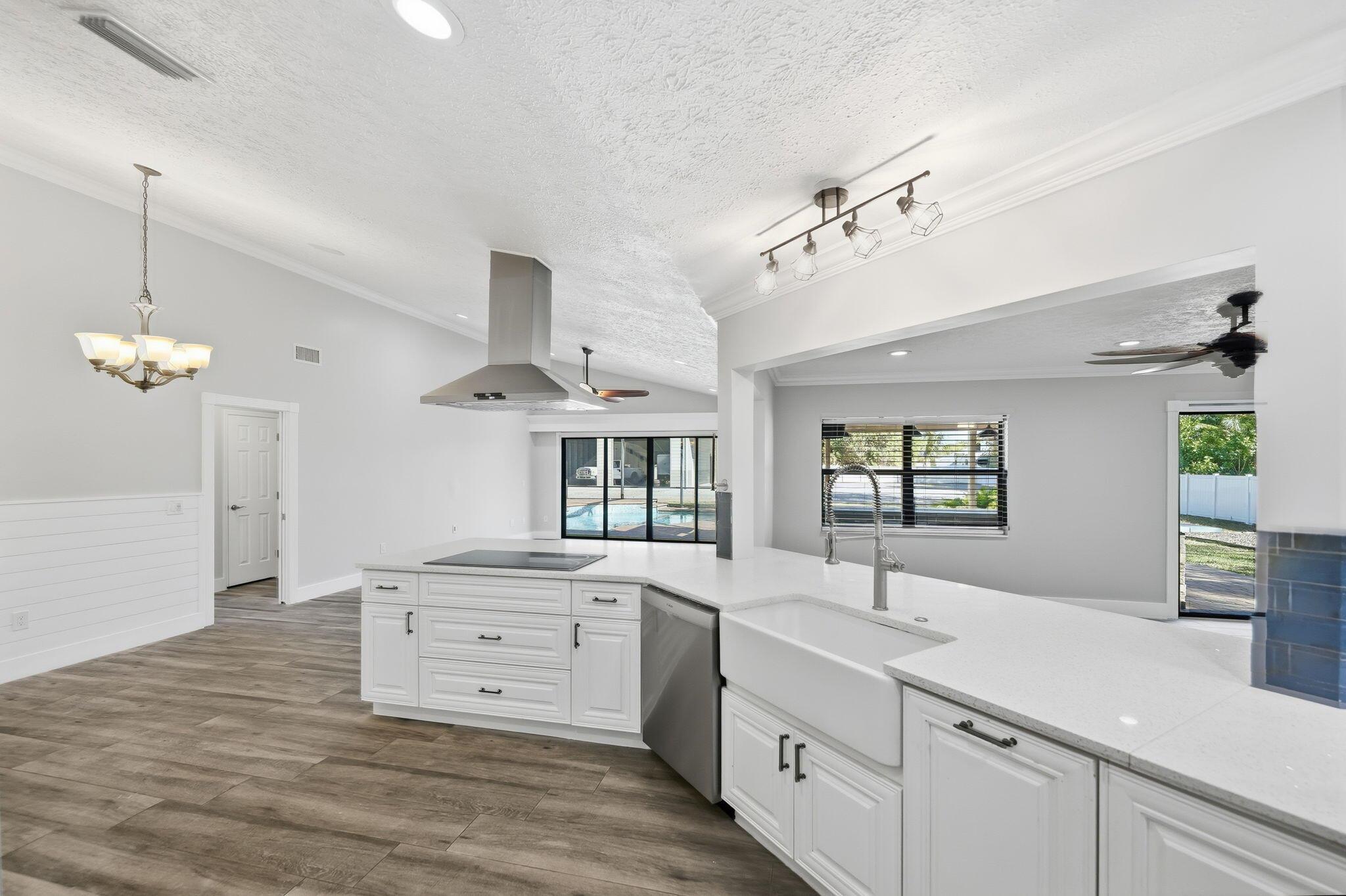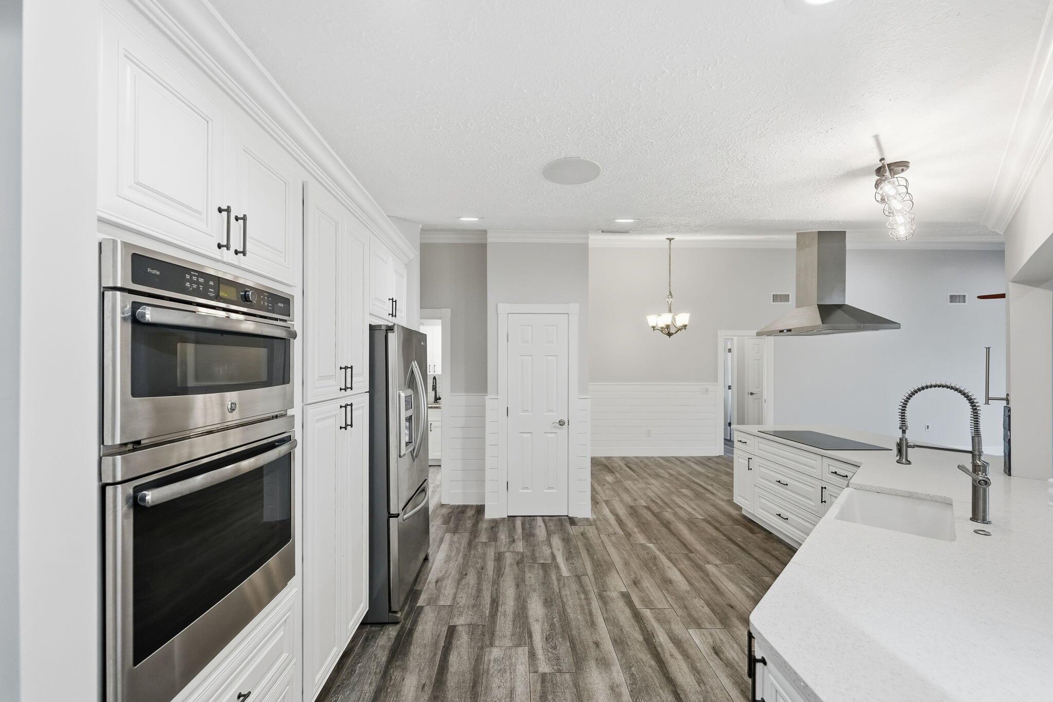 Located on 0.91 acres, this well-maintained home features numerous updates and versatile living spaces. Interior features include 3 bedrooms, 2 full baths, a primary suite with soaking tub and separate shower, a separate living room, open family room, and flexible dining/bonus room. The kitchen offers an induction cooktop, soft-close cabinetry, quartz countertops, a ceramic farm sink, and updated appliances. A bar area with wine storage and a separate laundry room add convenience for entertaining. Fresh paint, crown molding, canned lighting, and integrated sound complete the interior. Exterior highlights include a newer roof and gutters (2022), dual AC, fully fenced yard with electric gate, and a covered summer kitchen updated in 2025 with grill, sink, fridge, and pavers. The heated