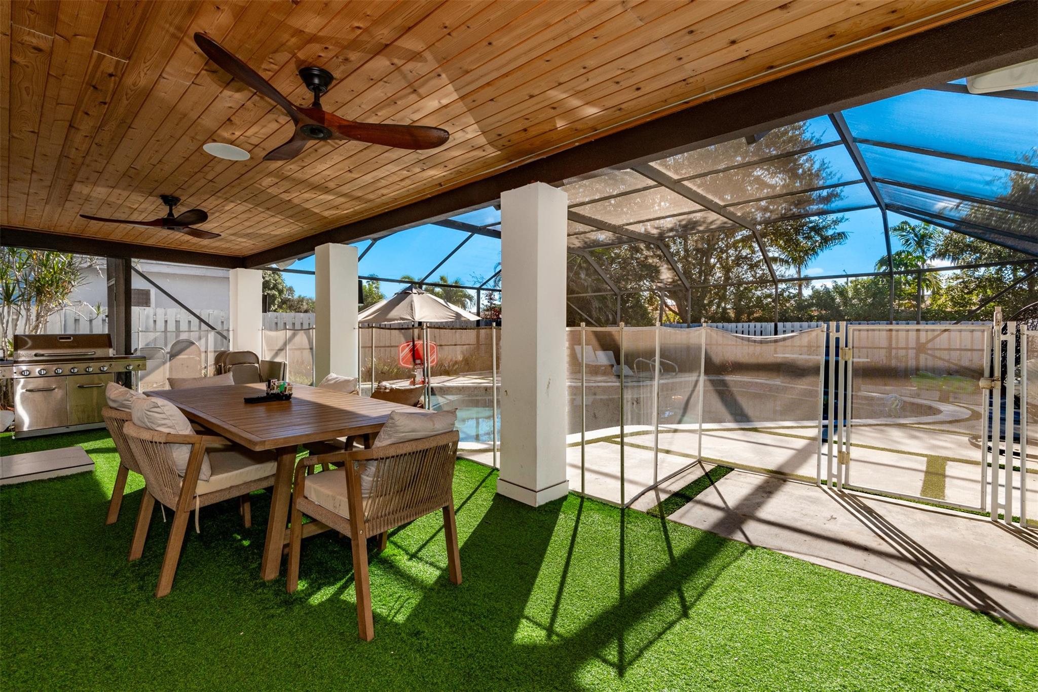 Experience luxury living in this beautifully updated 4-bedroom, 3-bath home. contemporary finishes and high-quality craftsmanship. The gourmet kitchen is a centerpiece, showcasing premium appliances, a striking waterfall quartz island, and an array of designer touches that elevate the space. Impact door and windows replacement of all cast iron pipes, ensuring long-term durability. The home also features new plumbing with copper lines, updated A/C vents. A screened-in patio and newly refinished pool area, surrounded by low-maintenance synthetic grass that adds both style and comfort. Ideally situated just a short walk from places of worship.