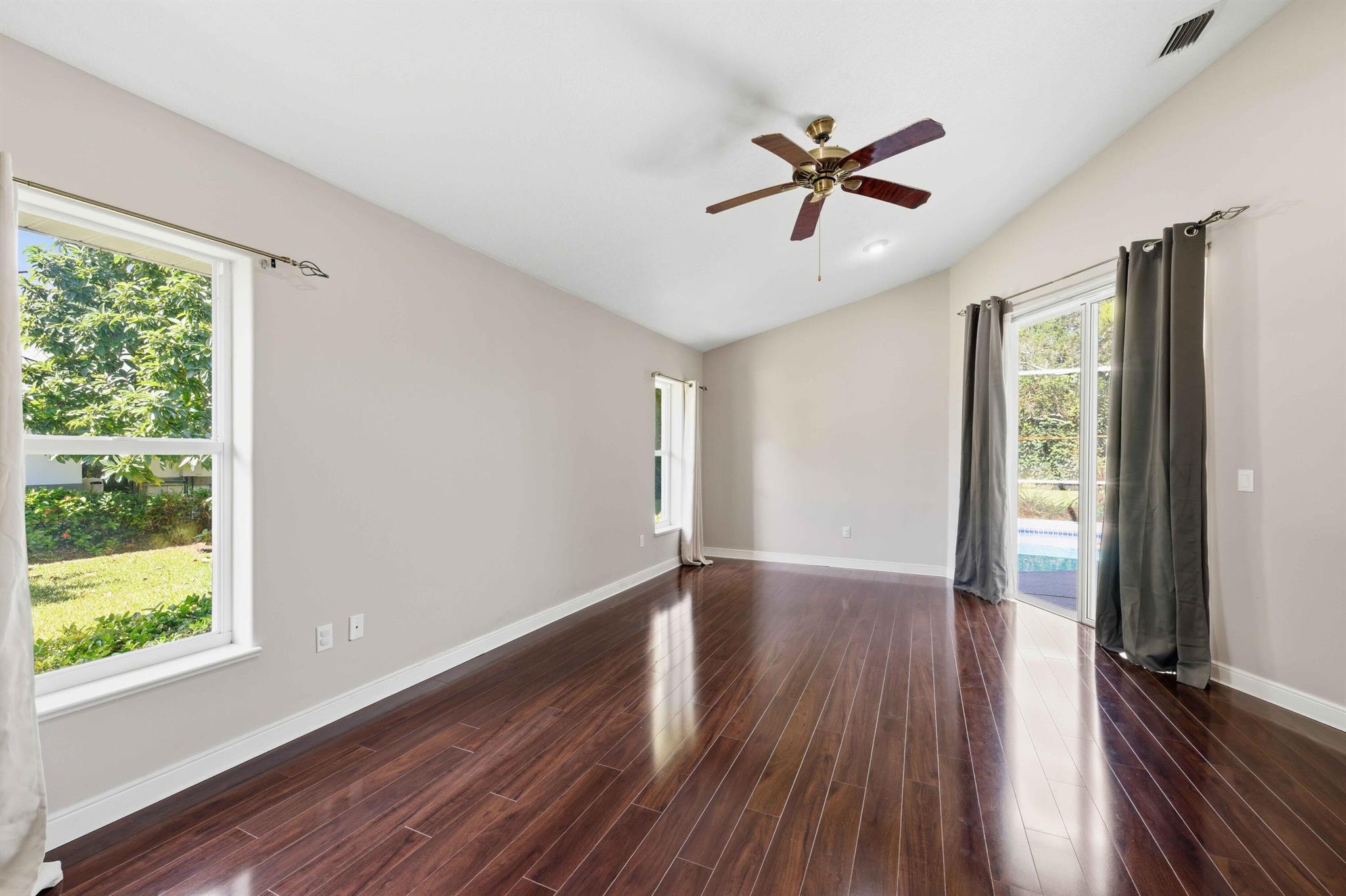 Welcome to River Landing!A lovely gated community in highly sought after Palm City, FL. Community features include a fenced-in storage area for boats, trailers, and RVs (annual fee & based on availability), a community boat ramp and storage with ocean access, tennis and pickleball courts, and a children's playground. School bus pickup for elementary, middle, and high school is conveniently located at the front gate.This beautiful CBS home offers 4 true bedrooms, 3 full bathrooms, plus a separate office. Flooring throughout is tile and laminate wood. The family room features a cozy wood-burning fireplace overlooking the in-ground pool and spa, creating a perfect indoor/outdoor space for entertaining. The home also includes an oversized 3-car garage.