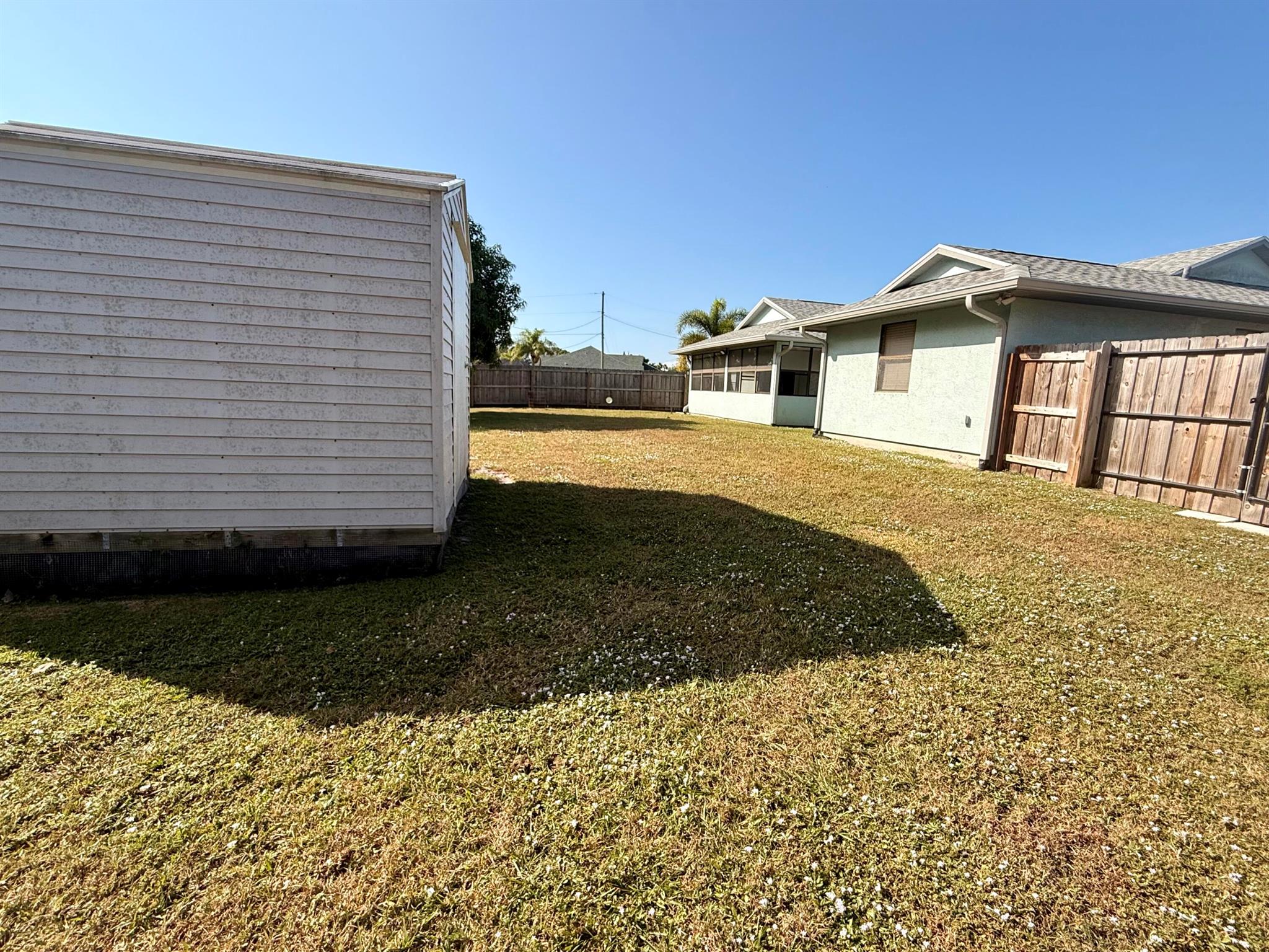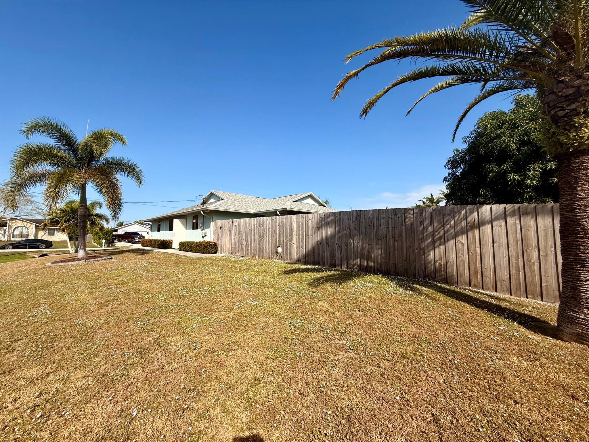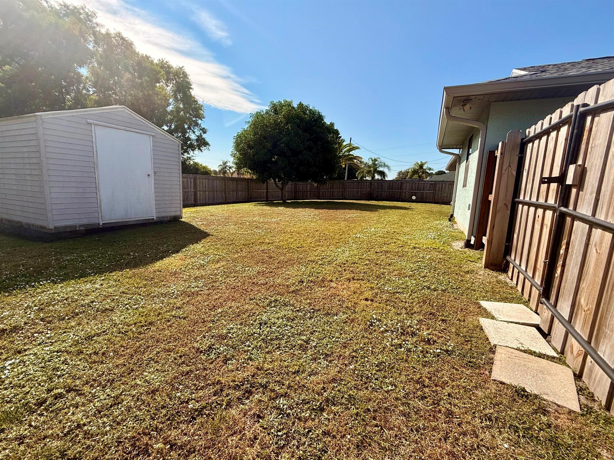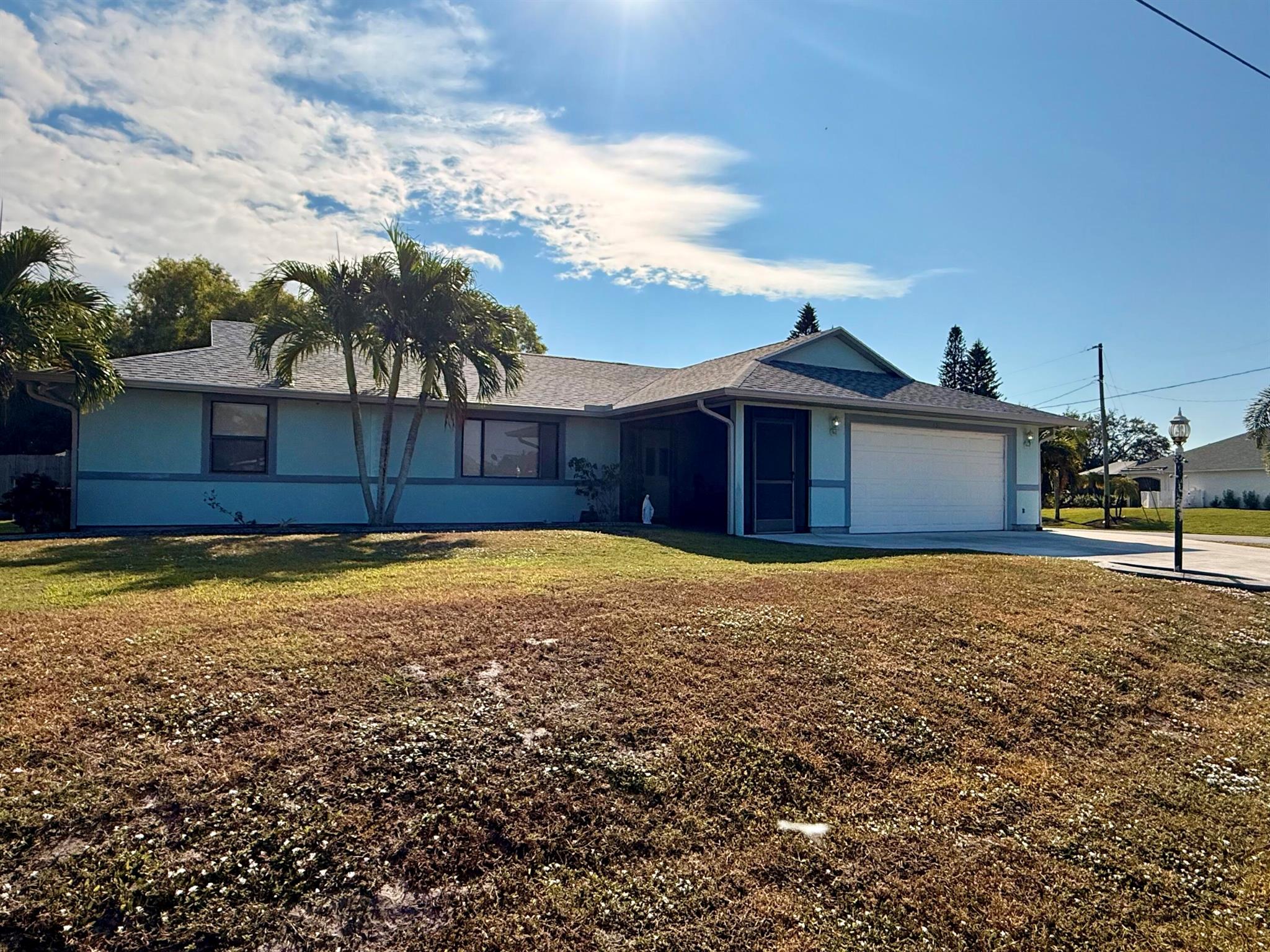 Welcome to Southbend, where you're just minutes away from the beautiful C-24 canal park and Jessica Clinton Park, perfect for outdoor activities. Situated near the turnpike, you'll have quick access to Palm City, Jensen Beach, and more, offering a variety of shopping, restaurants, and community events. This well-maintained home is nestled on a spacious corner lot, offering added privacy with a drainage canal. Inside, you'll find tile floors throughout the living area and kitchen, complemented by a separate dining room and a cozy breakfast nook in the kitchen. Off the kitchen, there's a versatile third bedroom or a dedicated office space that connects to the expansive backyard. The backyard is mostly fenced, except for one side that to the neighboring property.