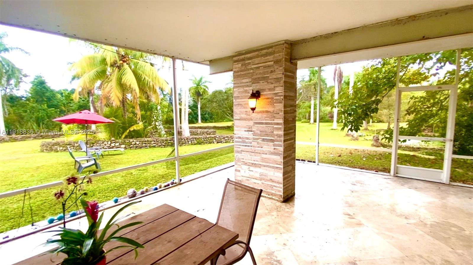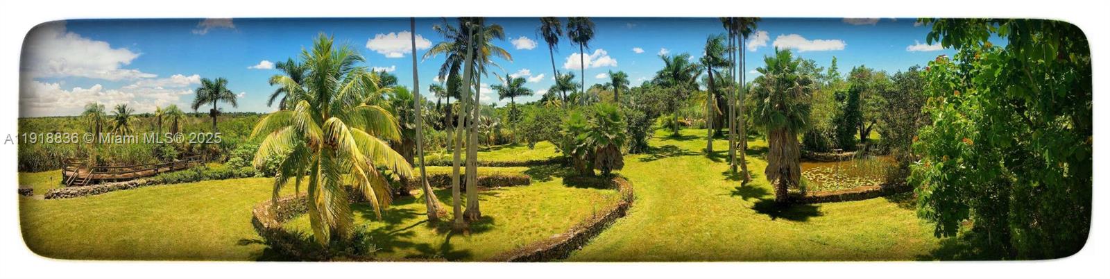 Everglades Paradise is a hilltop 3-story masterpiece of architecture on almost 5 acres that sits at the edge of the Everglades, where neighbors are down the road, not next door. Less than an hour from downtown Miami and just 15 minutes to the gateway to the Florida Keys and the city centers of Homestead and Florida City. This spacious home, while comfortably livable, has a rustic, unpolished character that invites your personal updating inside and out. Enjoy your own star fruit year round and mangos & lychees every spring. Starlink, Comcast Fiber and Verizon 5G keep you connected. The first floor, with marble floors, is currently used as a private apartment/office with a large living area, a bedroom (used for exercise & storage) and bathroom. Its glass sliding doors open into a screened patio with more marble floors that afford dramatic views of the landscaped surroundings. The second story is open to the third floor and has 3 bedrooms, 2 bathrooms and a great room combined with an open kitchen. All of the second-floor living spaces have glass sliding doors that open to a sweeping wrap-around veranda that extends the inside area to the natural beauty outdoors. The third floor loft opens to east & west terraces with expansive views of the Everglades and surrounding farmland, stretching to the horizon. 2nd & 3rd floors all Mexican tile.