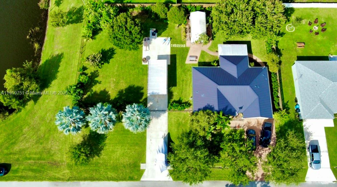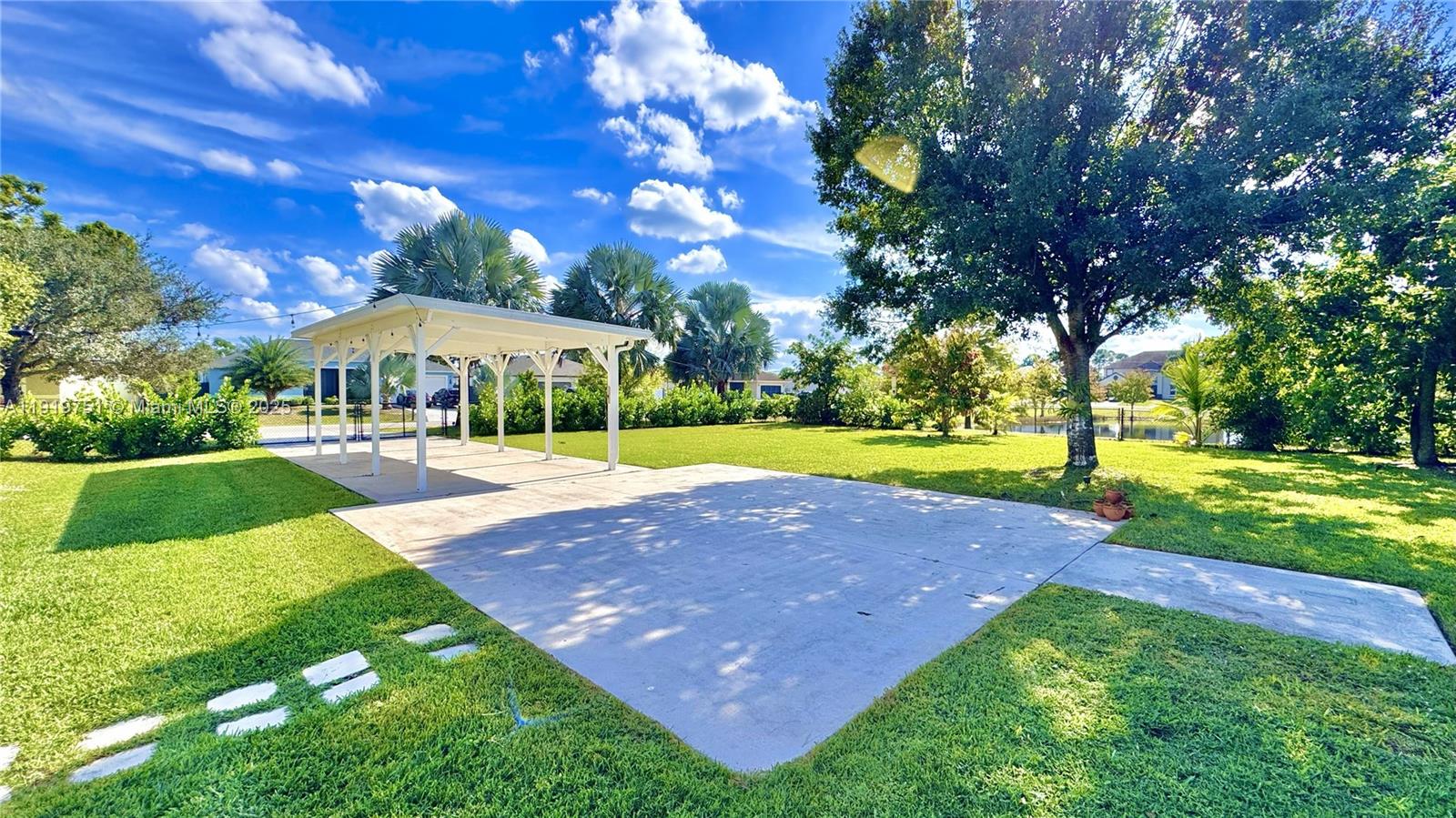 A rare find! 3/2/2cg CBS home on a fully fenced .46 acre double lot with water views and lush privacy landscaping. This home is excellent for those who want to relax in nature in their own private oasis while also enjoying the quick access to Tradition and interstate roadways. This is a must see home! There is a second driveway with covered carport - excellent for your boat, camper or work vehicle - and an additional 288 sqft workshop/shed with electricity & garage door. This home has been meticulously maintained and upgraded. New roof (2024). Newer A/C (2022) & appliances. The irrigation system is on its own well water source. The rear of the home boasts a 20X20 custom tiled patio & screened porch. The home is also equipped with accordion hurricane shutters on all doors and windows.