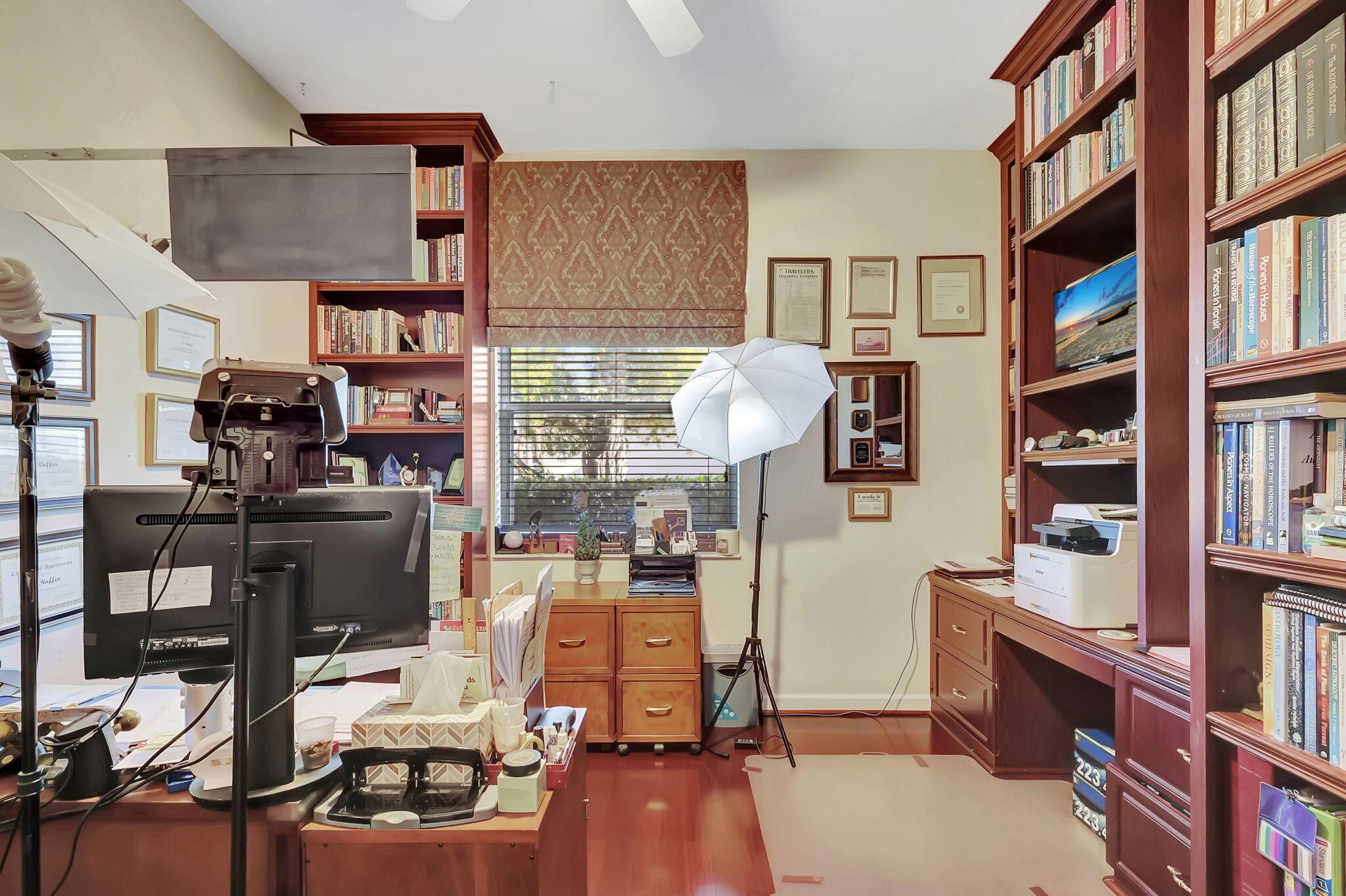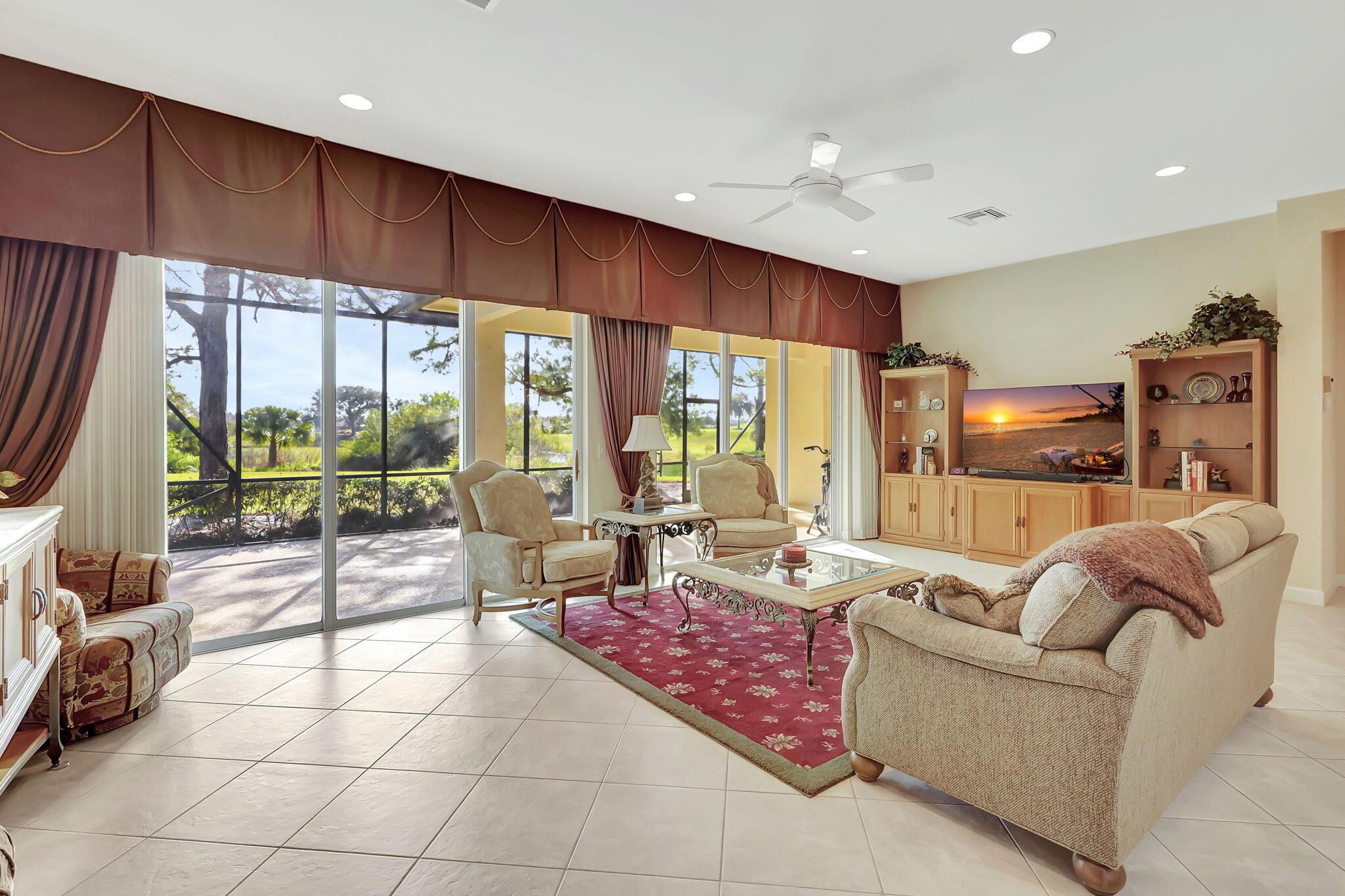 Embrace refined living in the heart of PGA Village, one of the Treasure Coast's most sought-after communities. This beautifully appointed home offers more than 2,100 square feet of thoughtfully designed space, blending timeless elegance with everyday comfort.A welcoming split-bedroom layout features three full baths, a powder room, and a sophisticated home office highlighted by custom floor-to-ceiling built-ins. The chef-inspired kitchen is the centerpiece of the home, showcasing rich granite countertops, stainless steel appliances, and an island ideal for gatherings.Designed for effortless indoor-outdoor living, the home opens to an oversized screened lanai with sweeping golf course and lake views. A serene backdrop for morning coffee, evening cocktails, or entertaining friends.