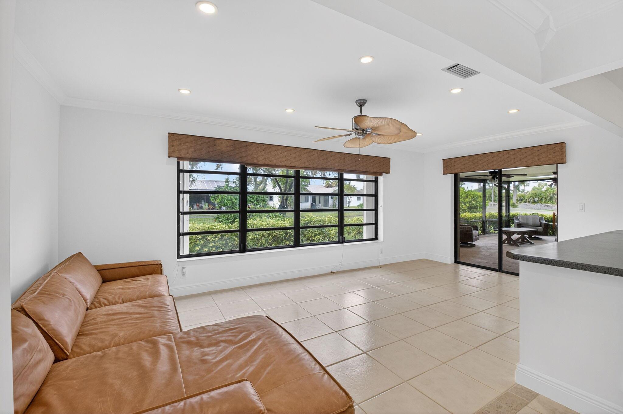 Spacious, bright, and well maintained 2 Bedroom + den detached home in Boca Chase 55+ subdivision, Greenbriar. Enjoy vaulted ceilings, natural light, and a 20x20 covered & screened patio. The home features many updates including: 2022 roof, 2022 AC, newly dug well for sprinklers and new sprinkler heads, newly paved driveway, new trellis column, new interior paint, new baseboards, new skylights in the patio, two renovated bathrooms, and stainless steel appliances. Greenbriar offers tennis, pickleball, and a heated pool for a very reasonable HOA fee. Enjoy the peace and tranquility of detached living in this prime location just minutes away from shopping, dining, golf, and parks!
