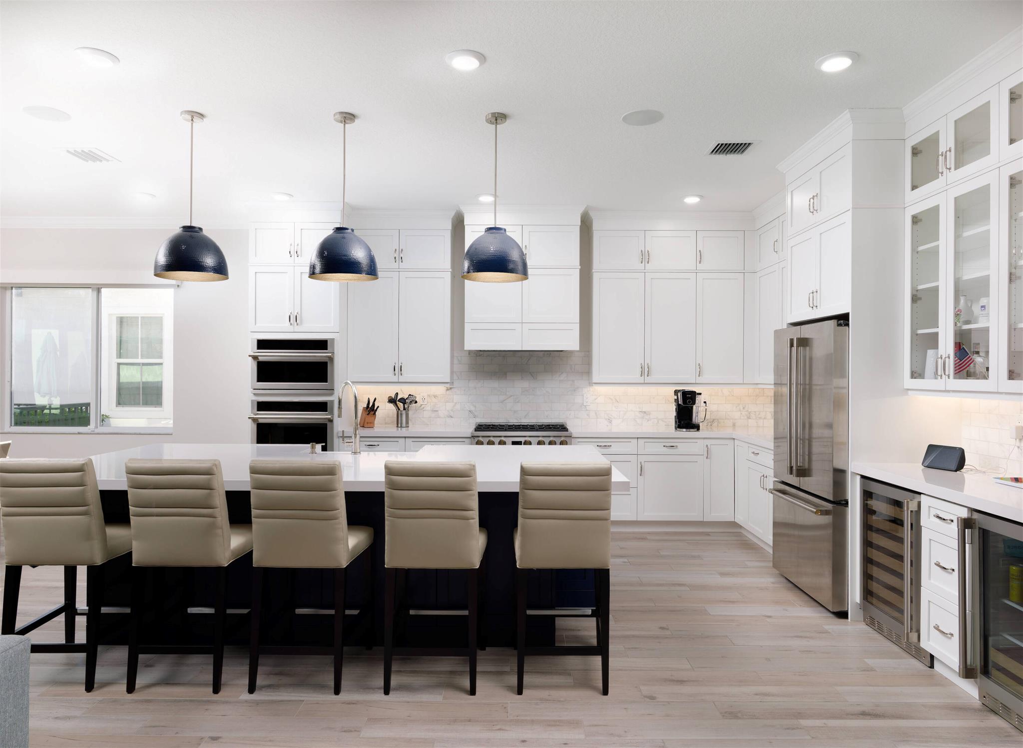Welcome to this beautifully designed, modern single-story home in the sought-after La Terre subdivision of Avenir. Built in 2023 and offering 3,100 square feet of thoughtfully crafted living space, this residence blends contemporary style with everyday comfort, enhanced by premium upgrades including a whole-house generator, a SWAT Mosquito system, and full impact windows for year-round protection and peace of mind. White oak wood-look porcelain tile and a soft neutral palette set a warm, cohesive tone throughout the home.Through double French doors, the bright foyer greets you with high ceilings and a striking modern chandelier. Just beyond, the den features three oversized windows framing views of the front garden, creating a light-filled space currently enjoyed as both an adult