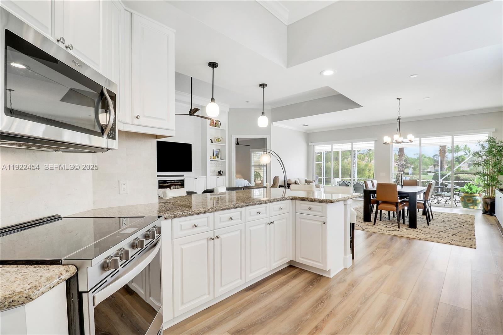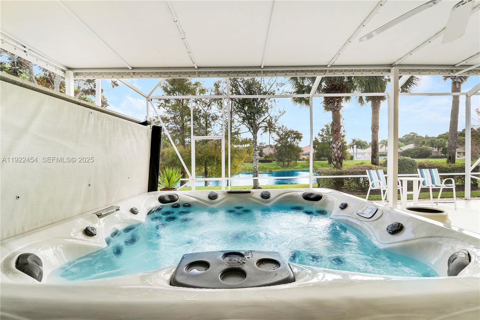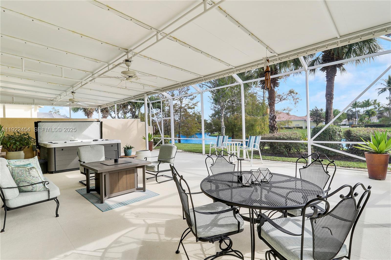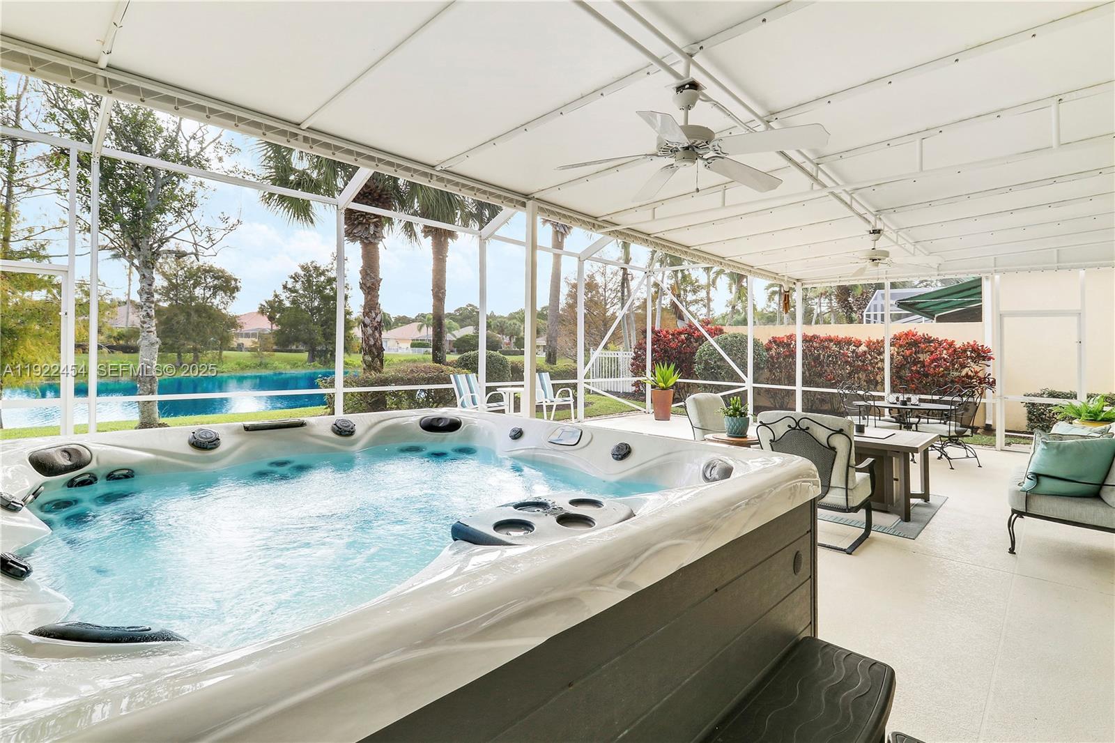 This immaculate Lakefront Extended Oakmont is the one you have been waiting for. Brand New Roof & Gutters 2025 -Completely remodeled with new kitchen cabinets and granite countertops, stainless steel appliances, wide plank wood grain LVT flooring throughout. Both bathrooms have been updated. Custom wall unit with fireplace and shiplap siding. All closets have built-ins and solid bi-fold doors. Freshly painted throughout. Newer washer and dryer, epoxy flooring in garage. Outside screened in lanai includes a fixed permanent awning (20'X40') and Hot Tub with plenty of room for outdoor entertaining.