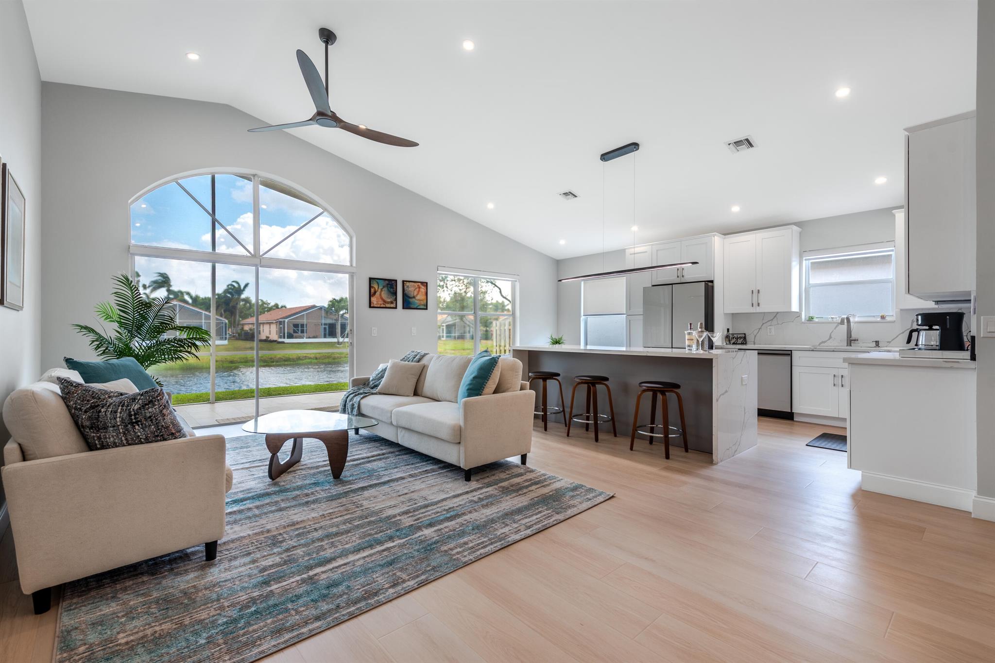 A stunning renovation, everything done to perfection, including a new roof and AC in 2024. Walk through the front door and you will see the beautiful lake view and fountain. Kitchen has been opened up and is a sleek, modern design with a huge island and quartz counters and backsplash. Bathrooms are spa-like with beatiful tile work and modern vanities. Very large model in community with expansive living space and a comfortable primary suite. The 3rd bedroom - den with double doors.Remote operated blinds thruout.Community - upgraded, active clubhouse with new pickleball courts and a large resort like pool. Friendly community.Recent quote to replace all windows with impact but owner travels regularly and has not done the work. Seller will credit amount to Buyer.