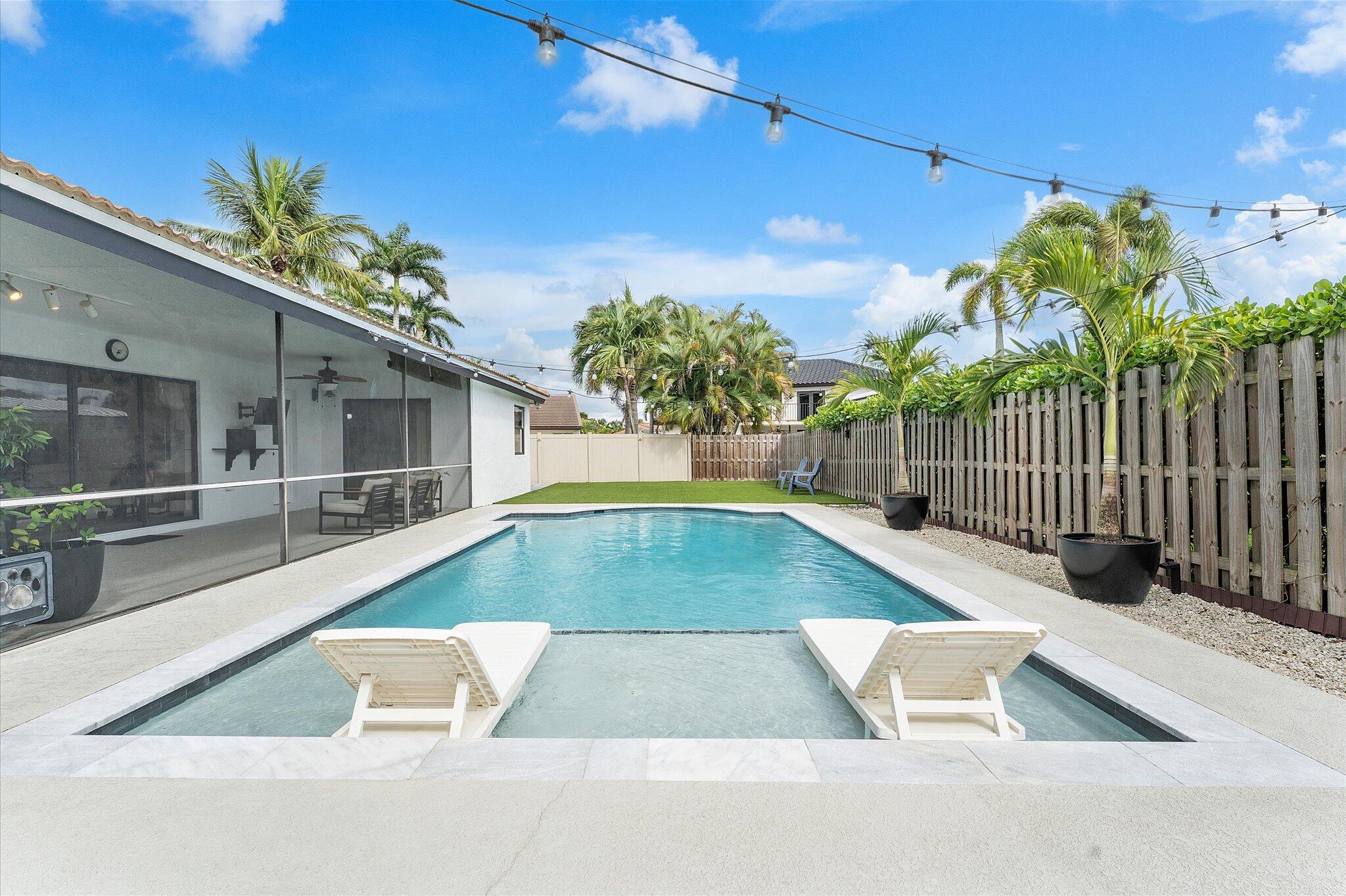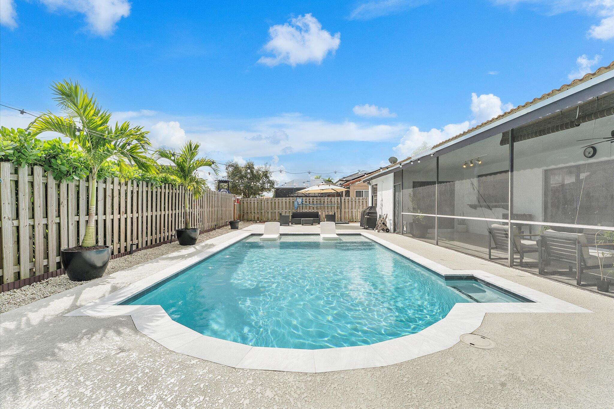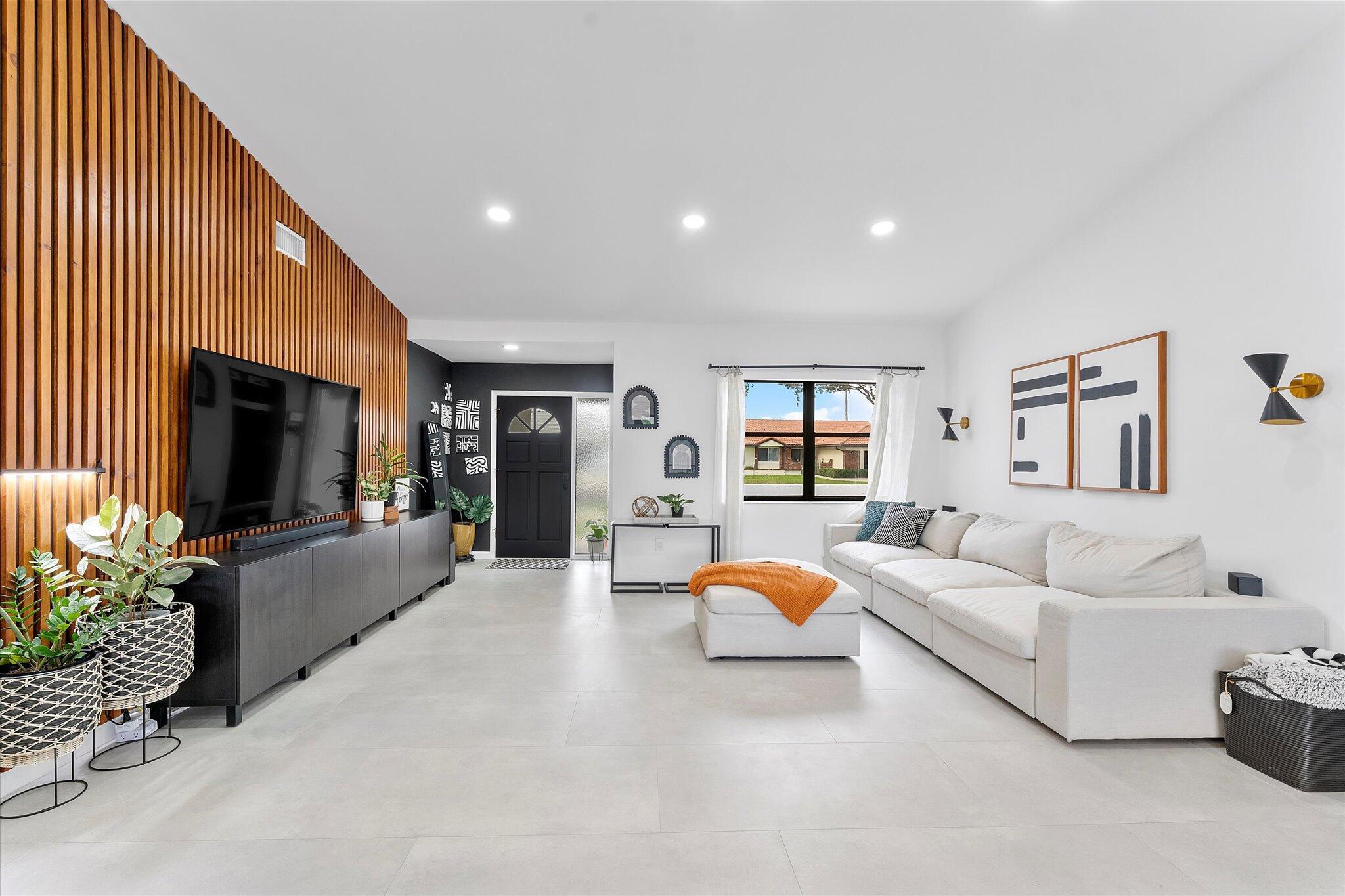 Modern and beautifully updated, this home features an open floor plan with tile flooring throughout, a spacious dining room with a custom accent wall, built-ins, and a wine cooler. The renovated chef's kitchen impresses with a large cooking island, farm sink, waterfall quartz countertops, and generous seating space. The adjoining living and family rooms flow effortlessly together, offering exceptional areas for both entertaining and relaxing. Vaulted ceilings and thoughtfully designed accent walls enhance the home's airy, contemporary feel. Expansive windows showcase the private backyard oasis, complete with a resurfaced (2023) and remodeled pool featuring a relaxing sundeck,