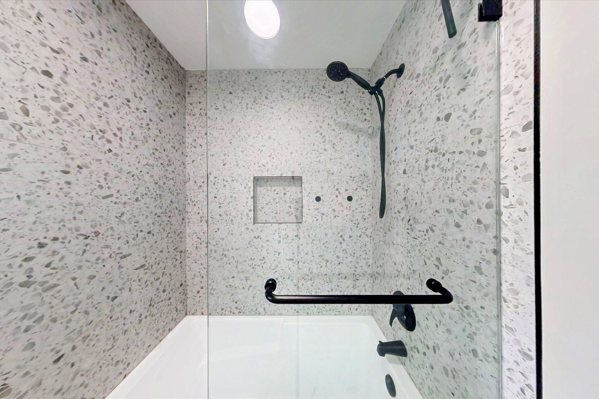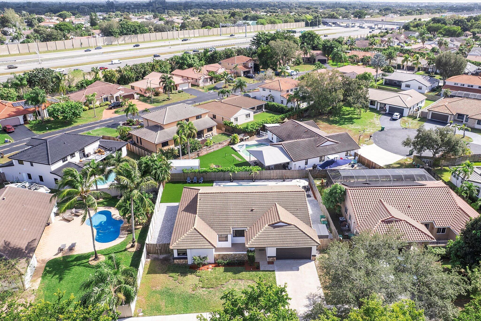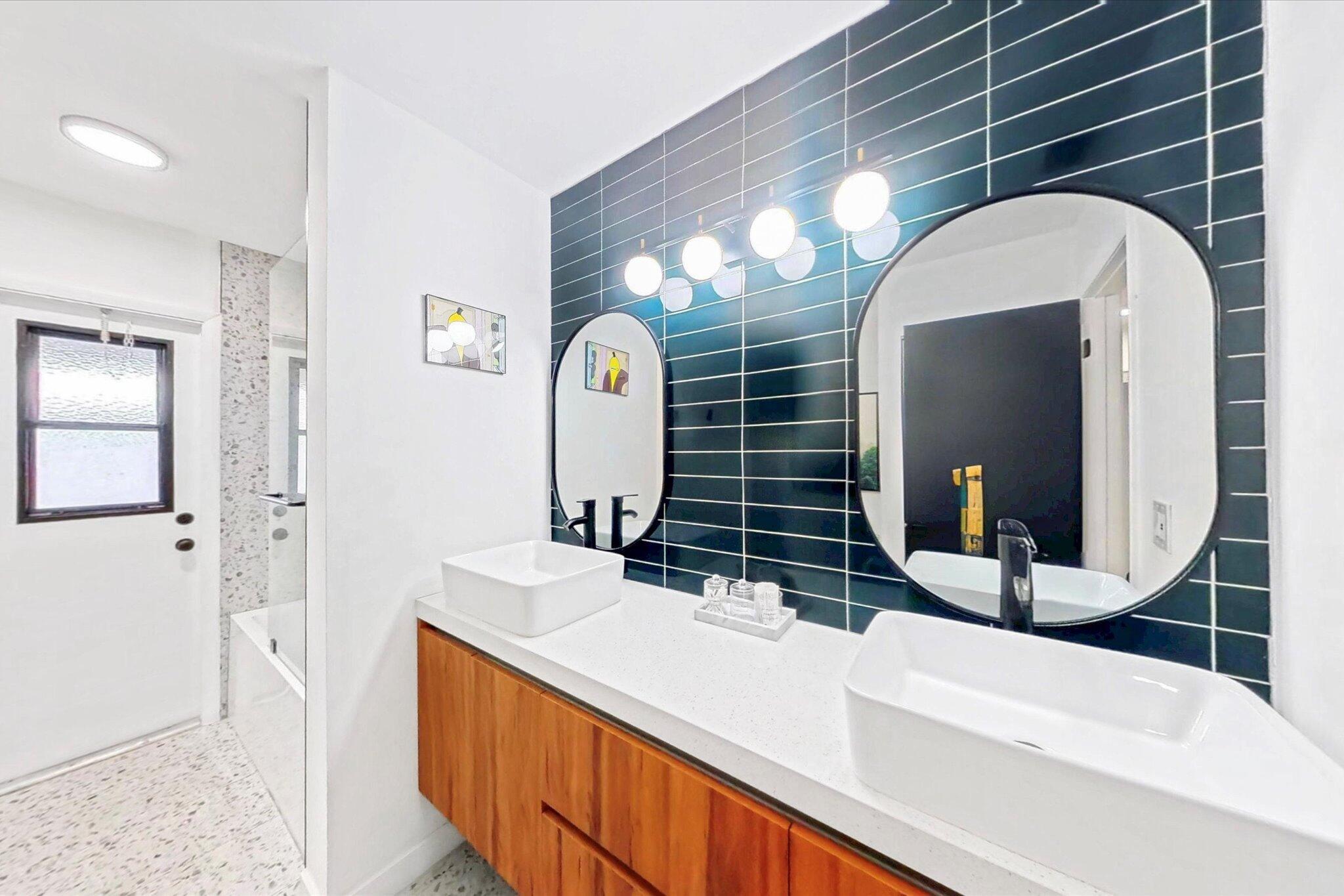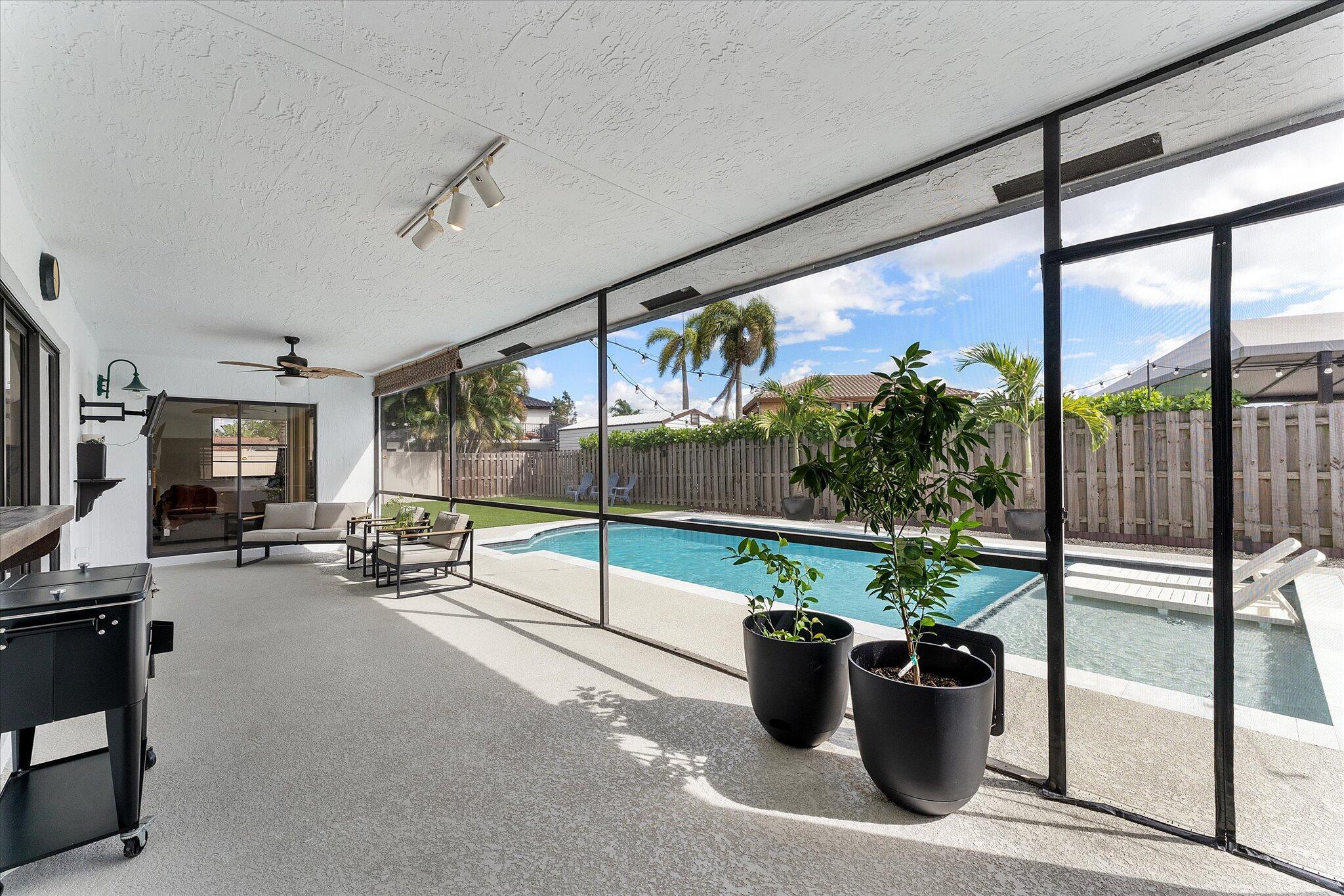 Modern and beautifully updated, this home features an open floor plan with tile flooring throughout, a spacious dining room with a custom accent wall, built-ins, and a wine cooler. The renovated chef's kitchen impresses with a large cooking island, farm sink, waterfall quartz countertops, and generous seating space. The adjoining living and family rooms flow effortlessly together, offering exceptional areas for both entertaining and relaxing. Vaulted ceilings and thoughtfully designed accent walls enhance the home's airy, contemporary feel. Expansive windows showcase the private backyard oasis, complete with a resurfaced (2023) and remodeled pool featuring a relaxing sundeck,