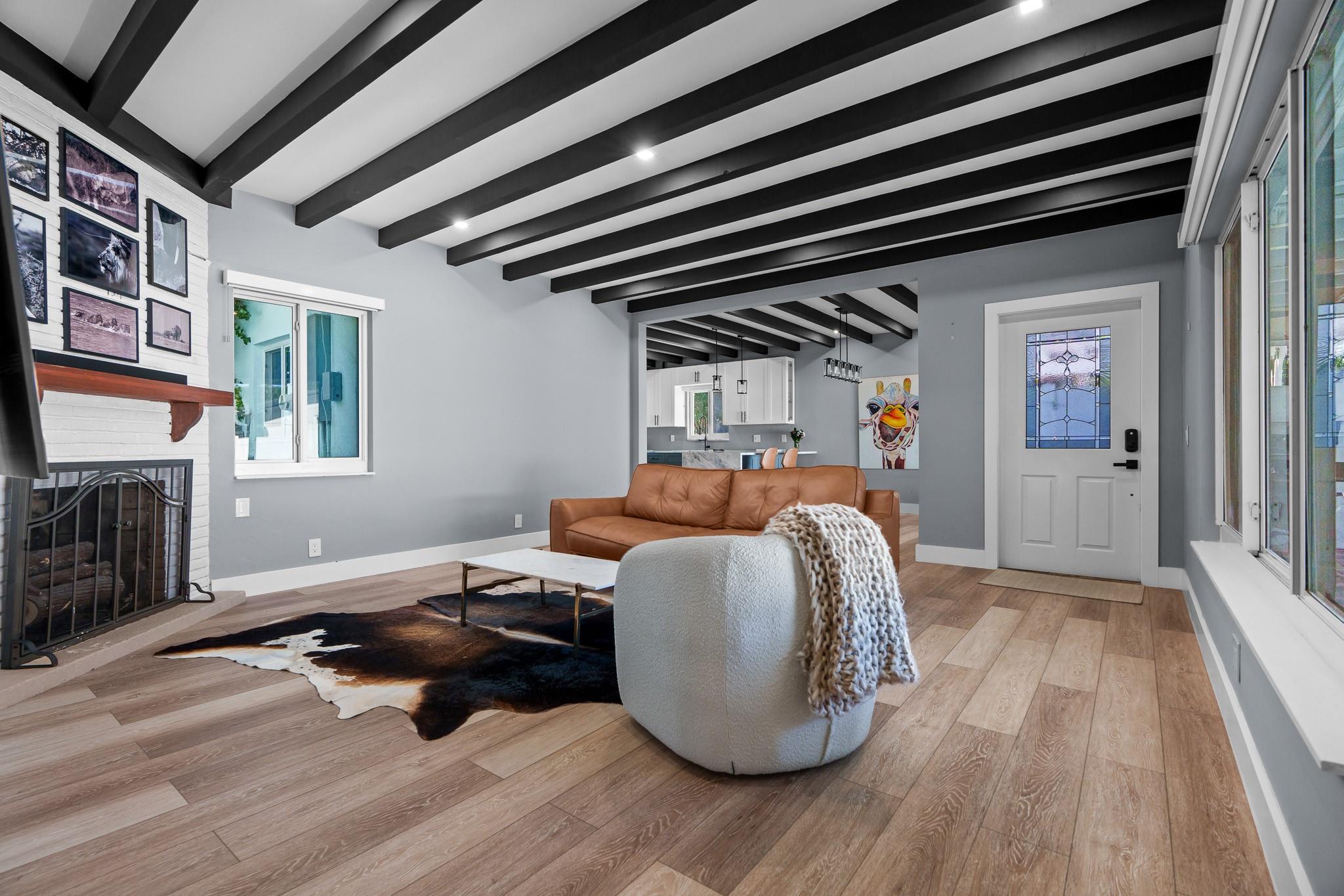 Beautifully updated and full of character, this Wilton Manors corner-lot pool home offers 3 bedrooms, 2 baths, and a warm modern aesthetic. The open living, dining, and kitchen areas are tied together with wood flooring and striking exposed beams. The designer kitchen features quartzite counters, custom cabinetry, soft-close drawers, and under-cabinet lighting. The spacious primary suite easily accommodates a king bed and includes a custom closet system and a spa-like bath with marble floors, a trough sink with dual faucets, and a rainfall shower. Additional perks include a tankless water heater and gas-powered dryer and cooktop. Outside, the property has a fenced in pool and patio and extra side yard that is framed by mature tropical fruit trees including mango, and avocado.