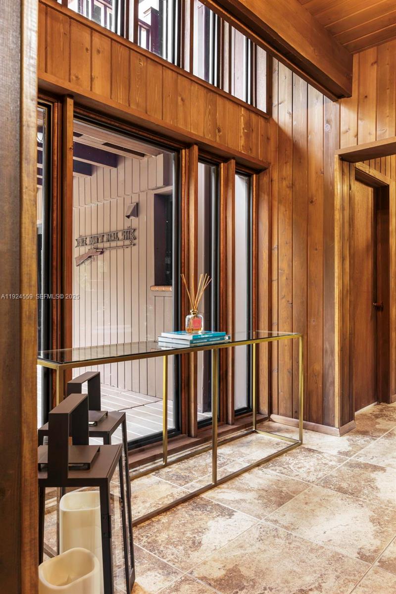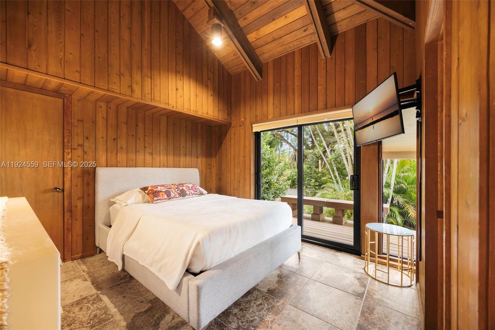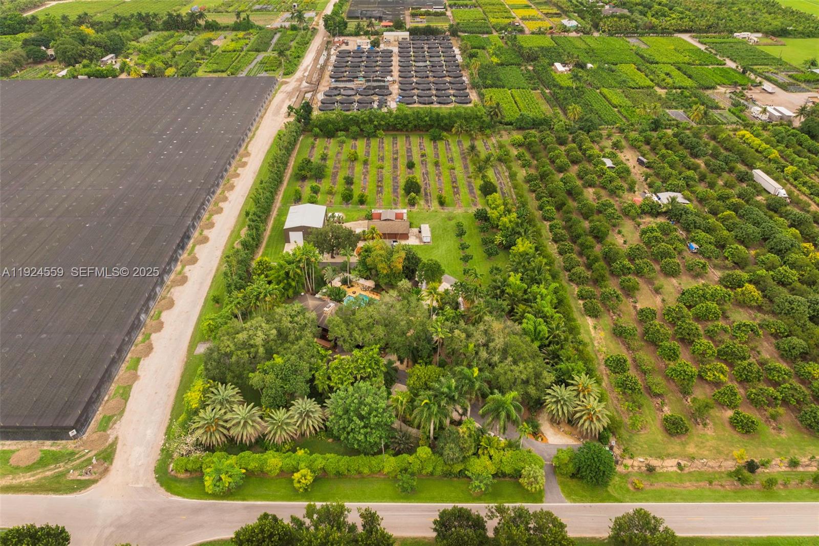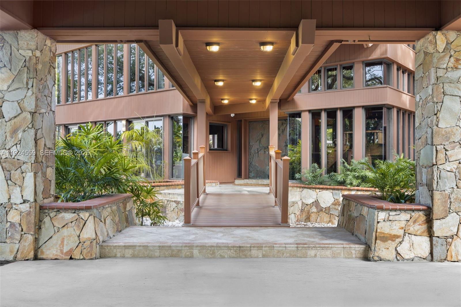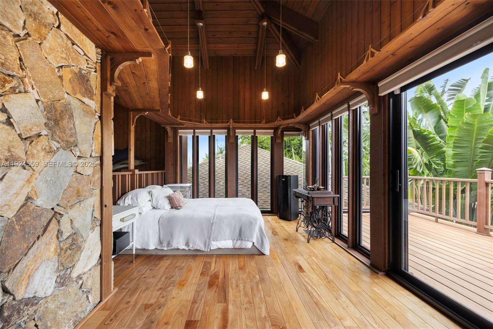 Rare 1980 architectural masterpiece by renowned architect John Weller, whose organic design philosophy created a home that becomes part of the land. This 3 bd + loft, 3.5 ba, 4,318 SF custom home on 4+ acres shows his vision with over 100 impact windows and sliders that frame serene views and dissolve boundaries between indoors and out. You are welcomed by an artistic Italian copper security door beneath the porte-cochere with a circular drive. Natural materials flow throughout, including dark wood and stone tile in each living space, Honduran mahogany cabinetry and granite counters in the kitchen, exposed tongue-and-groove beams, and a dramatic double-sided river rock fireplace rising through the loft. The interior and exterior blend seamlessly with two connecting terraces on each level spanning the rear of the home, private terraces off each room, a uniquely shaped pool extending beneath an overpass to an elevated BBQ area, and meandering rock pathways through lush landscaping of mature oaks, palms, bamboo and fruit trees. The property also features a 2,000 SF workshop with electricity, a 4 car detached garage, home generator and mixed-use residential/agricultural zoning. The home is move-in ready, well maintained and the grounds have been meticulously restored. For discerning buyers who appreciate organic architectural style and craftsmanship, this is a livable work of art where Weller's integration of natural elements creates a tropical South Florida sanctuary.
