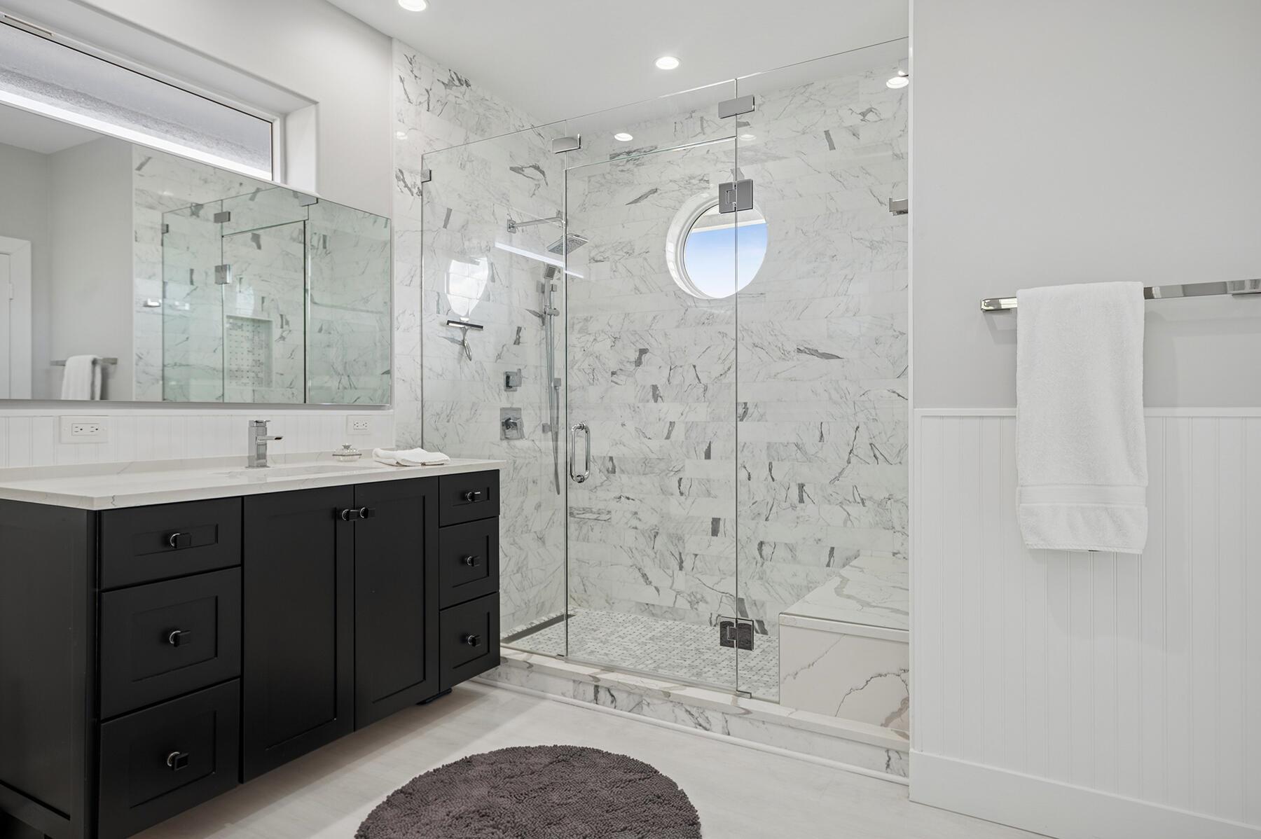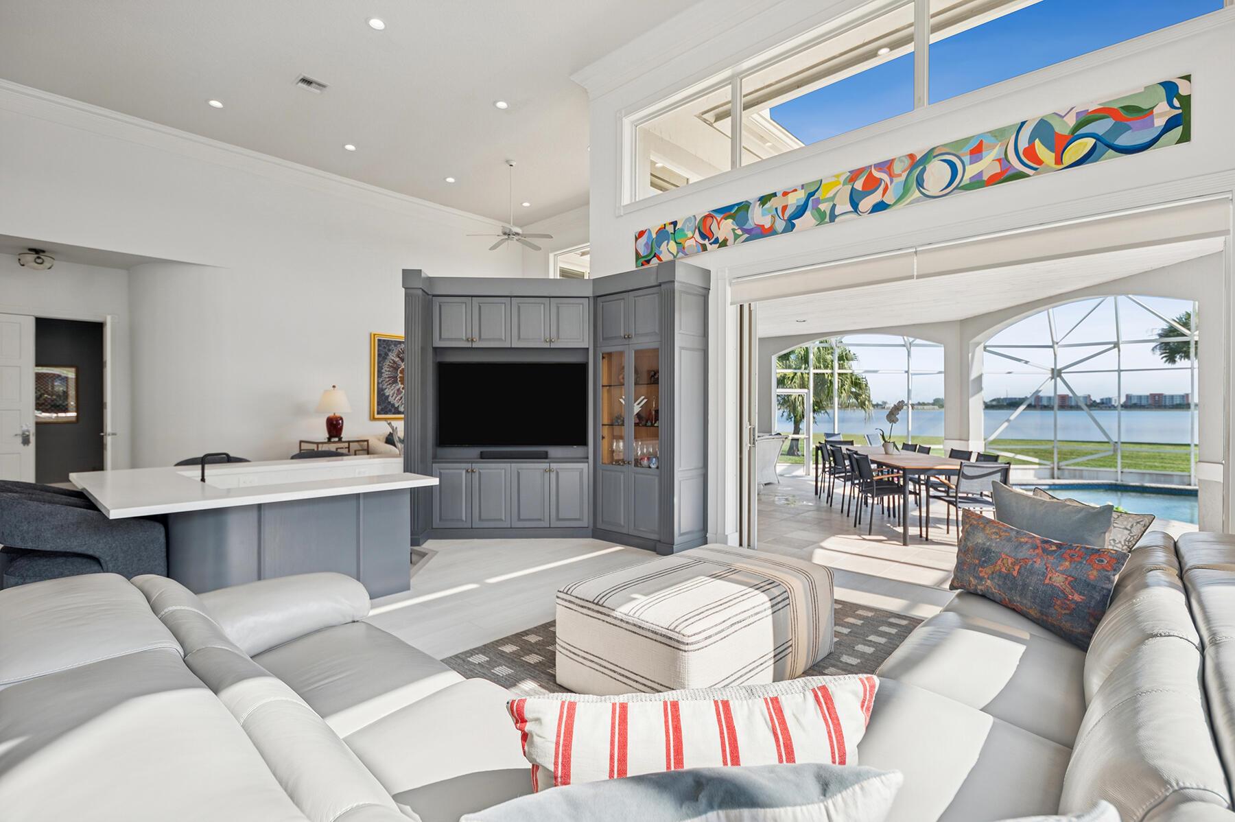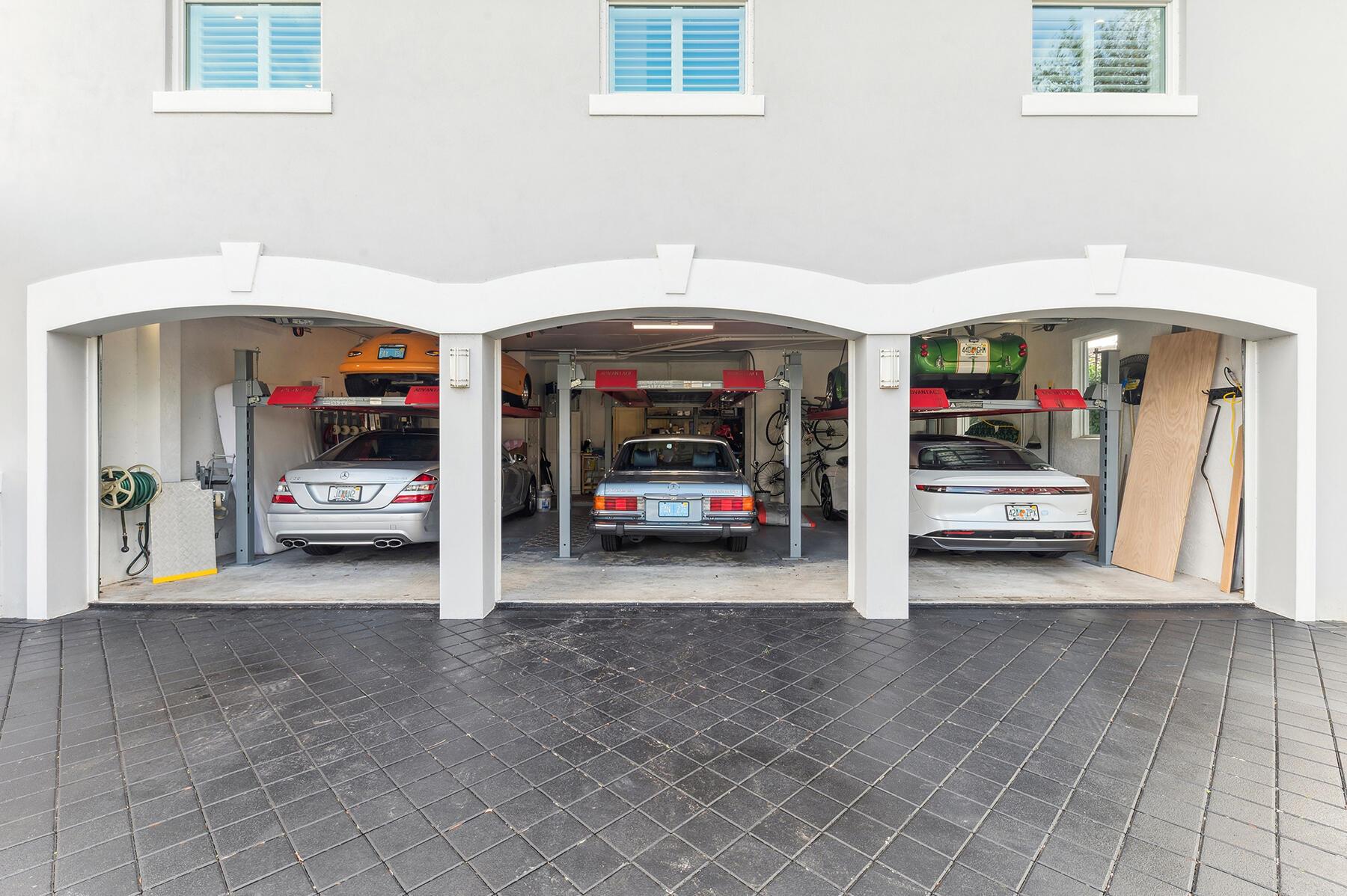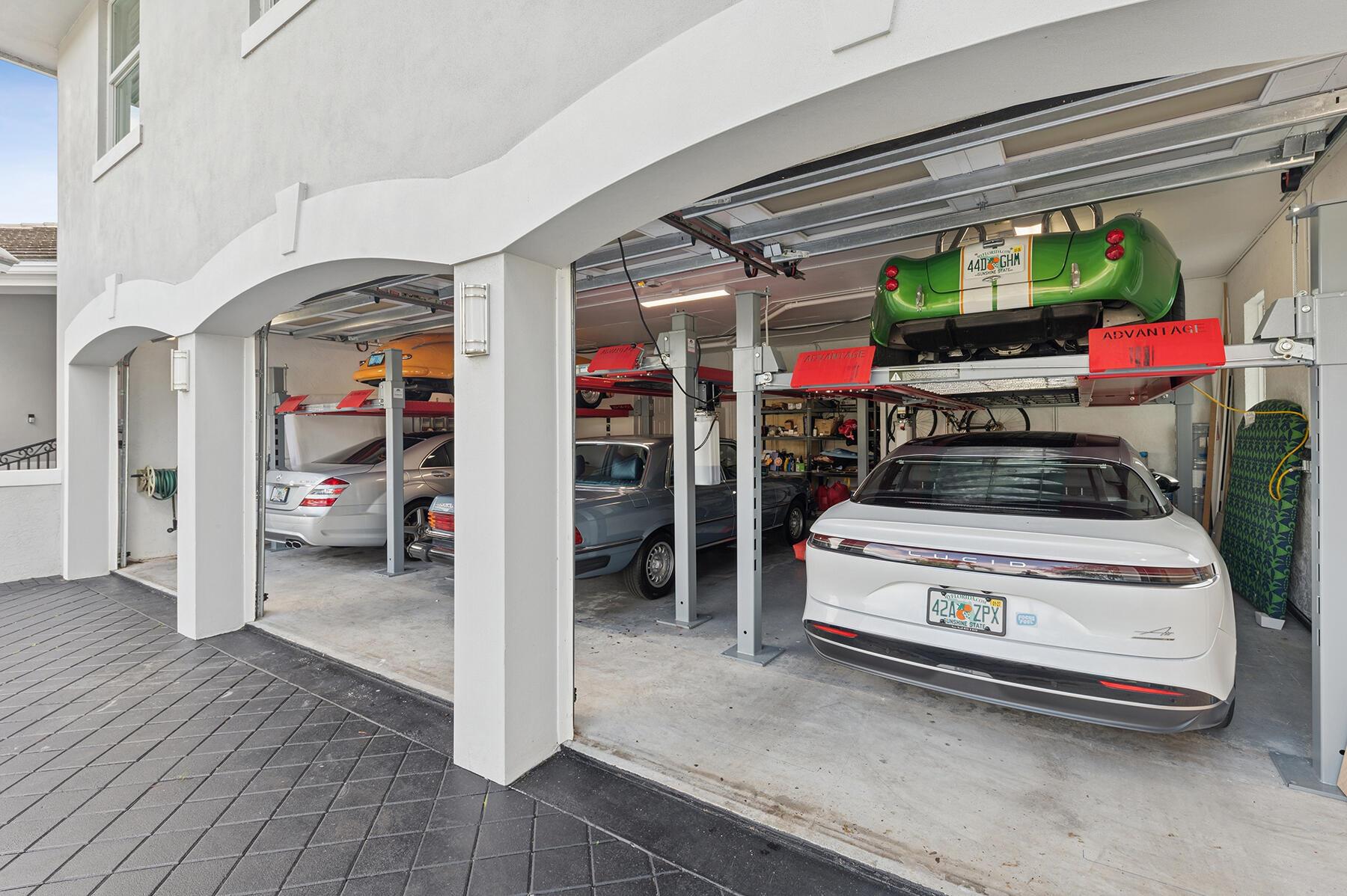 Bring your cherished antique and collectible cars to this spectacular contemporary residence, perfectly tucked away on a peaceful cul-de-sac overlooking the sparkling waters of Lake Mangonia. Custom built in 2019 by the current owner, this gracious home offers a versatile canvas designed to complement a wide range of taste and lifestyles. Nestled in the heart of West Palm Beach within the prestigious gated community of Presidential Estates, the property features a luxurious first-floor primary suite with a spa-inspired en-suite bath, a private workout/massage room, and a flexible loft space ready to adapt to your needs. Soaring ceiling and expansive windows bathe the interiors of this home in natural light, creating an open, airy atmosphere. Multiple sliding glass doors seamlessly