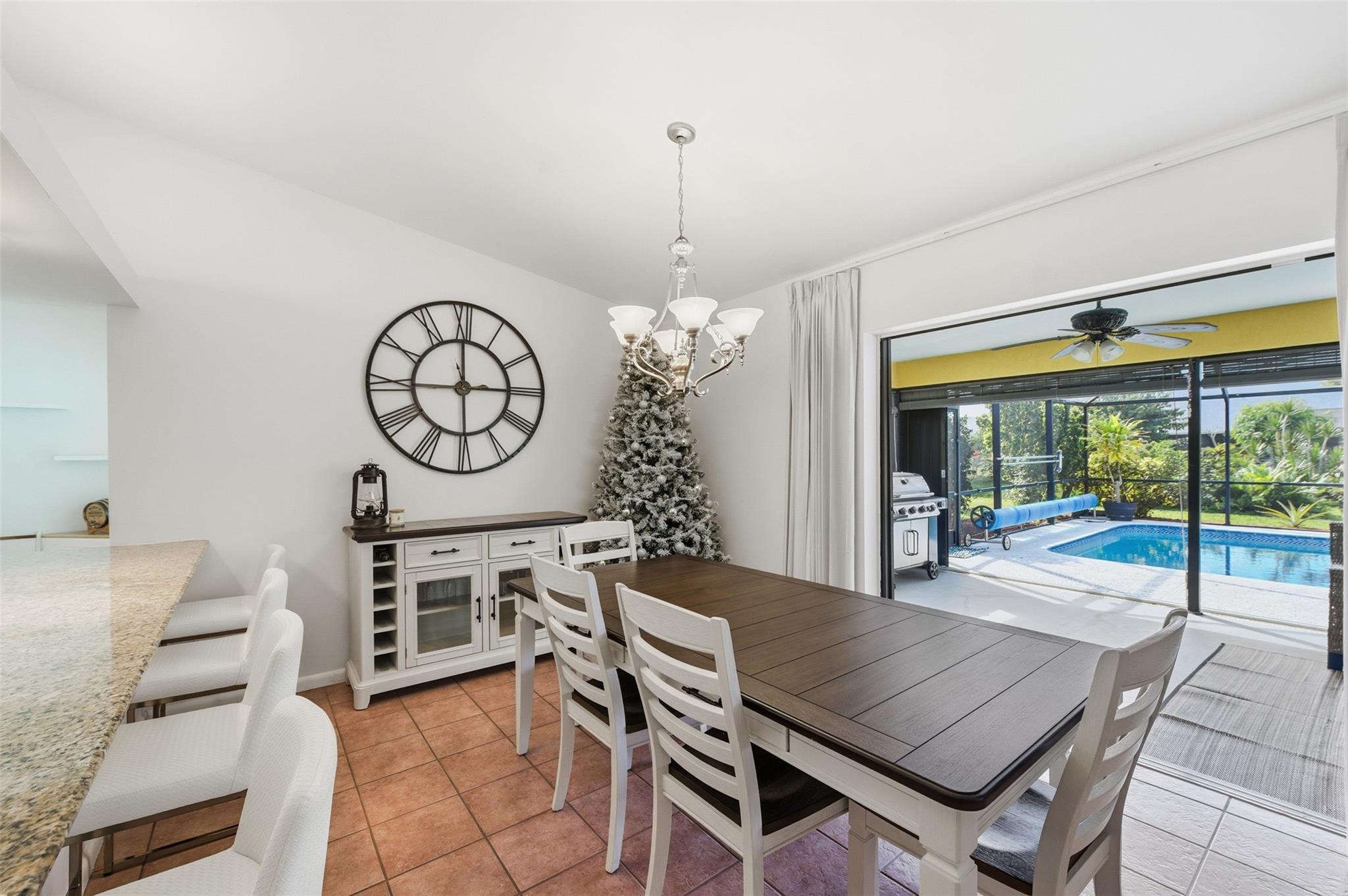 Experience refined living in this beautifully maintained Sandpiper Bay 3/2/2 pool home, freshly painted inside and enhanced with 24-hour camera surveillance and ADT security. This bright split floor plan offers a spacious living area with pocket sliders leading to your own private oasis—an inviting heated saltwater pool surrounded by tropical landscaping and fruit trees. The updated kitchen features granite countertops, stainless steel appliances, and a new washer and dryer. The primary suite includes a walk-in California Closet, while guest bedrooms showcase new tile flooring and a convenient pool-access bath. Major upgrades include Roof 2022, WH 2022, AC 2021, Pool Heater 2020, Bahama Shutters 2019, and Partial Hurricane Windows 2019. Minutes to Jensen Beach and historic downtown Stuart.