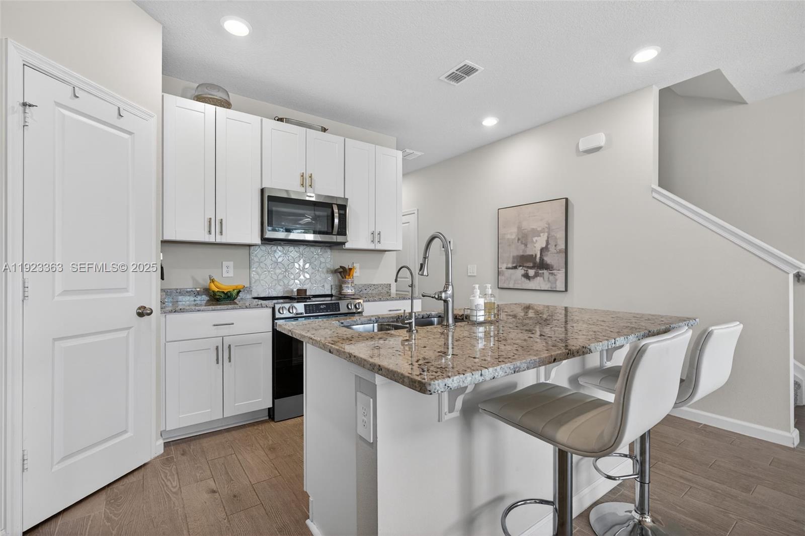 Step into this picturesque, energy-efficient 2024-built townhome, situated in a prime location with a low HOA. Filled with natural light, this property offers a serene backdrop with some of the best lakeside views in the community from the kitchen, dining room, and primary suite. The upgraded kitchen showcases a new oven with air-fry and convection capabilities, complemented by sleek stainless steel appliances, a custom backsplash, and granite countertops in kitchen and bathrooms. A built-in reverse osmosis water filter provides unlimited purified water. Step outside to a spacious extended patio--your hidden oasis nestled in nature. Birdwatch, entertain, or savor the serene sunrise over the lake while enjoying your coffee al fresco. Upstairs, the bright, open layout features a versatile loft, spacious primary bedroom with ensuite, two additional bedrooms, a full bath, and conveniently located laundry room. Smart home features include cameras, video doorbell, alarm system, and app-controlled garage and locks. Additional highlights include impact windows and doors, new ceiling fans, garage with double driveway, and a thoughtfully designed energy-efficient layout for lasting comfort and savings. The pet-friendly community offers a gated entry and refreshing pool, all just minutes from I-95 and the beach. Flexible terms are available—sellers can close quickly or accommodate an extended closing. Schedule your private showing today and discover the lifestyle that awaits!