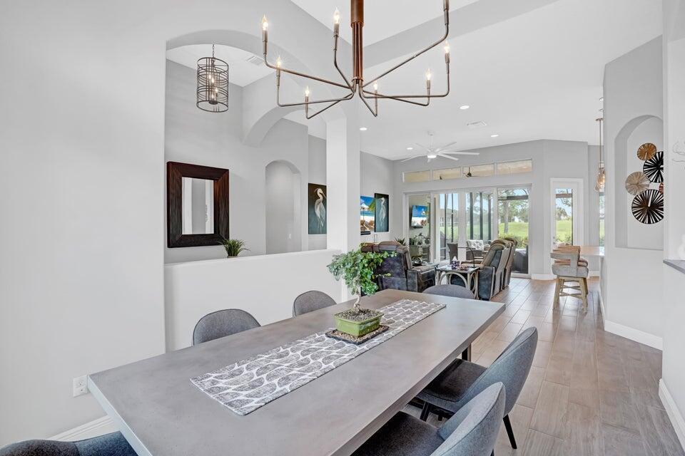 Stunning 3 bedroom, 3 bathroom GHO built pool home in the desirable Meadowood community. Designer style screened-in saltwater and heated pool with bench seating and jets. The home features an open main living area and split bedroom floor plan. Kitchen features quartz counter tops, subway tile backsplash, crown molding on the cabinets, a center island and breakfast nook overlooking the pool. Separate dining room with volume ceilings and archway details. The guest bedrooms feature crown molding and plantation shutters. Primary bedroom retreat is located on its own side of the home. The large bedroom features a tray ceiling, plantation shutters and a door to the back patio and pool area.
