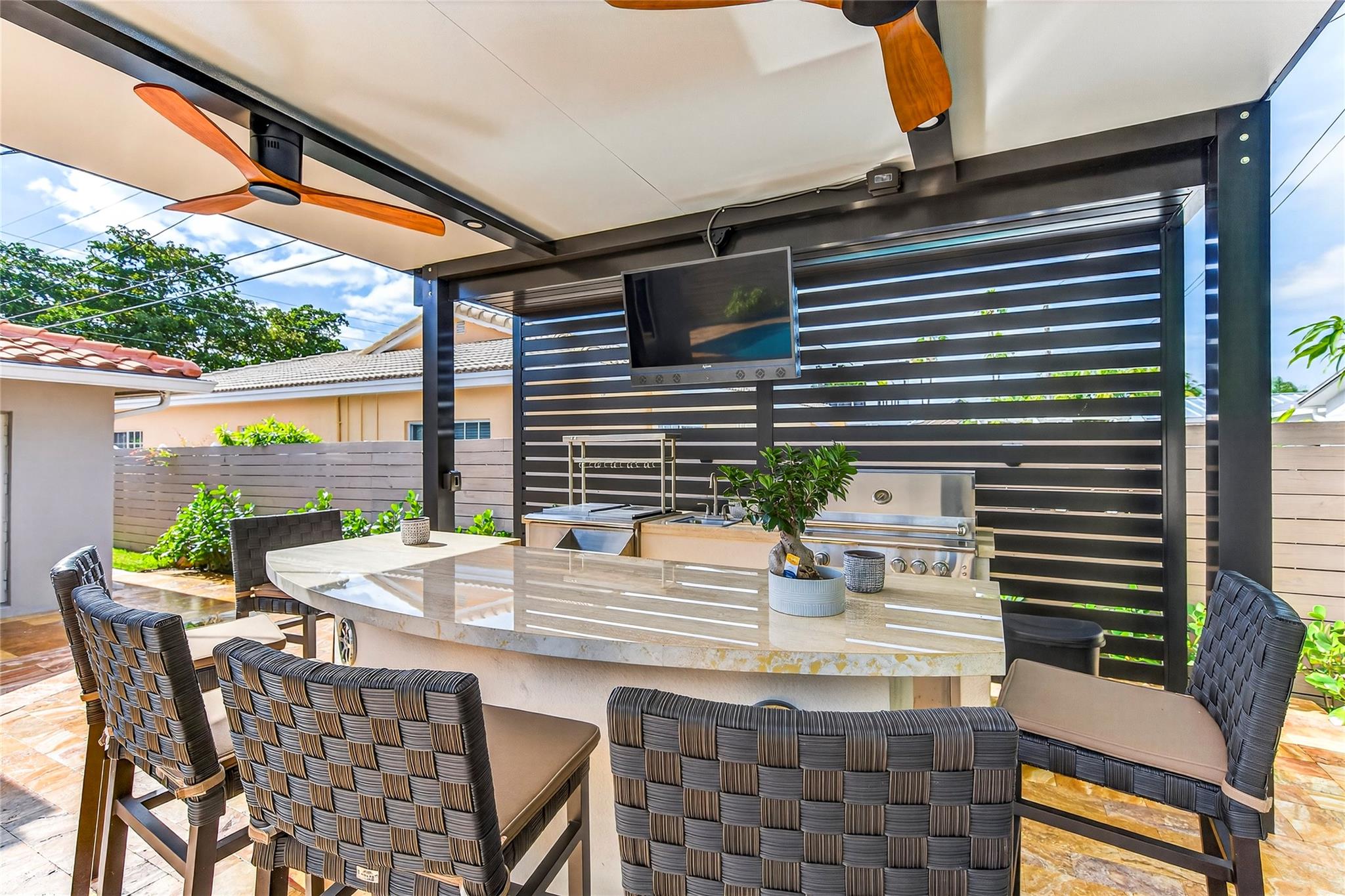 Stunningly IMPRESSIVE 2 bed/2 bath with too many inside and exterior upgrades to list. Nestled in the heart of Poinsettia Heights its a must see!! Interior Upgrades offering: Kitchen Counters & Appliances, Bathrooms, HVAC system, Electrical, Washer/ Dryer, Walk in closets and bathrooms, freshly painted throughout, a true wood burning chimney!. Exterior: Hurricane Impact windows, New drain gutters, Pool area refinished/sealed, New pool motor, landscaping. Outdoor Kitchen- wine fridge, flat screen tv, blue tooth speakers, fans, built in grill, sink, and recessed lighting, New landscaping and irrigation system, Outdoor lighting remote controlled, Driveway and roof recently pressure cleaned and sealed. LARGER THEN TAX ROLL! Drive, walk or bike to beach it's so close. Nearby shopping also!