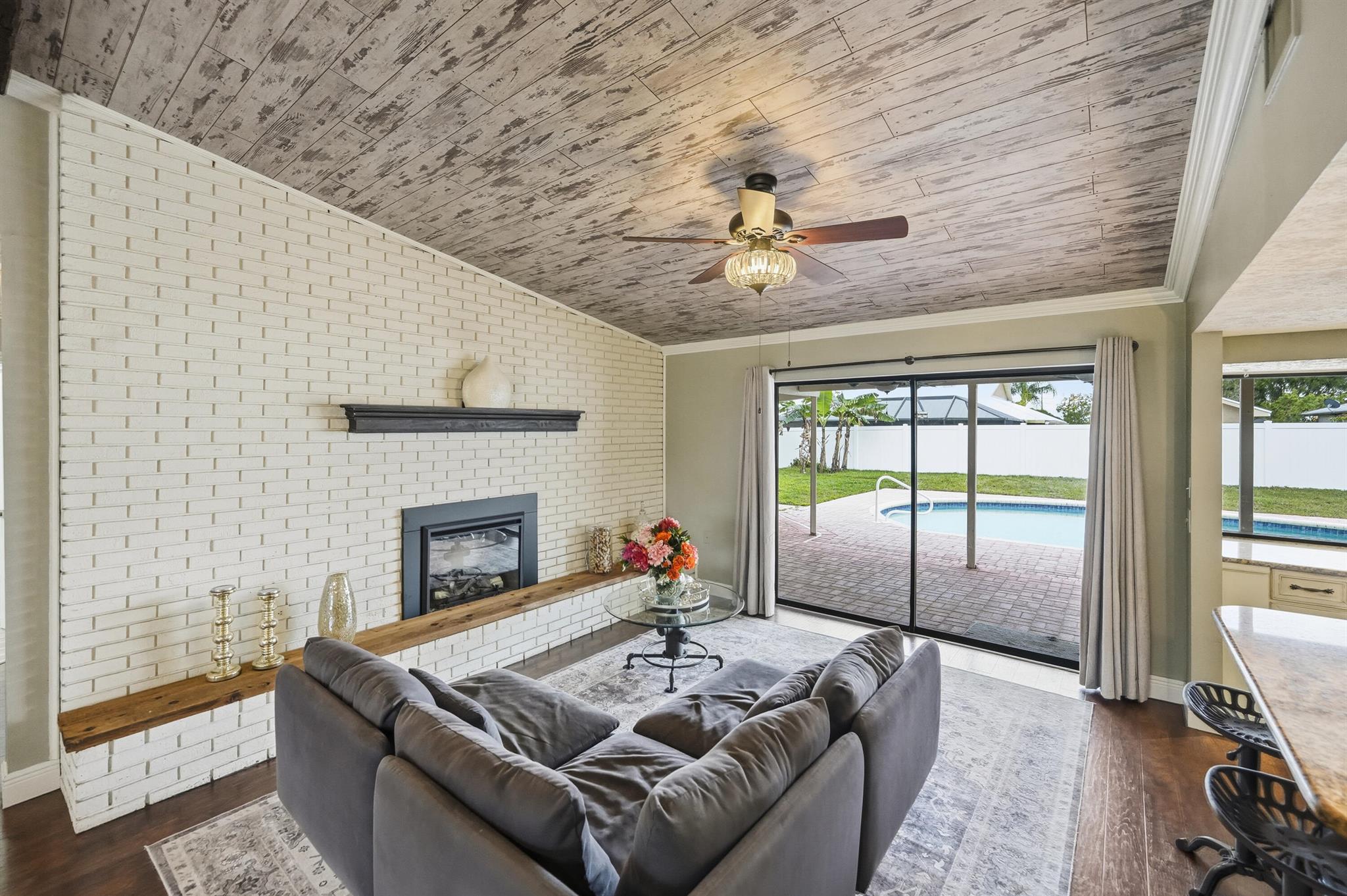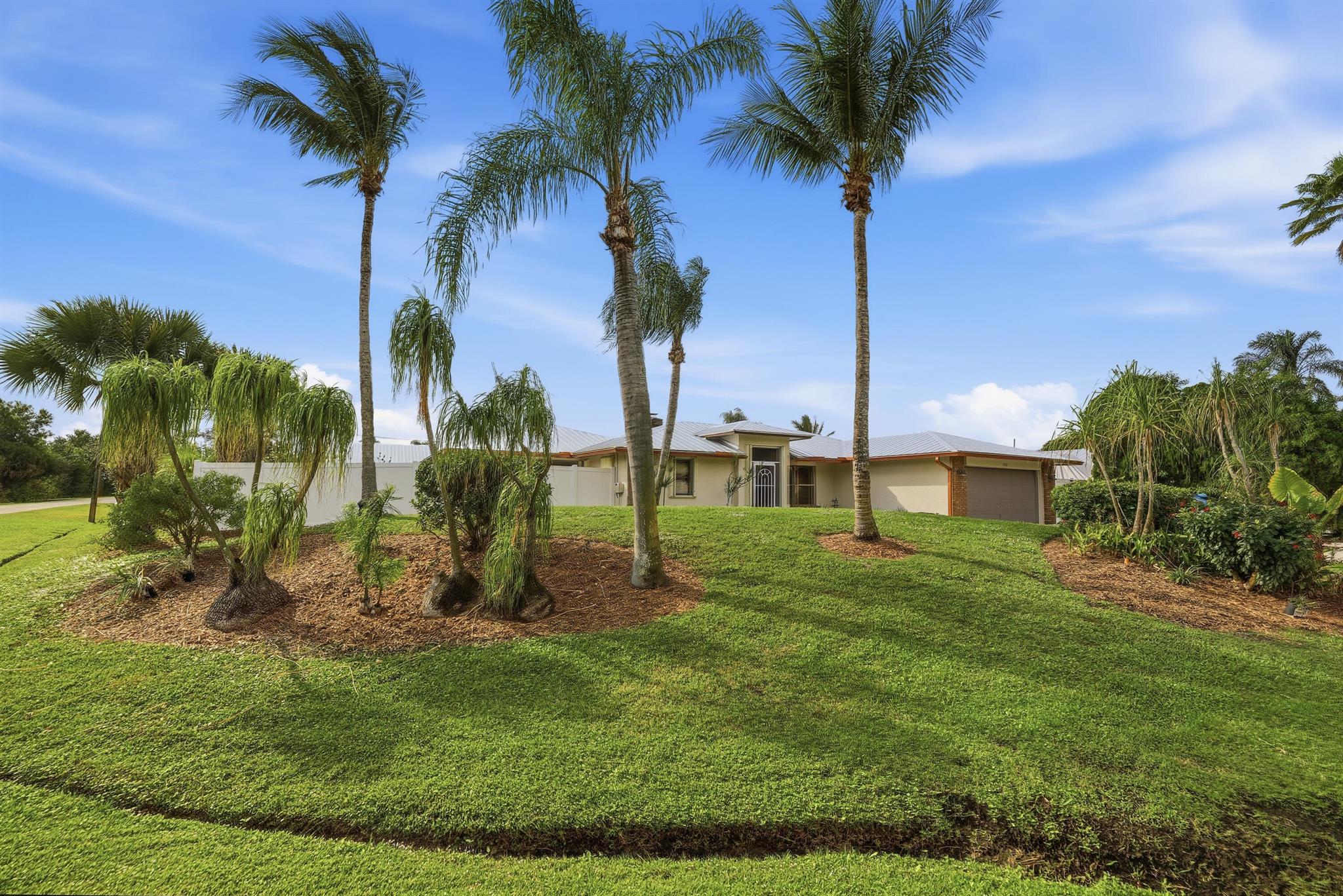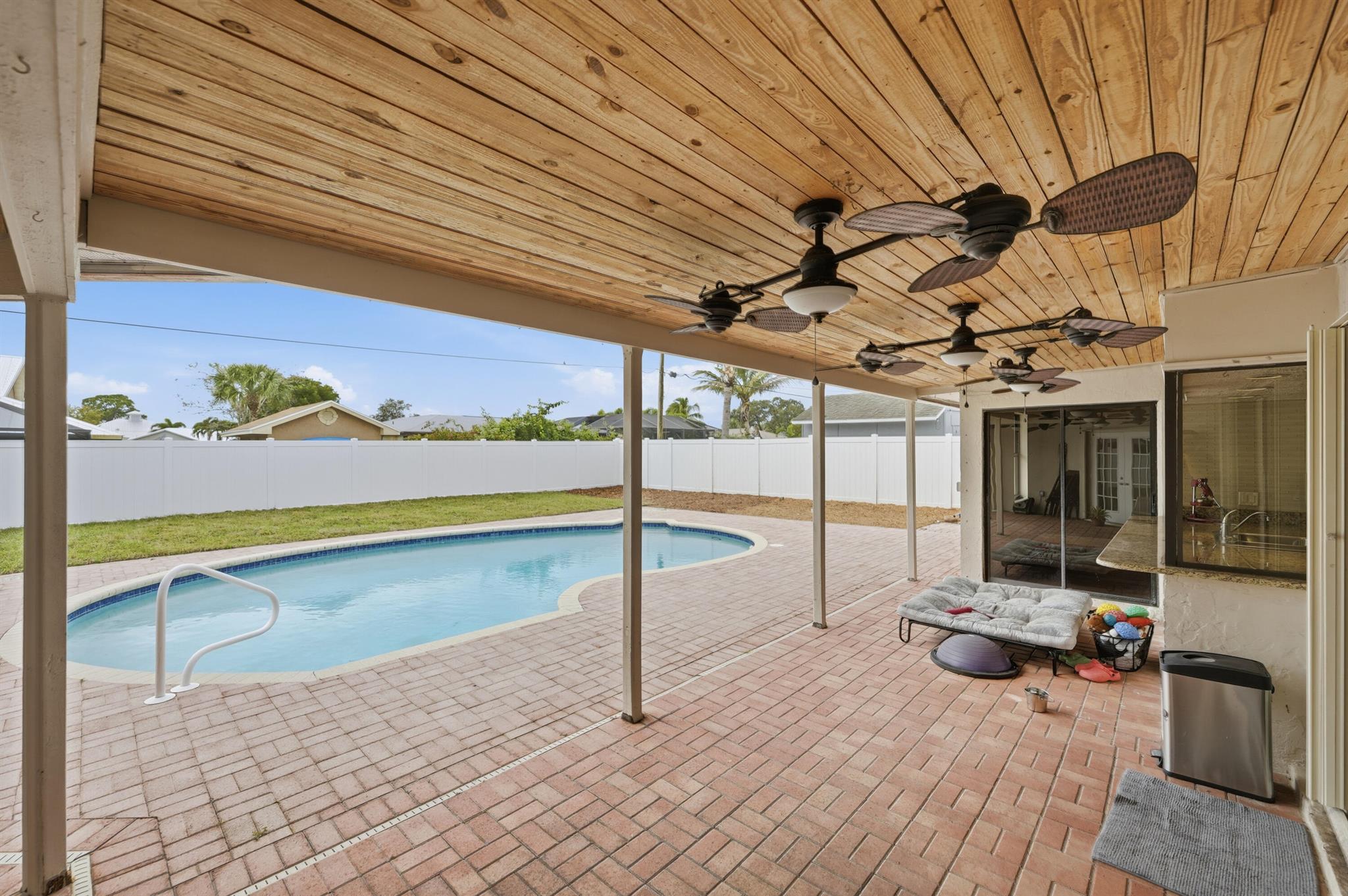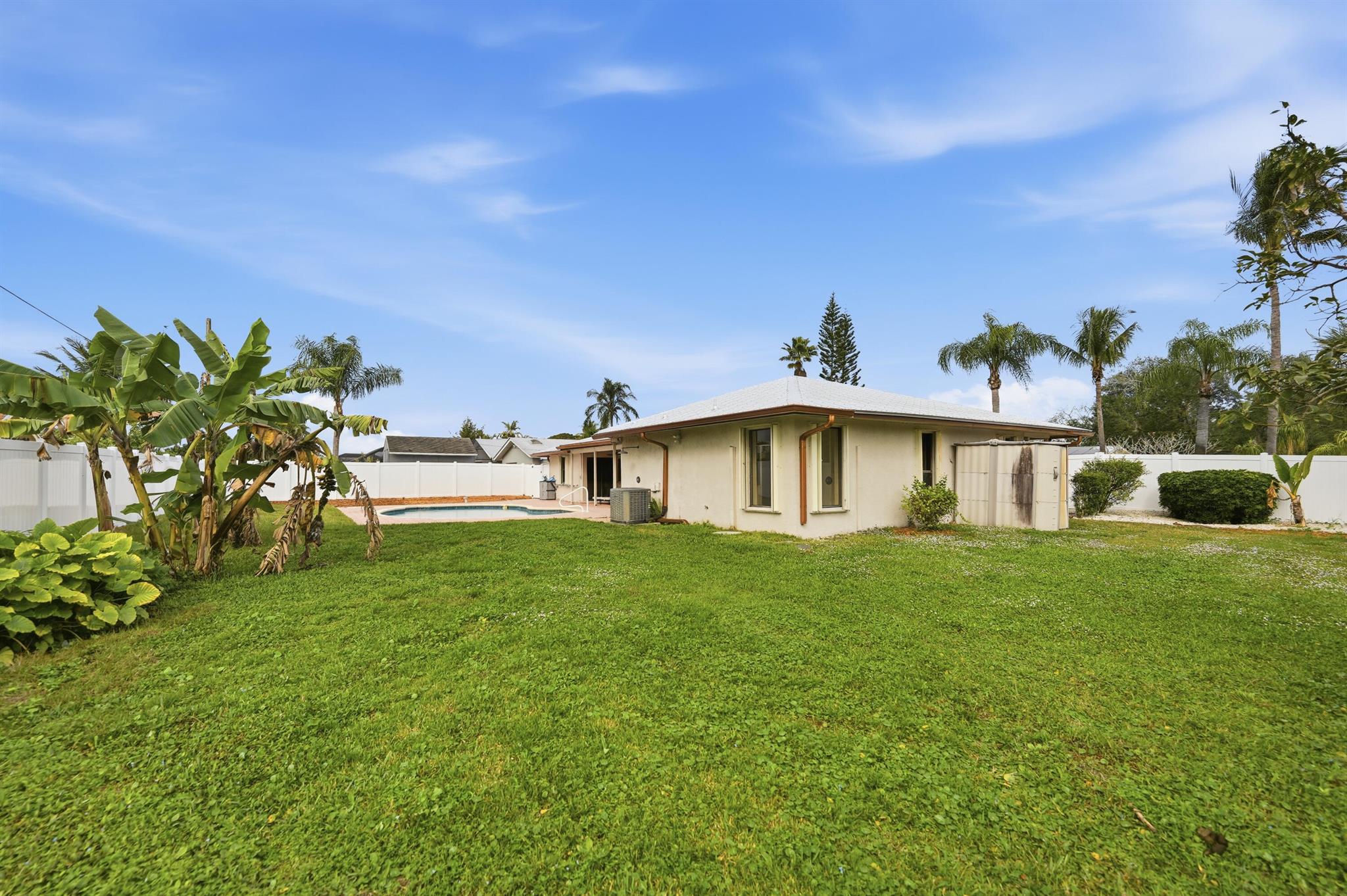 A beautifully maintained 3/bed, 3/bath Florida home, w/ a fully fenced corner lot a private pool & spacious covered patio. The home has city water/sewer, & a sprinkler system on a well. A hard-wired 30-amp exterior outlet for generator use or RV. The home has shiplap vaulted ceilings & wood laminate flooring throughout. The formal dining room leads to an upgraded kitchen featuring granite countertops & quality cabinetry, flowing into a warm great room w/ a fireplace. Oversized sliding doors open to the backyard, offering the ideal indoor outdoor living experience. Primary suite serves as a true retreat w/dual vanities, double rain-head shower, & an adjacent atrium sauna for spa-like relaxation. Both guest bathrooms have upgraded cabinetry, this home as stylish & functional.