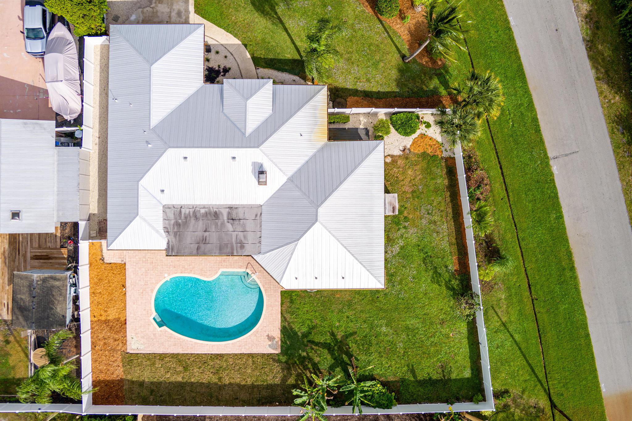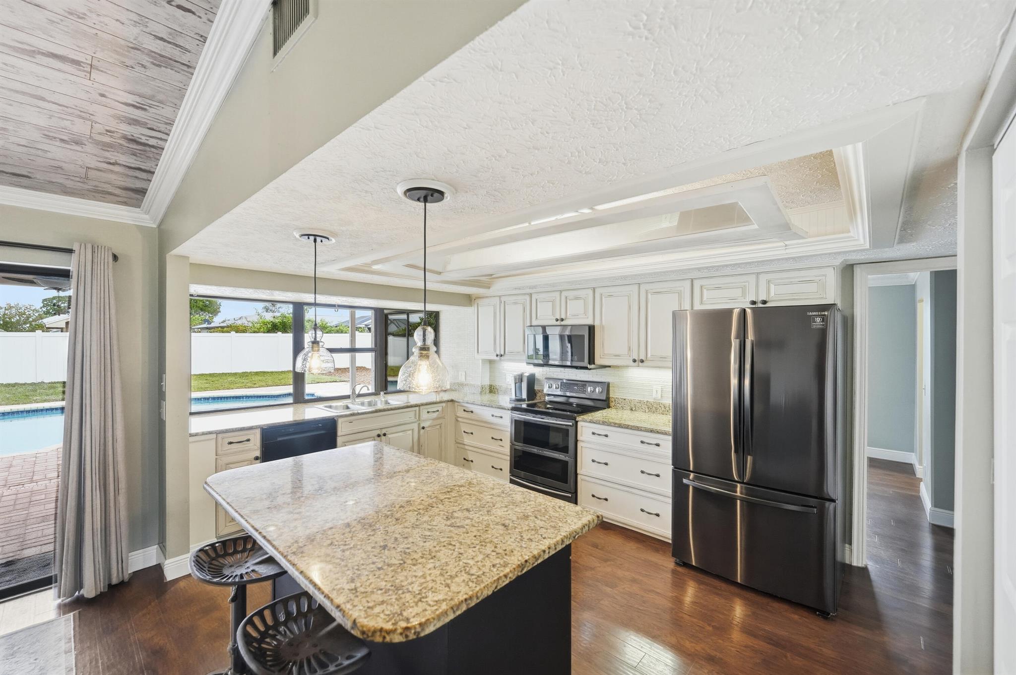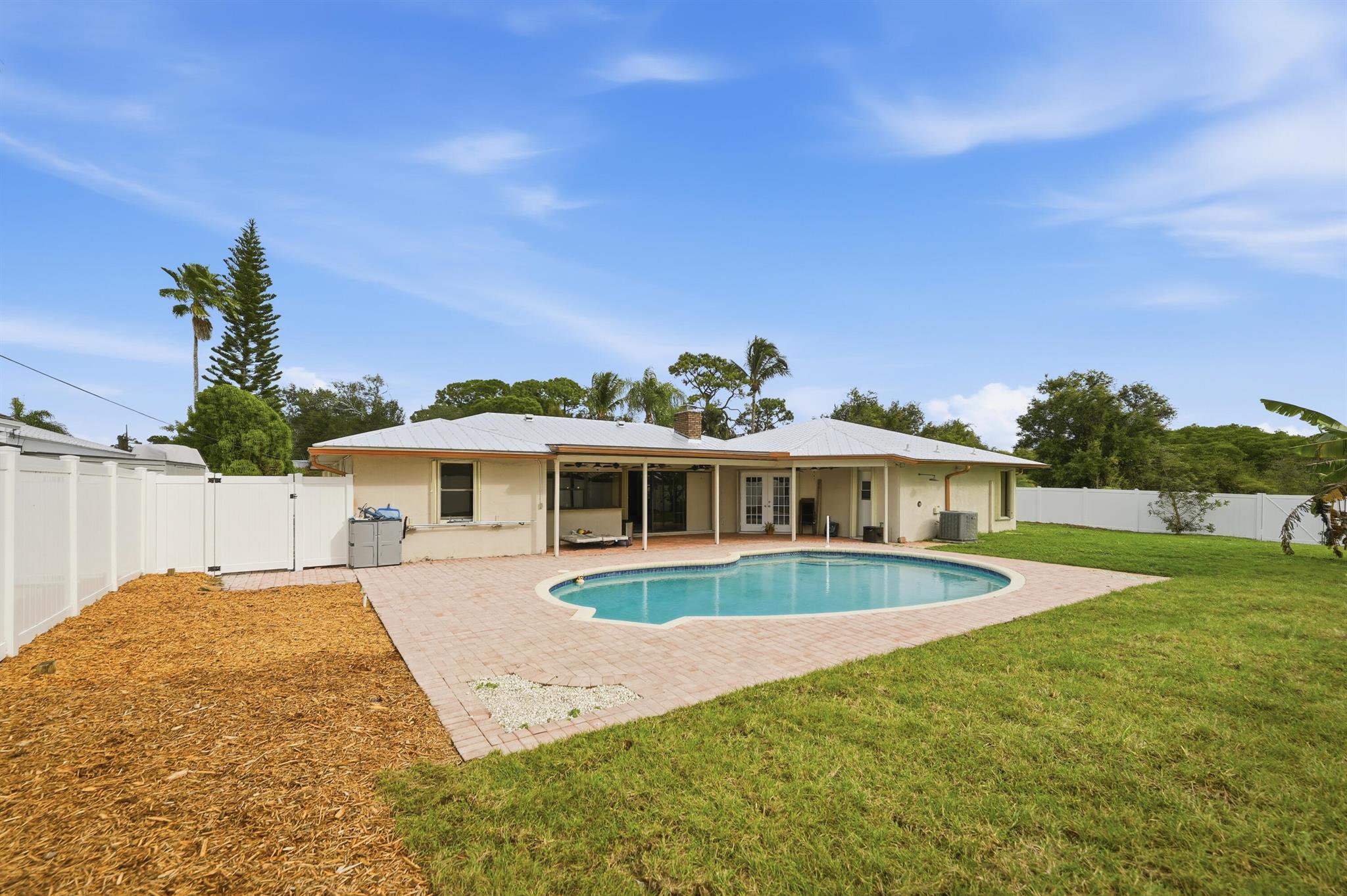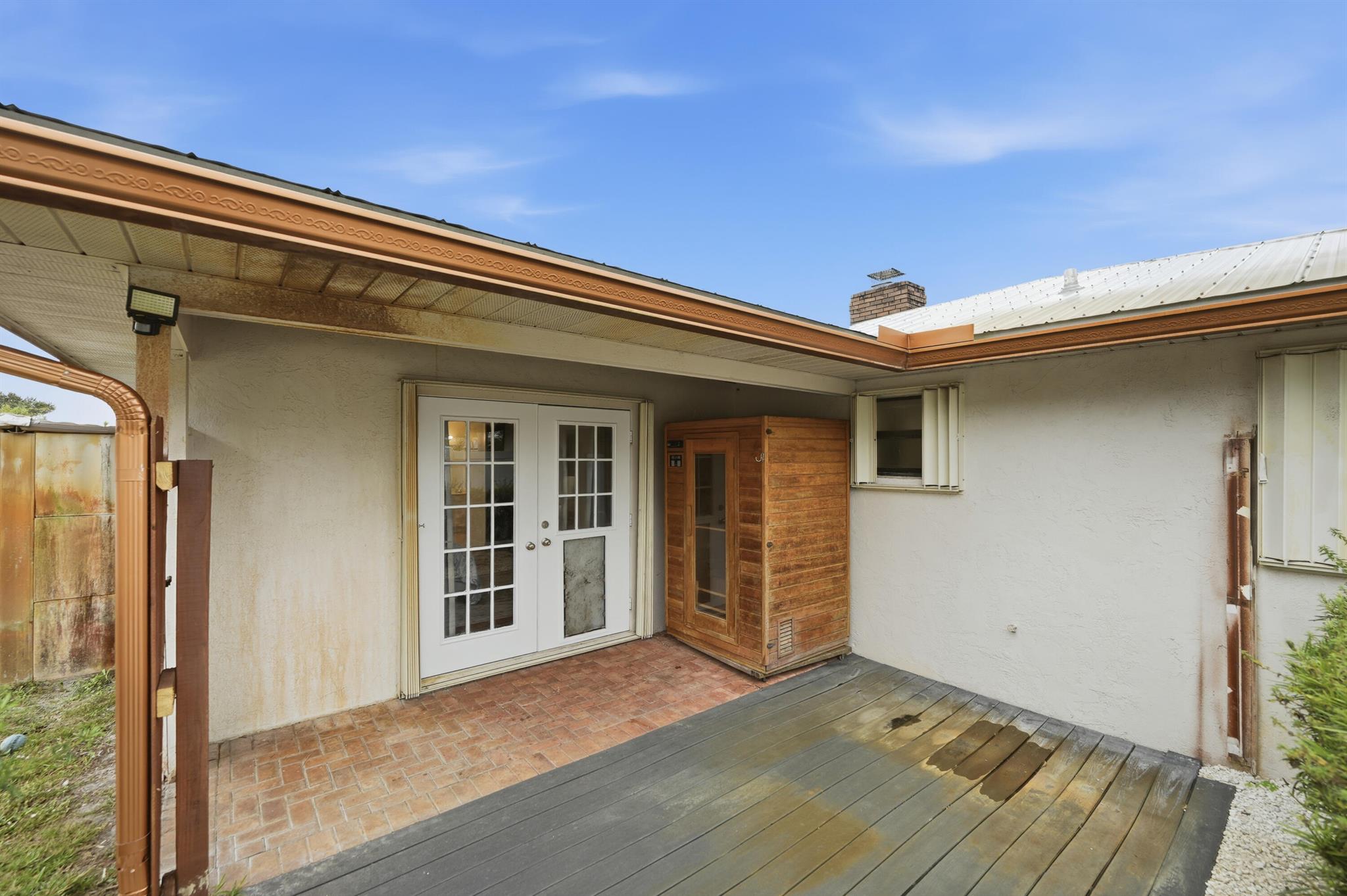 A beautifully maintained 3/bed, 3/bath Florida home, w/ a fully fenced corner lot a private pool & spacious covered patio. The home has city water/sewer, & a sprinkler system on a well. A hard-wired 30-amp exterior outlet for generator use or RV. The home has shiplap vaulted ceilings & wood laminate flooring throughout. The formal dining room leads to an upgraded kitchen featuring granite countertops & quality cabinetry, flowing into a warm great room w/ a fireplace. Oversized sliding doors open to the backyard, offering the ideal indoor outdoor living experience. Primary suite serves as a true retreat w/dual vanities, double rain-head shower, & an adjacent atrium sauna for spa-like relaxation. Both guest bathrooms have upgraded cabinetry, this home as stylish & functional.