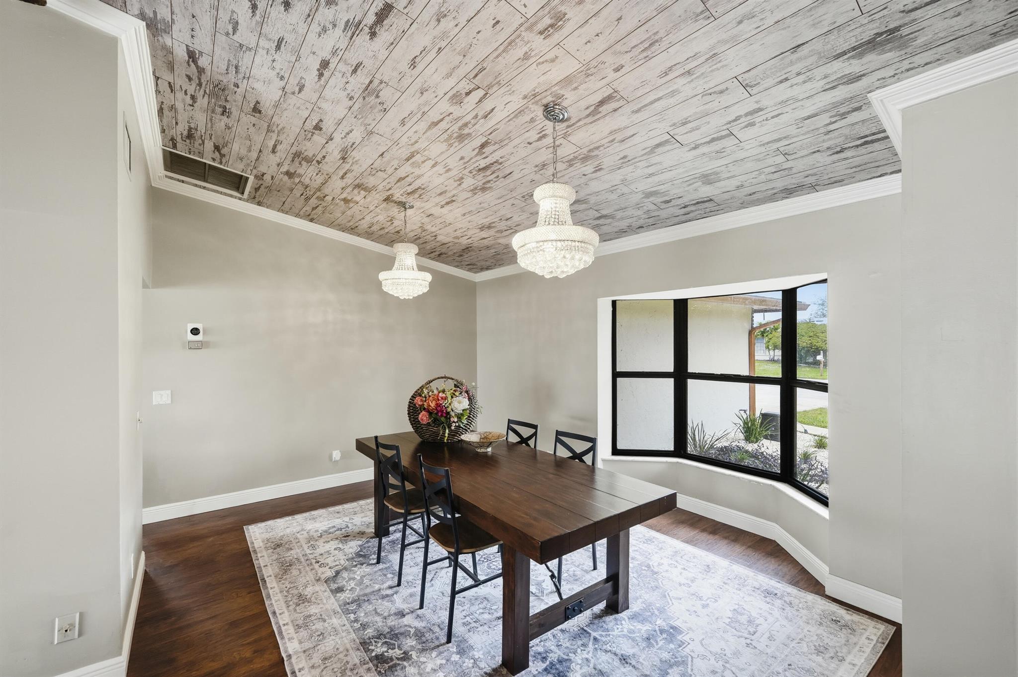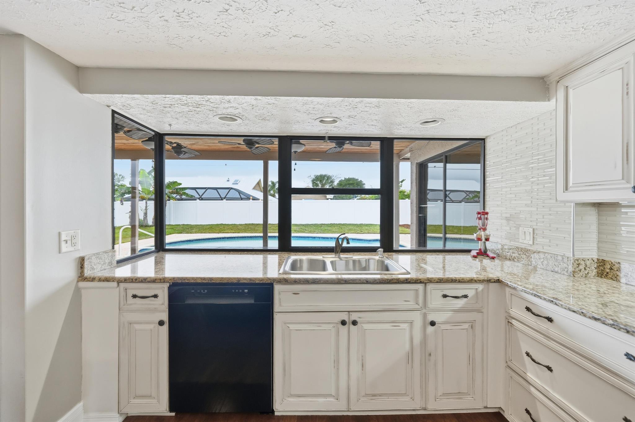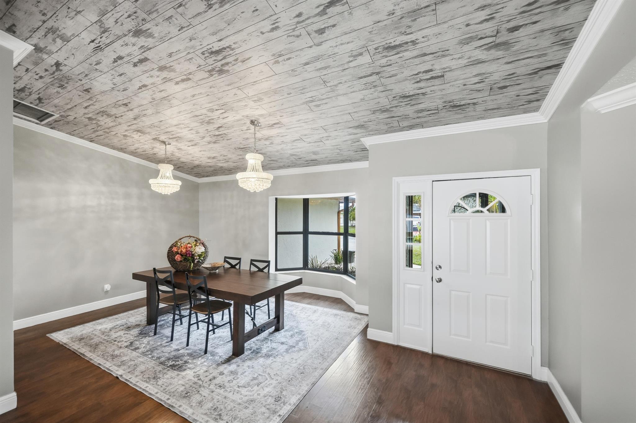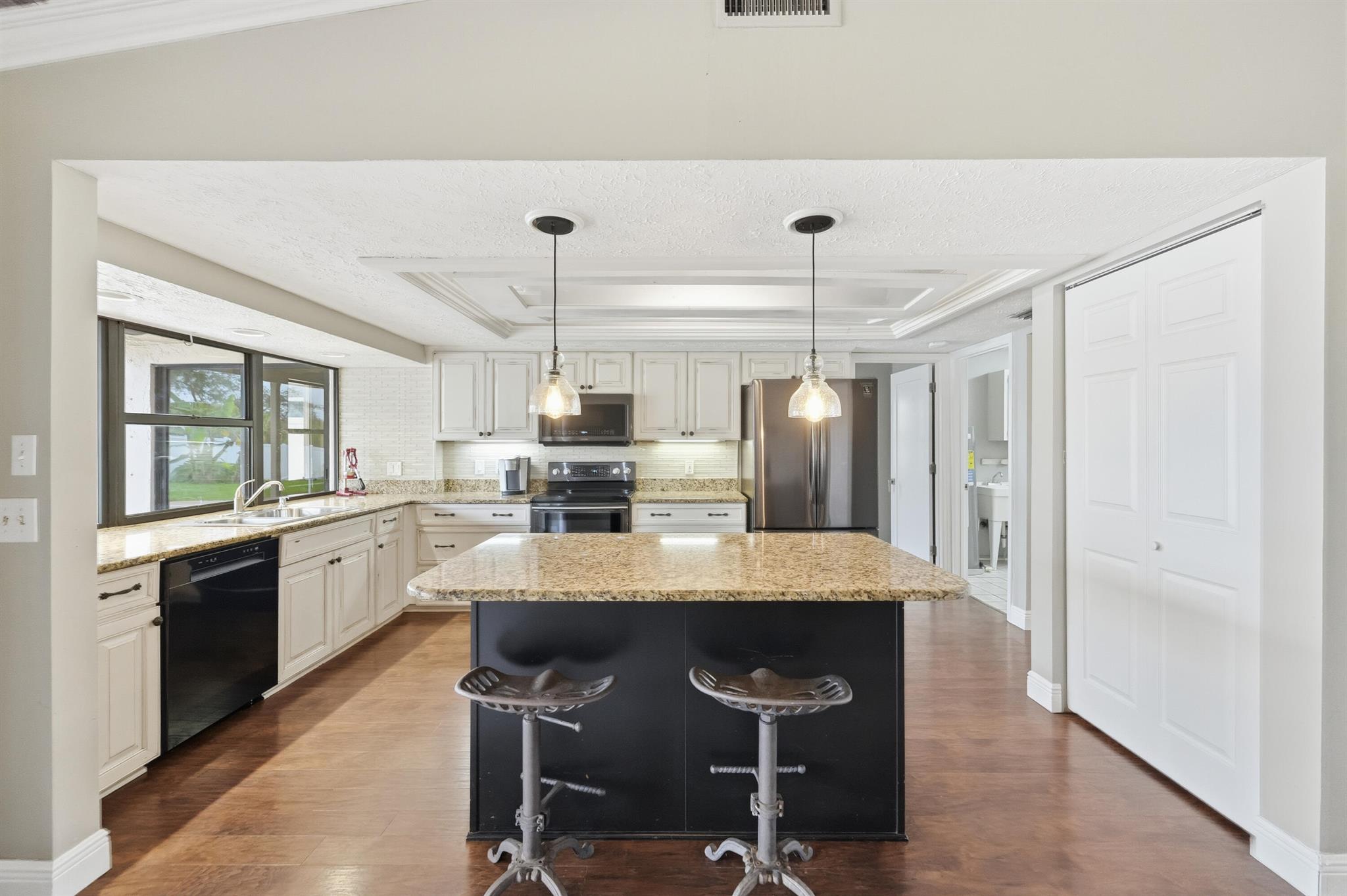 A beautifully maintained 3/bed, 3/bath Florida home, w/ a fully fenced corner lot a private pool & spacious covered patio. The home has city water/sewer, & a sprinkler system on a well. A hard-wired 30-amp exterior outlet for generator use or RV. The home has shiplap vaulted ceilings & wood laminate flooring throughout. The formal dining room leads to an upgraded kitchen featuring granite countertops & quality cabinetry, flowing into a warm great room w/ a fireplace. Oversized sliding doors open to the backyard, offering the ideal indoor outdoor living experience. Primary suite serves as a true retreat w/dual vanities, double rain-head shower, & an adjacent atrium sauna for spa-like relaxation. Both guest bathrooms have upgraded cabinetry, this home as stylish & functional.