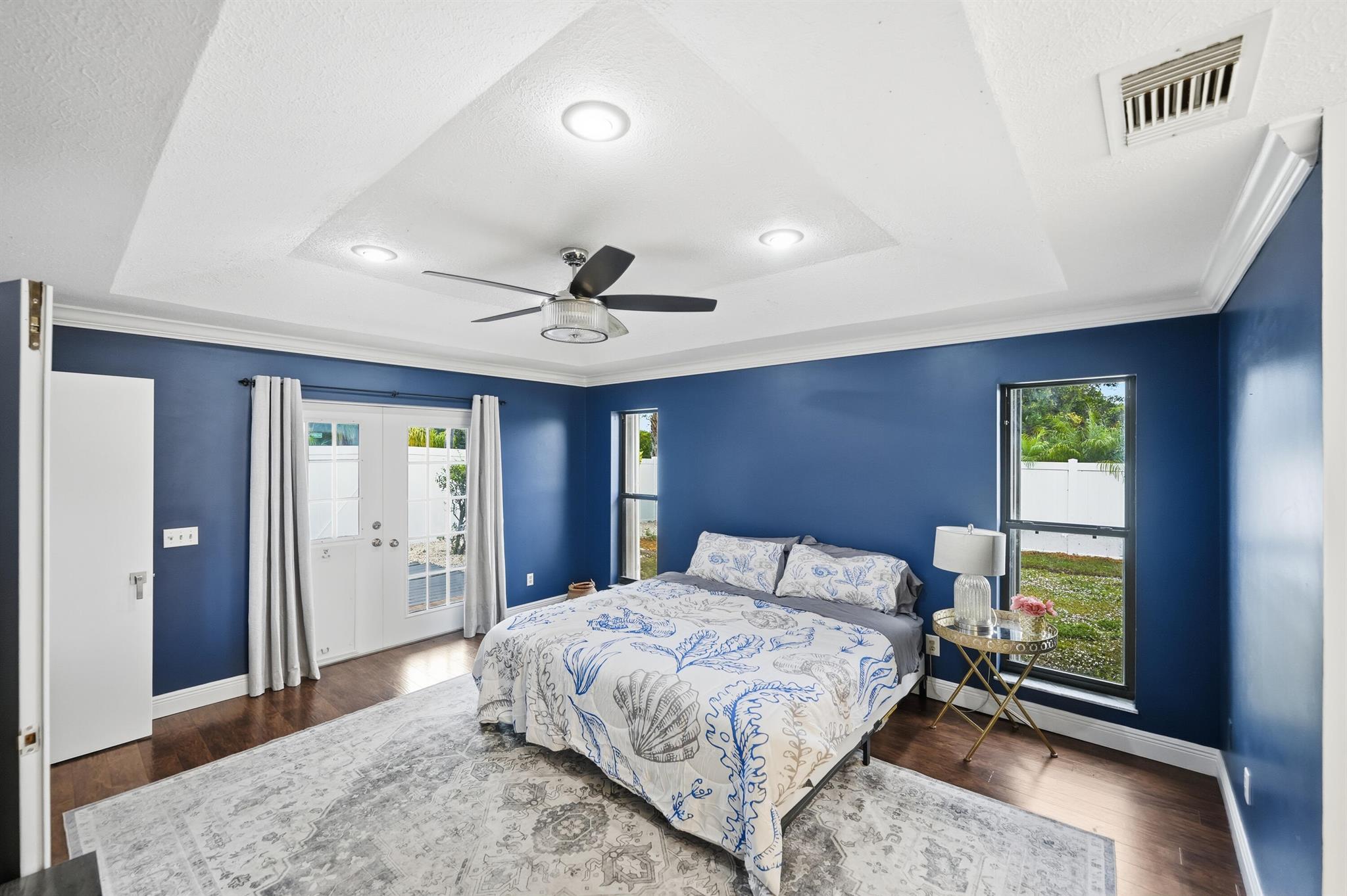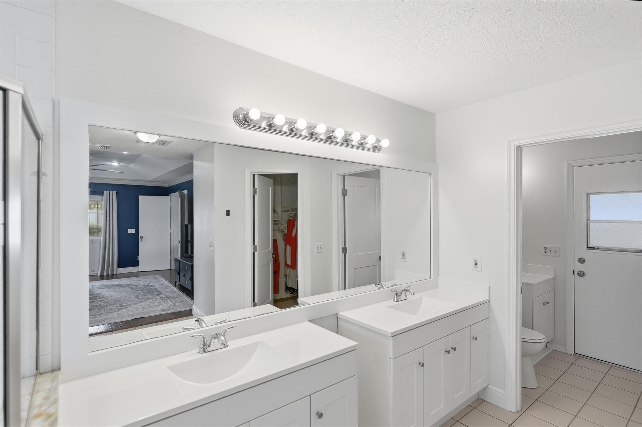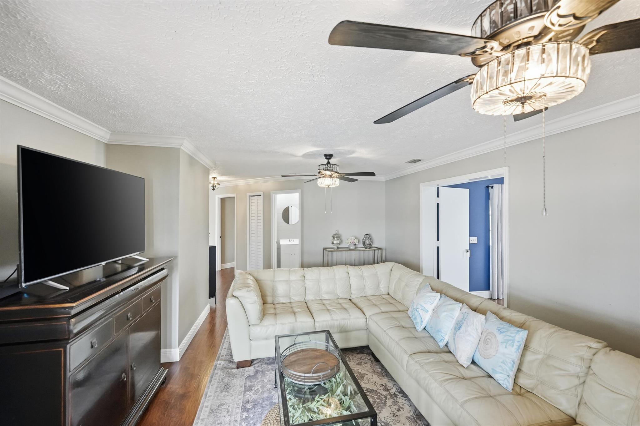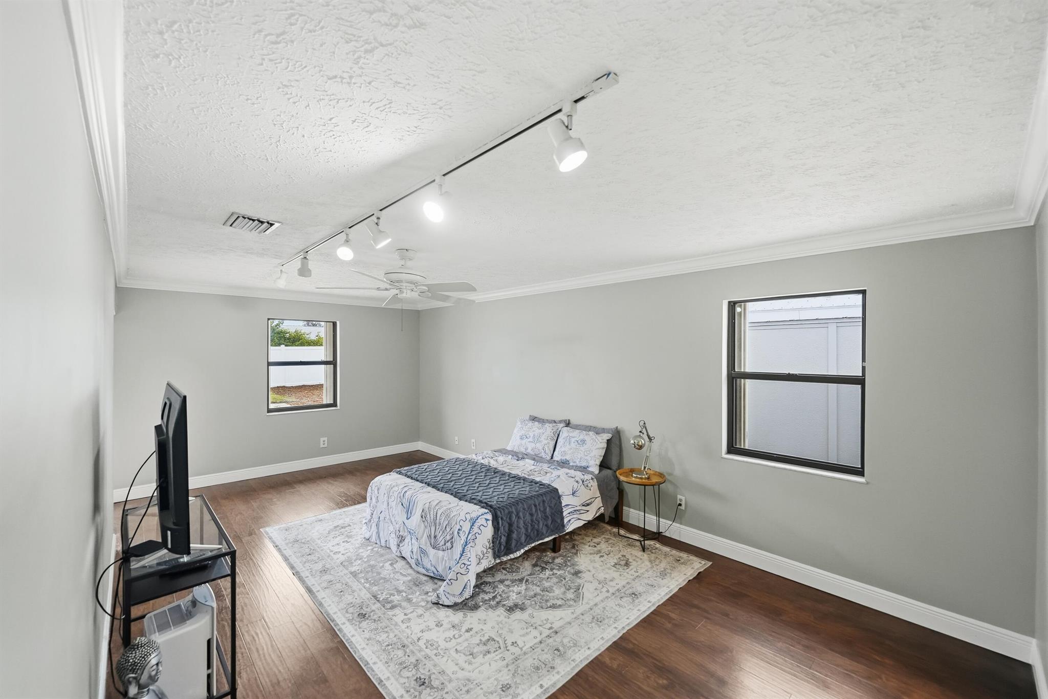 A beautifully maintained 3/bed, 3/bath Florida home, w/ a fully fenced corner lot a private pool & spacious covered patio. The home has city water/sewer, & a sprinkler system on a well. A hard-wired 30-amp exterior outlet for generator use or RV. The home has shiplap vaulted ceilings & wood laminate flooring throughout. The formal dining room leads to an upgraded kitchen featuring granite countertops & quality cabinetry, flowing into a warm great room w/ a fireplace. Oversized sliding doors open to the backyard, offering the ideal indoor outdoor living experience. Primary suite serves as a true retreat w/dual vanities, double rain-head shower, & an adjacent atrium sauna for spa-like relaxation. Both guest bathrooms have upgraded cabinetry, this home as stylish & functional.