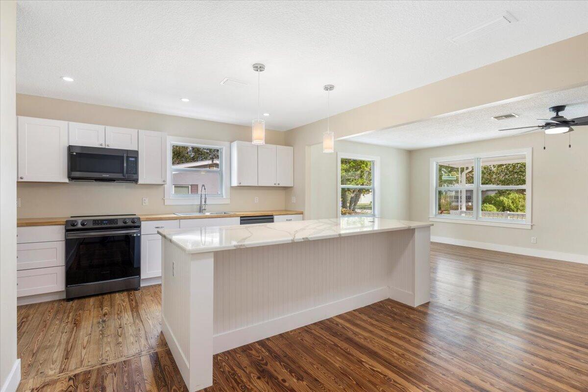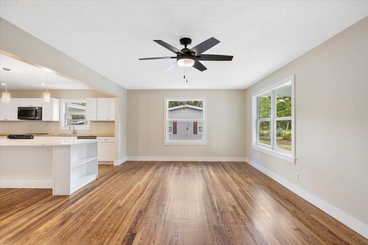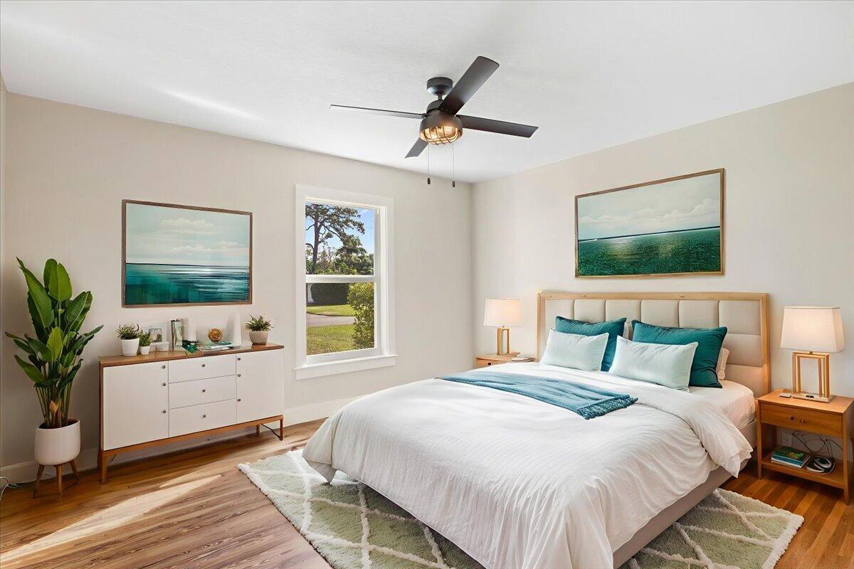 Completely reimagined and beautifully renovated, this downtown dream cottage blends modern styling with timeless character, all just 4.7 miles from the beach. With no HOA, you'll enjoy the freedom to park your boat, trailer, or extra vehicles right at home, adding lifestyle flexibility that's rare this close to town.A 2023 metal roof and impact windows provide energy efficiency, sound softening, and excellent insurance advantages, while a thoughtfully redesigned floor plan enhances openness and flow. Rich hardwood floors lead into a stunning chef inspired kitchen centered around an impressive 8+ ft quartz island, perfect for gatherings, meal prep, and bar style seating.
