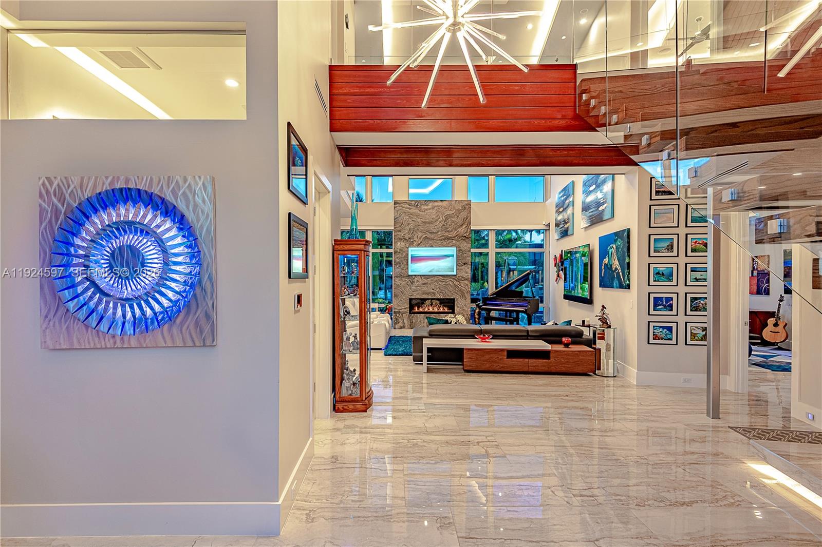 A striking modern waterfront estate completed in 2019 by Barron Construction and architect Kevin Akey. Expertly elevated on 54 pilings, this residence seamlessly blends cutting-edge technology with refined design, featuring Control4 smart-home automation, Sonos audio, a whole-house generator, and exceptional custom finishes throughout. Dramatic 23-foot ceilings, a sculptural floating staircase, and a sleek glass walkway create a breathtaking architectural statement. The chef’s kitchen is outfitted with Sub-Zero and JennAir appliances, while the first-floor primary suite delivers a true spa-like retreat. Outdoor living is equally impressive, offering an 80-foot Trex dock with direct ocean access, a resort-style heated pool and spa, manicured turf grounds, and a gated driveway accommodating up to 11 vehicles.