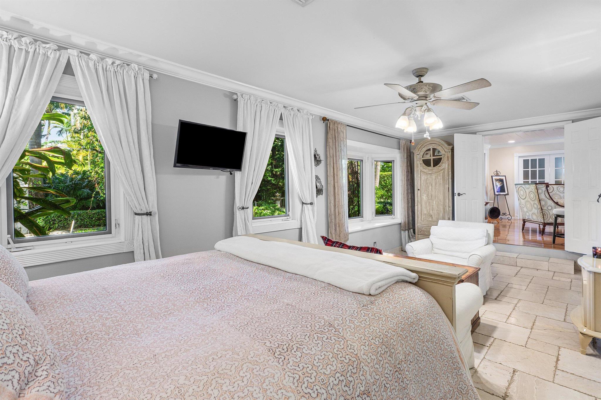 Tucked behind an arched gate on one of Palm Trail's most coveted streets - just two blocks from vibrant Atlantic Avenue and only steps from the Intracoastal - this charming single-story residence with attached guest house sits on a beautifully landscaped lot just shy of 14,000 square feet (approximately 100' x 140'). This is an exceptional offering in the heart of Delray Beach.Surrounded by lush, storybook gardens, the property offers a true sense of retreat with winding flagstone paths and mature tropical plantings. A meandering stone walkway leads to the main entrance and a well-planned split floor plan featuring two spacious primary suites - one with an oversized dressing room/nursery - and a versatile third bedroom ideal as a home office or guest room.