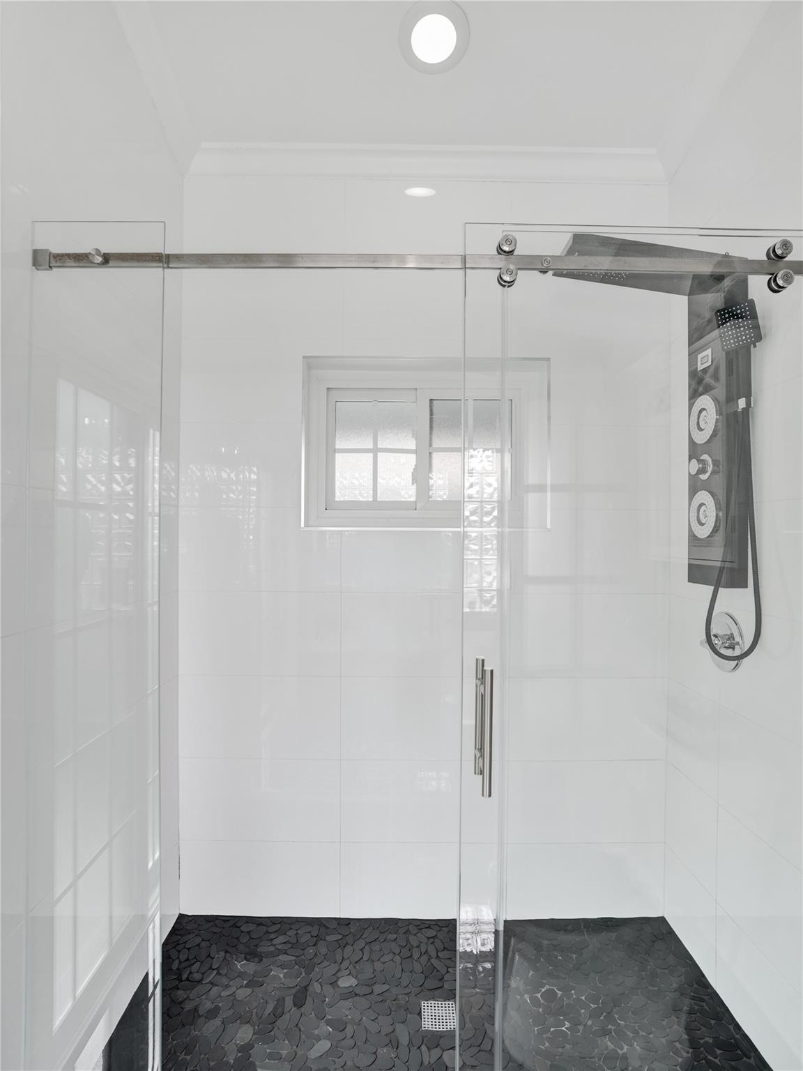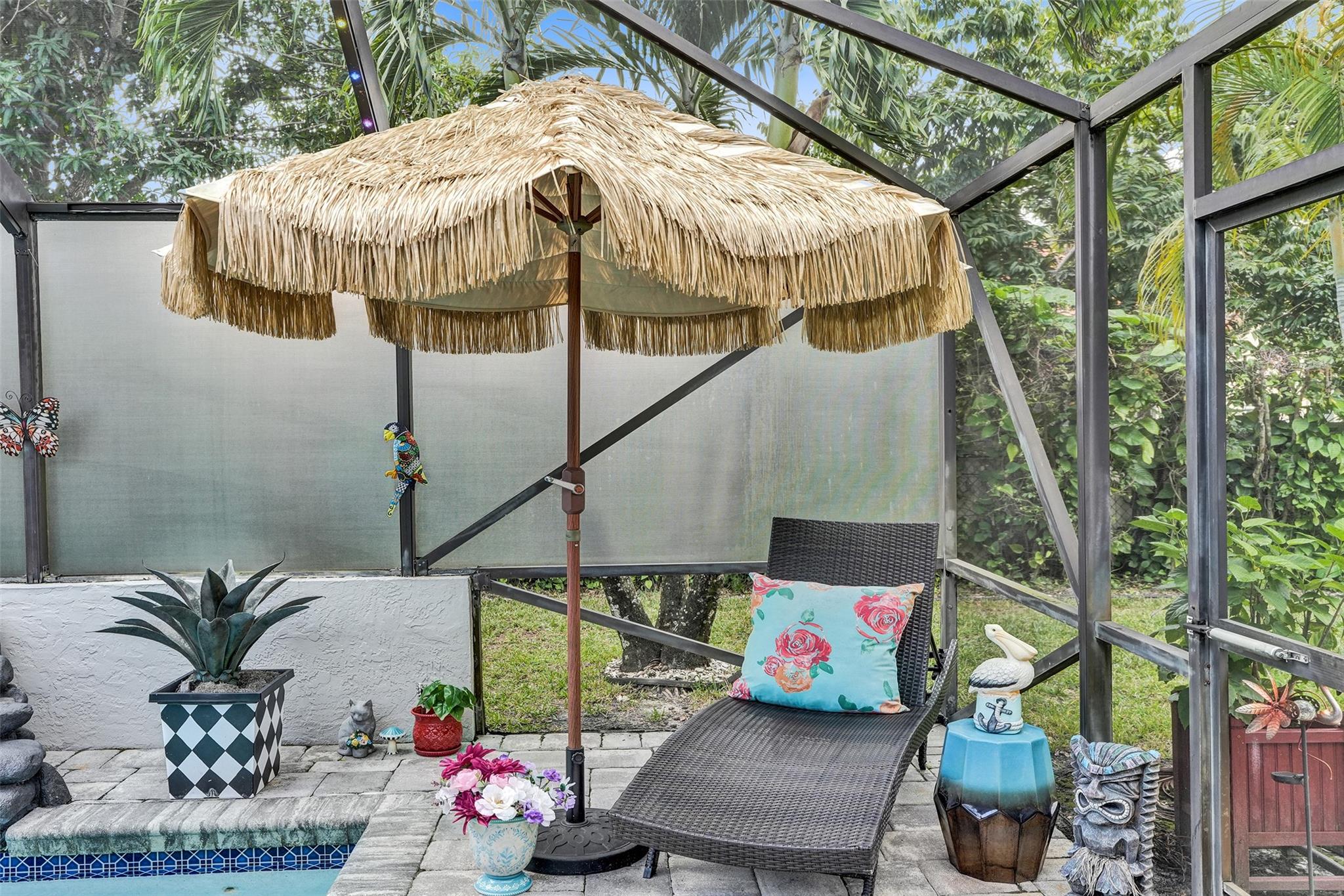 Beautifully renovated 4 bedroom, 2.5 bath home with high ceilings, abundant natural light, and views of a stunning pool area. Pool is heated. The spacious open living area flows into an oversized modern kitchen featuring vaulted ceilings, a large island, quartz countertops, wine chiller, and white and blonde cabinetry. Stylish upgrades include an electric fireplace, stone accent walls, custom neon lighting, and modern fixtures. The renovated primary suite offers a spa tub and separate shower. Porcelain flooring enhances the main living areas, with laminate floors in the bedrooms and new ceiling fans throughout. Additional highlights include an oversized garage, fenced yard, new plumbing and A/C ductwork in 2025, impact windows in most of the home (2025), A/C from 2017, and a 2006 roof.