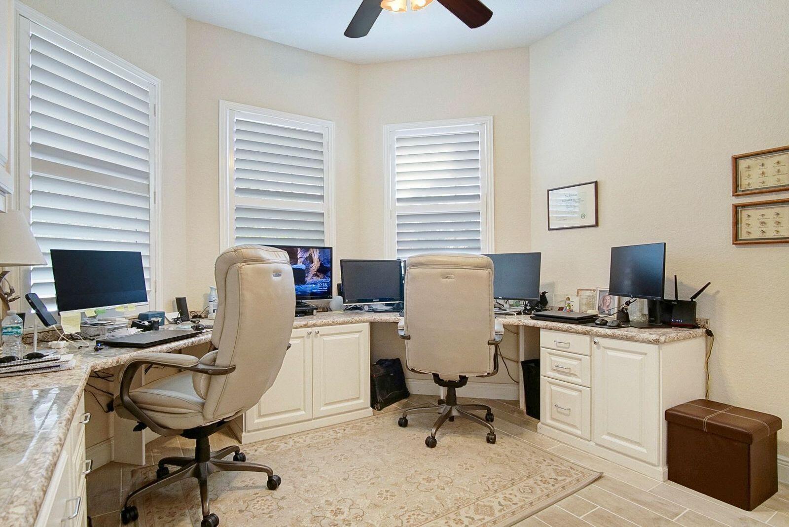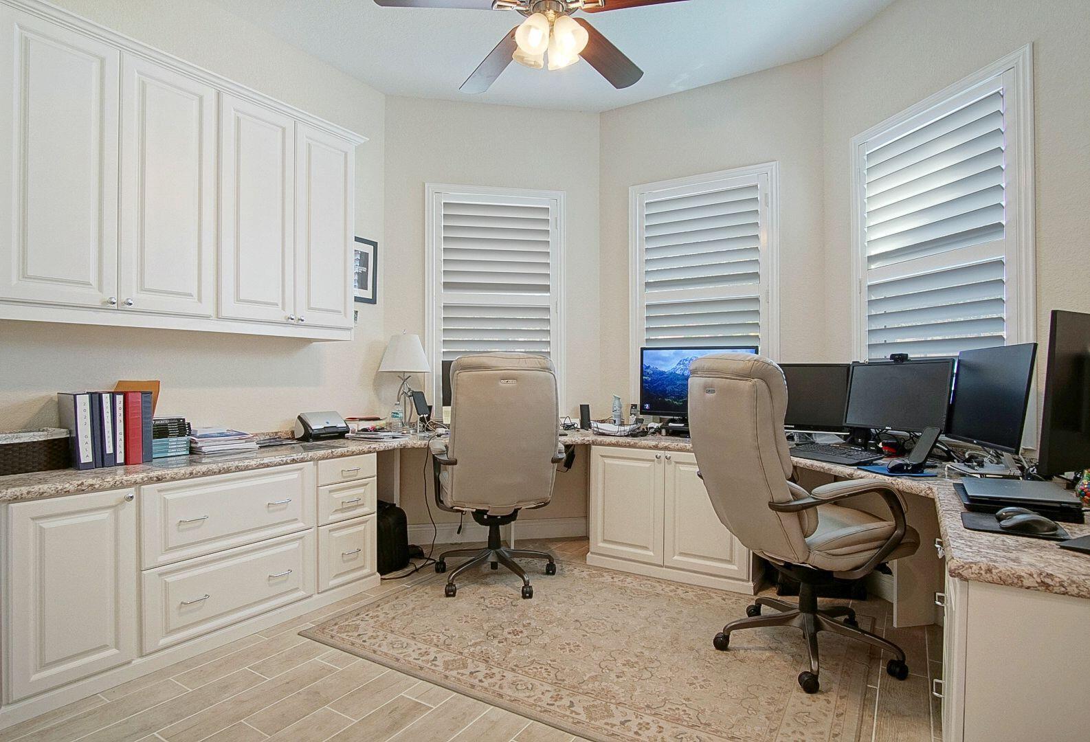 Florida living in this Kolter Florenza model home design with 3 Bedroom / 2.5 Bath home offering 2,255 sq. ft. of living space (2,949 total) with nice lake views and top-tier community amenities. The open-concept kitchen features 42'' cabinetry and flows into a spacious family room overlooking the water -- ideal for everyday comfort and effortless hosting. A formal dining room sets the stage for memorable gatherings, while a formal living room provides an elegant additional retreat. A custom office with dual built-in workspaces enhances productivity. Tile flooring runs throughout the main living areas, with carpet in the master and guest bedroom for added comfort. The extended screened lanai allows you to enjoy peaceful lakefront sunsets year-round.