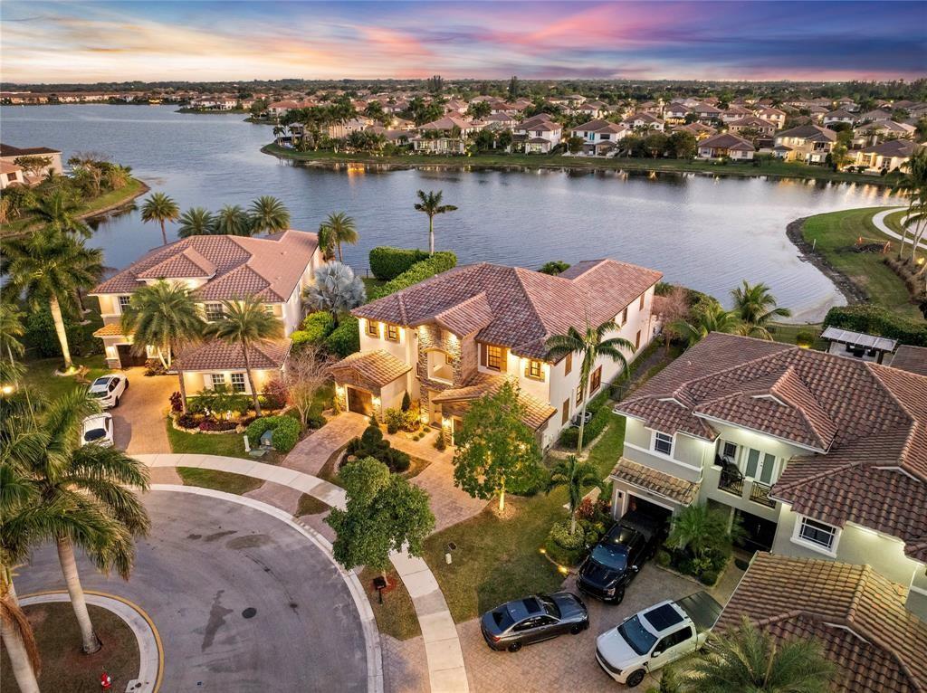Stunning Wentworth model offering 6 bedrooms, a loft, a private office, 7 full bathrooms, and a half bath. Built in 2014, this exceptional residence is situated on an oversized waterfront lot with breathtaking views. The outdoor living space features a travertine-paver patio and a custom saltwater pool, perfect for entertaining or relaxing. Notable upgrades include a new main A/C system, hardwood flooring on the stairs and loft, a stone-accented elevation, wrought iron staircase railing, impact windows and doors, gas service, an electric fireplace, crown molding, wood-grain front and garage doors, landscape lighting, designer lighting fixtures, and an integrated speaker system. Enjoy resort-style amenities including a clubhouse, pool, fitness center, splash park, and playground