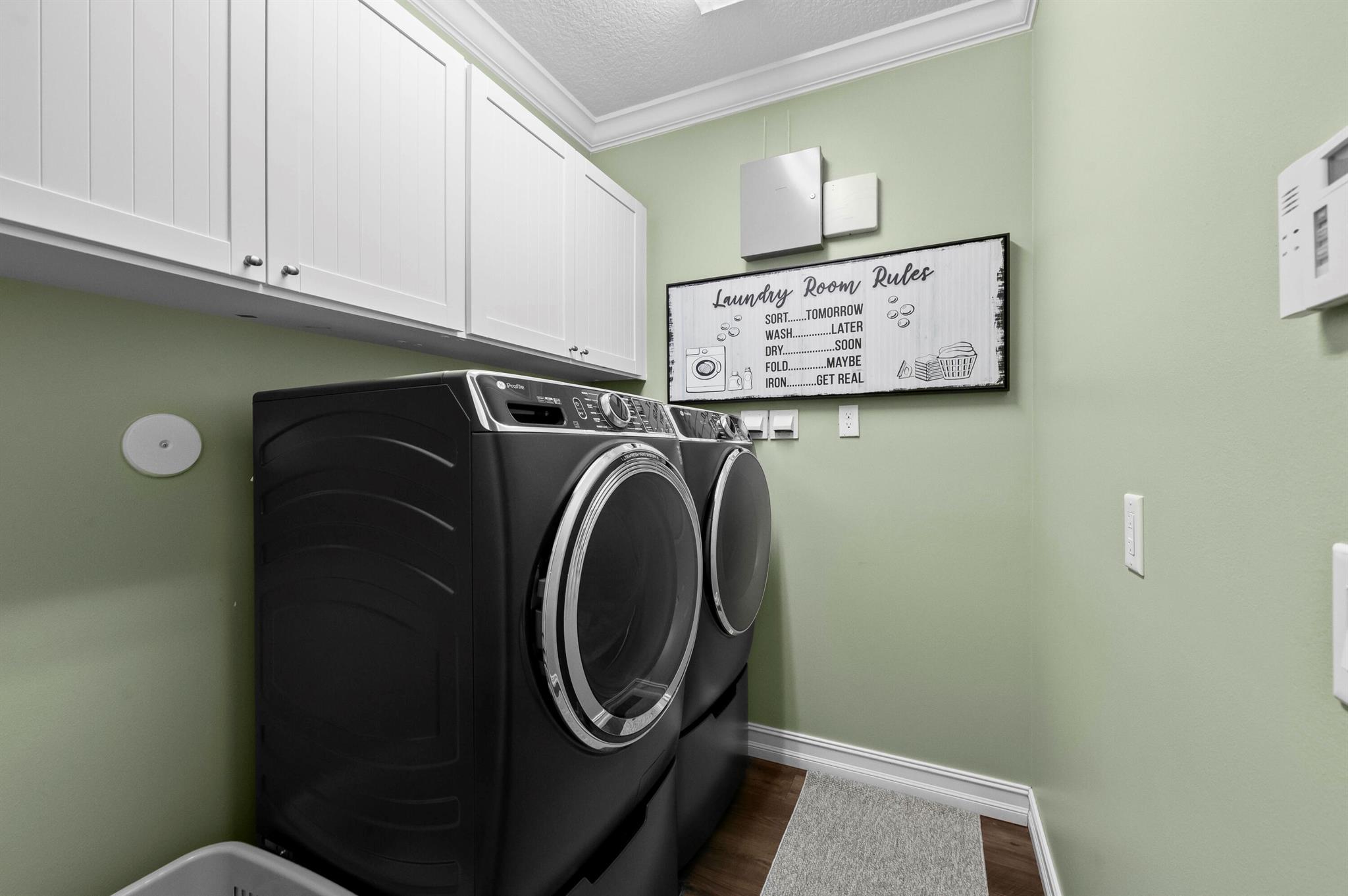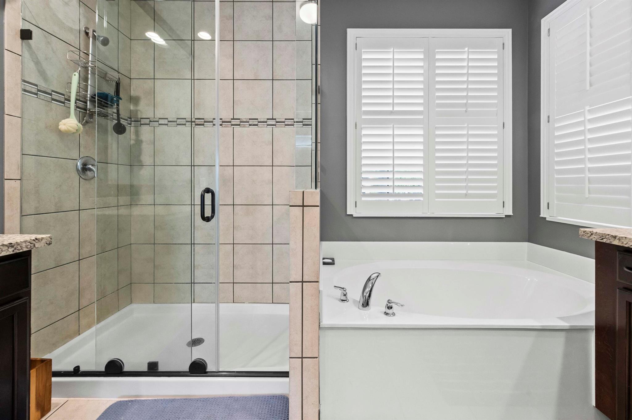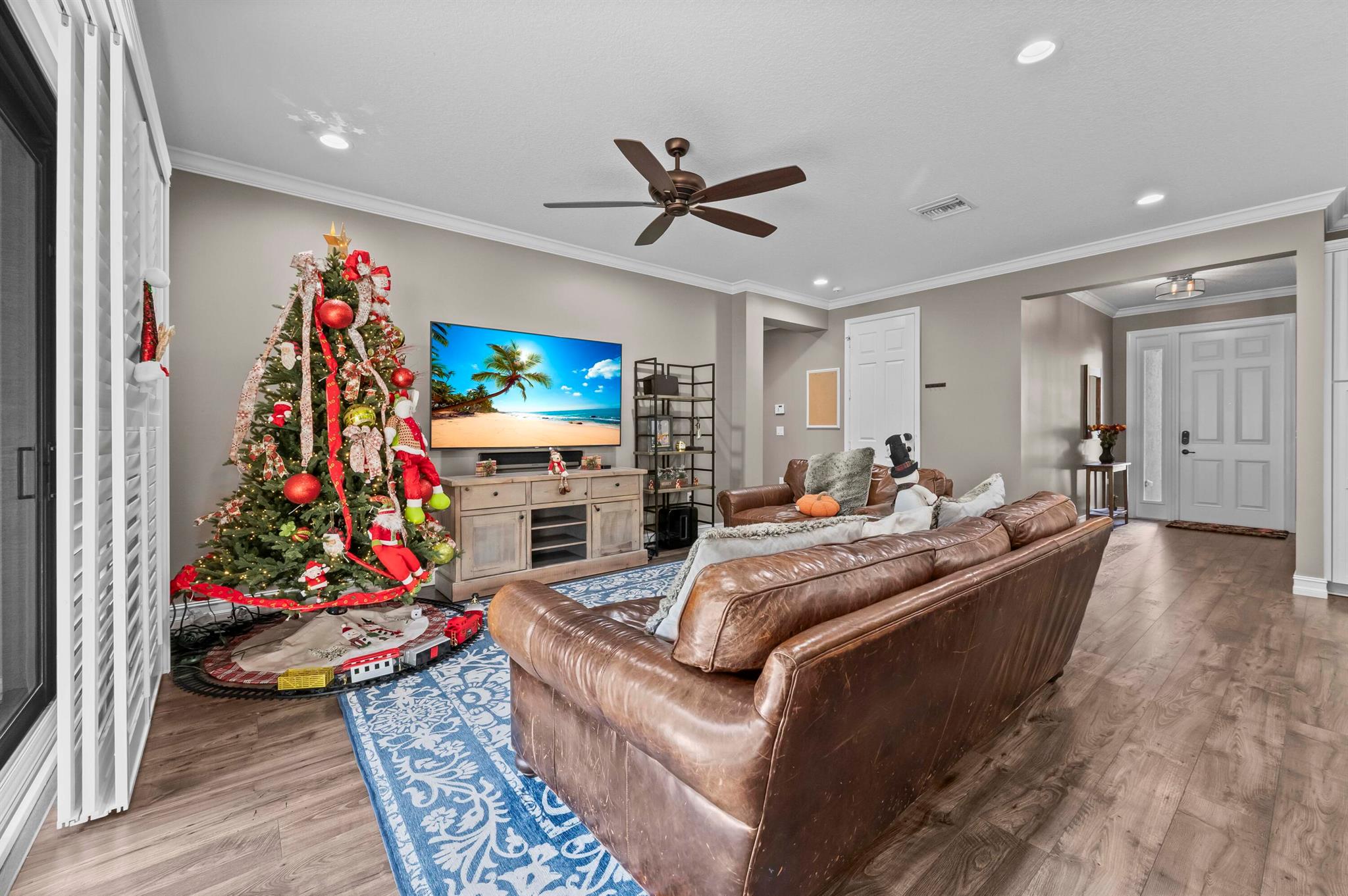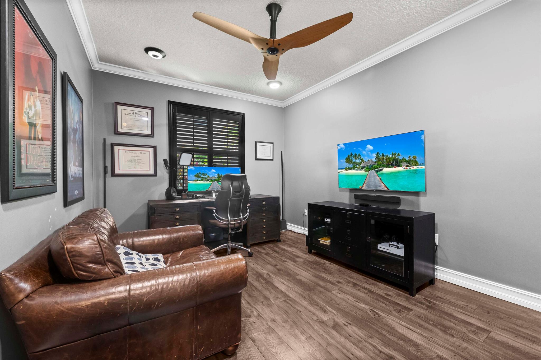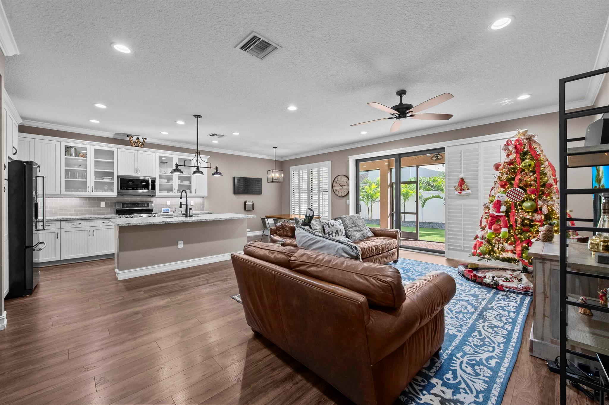 Experience the perfect convergence of luxury and sustainability in this stunning two-story residence, with 4 bedrooms, den/office, second story loft and 4 full bathrooms and a garage fully equipped with a Tesla wall charger. Fully paid off solar panels too! Step through the door to discover a meticulously designed interior featuring handsome wood-look flooring, elegant crown molding, and plantation shutters that filter natural light throughout the open-concept floor plan. The heart of the home is the gourmet kitchen, a culinary masterpiece equipped with crisp white cabinetry with glass-front uppers, gleaming granite countertops, a grey subway tile backsplash, and a massive center island that overlooks the spacious family room--perfect for effortless entertaining.