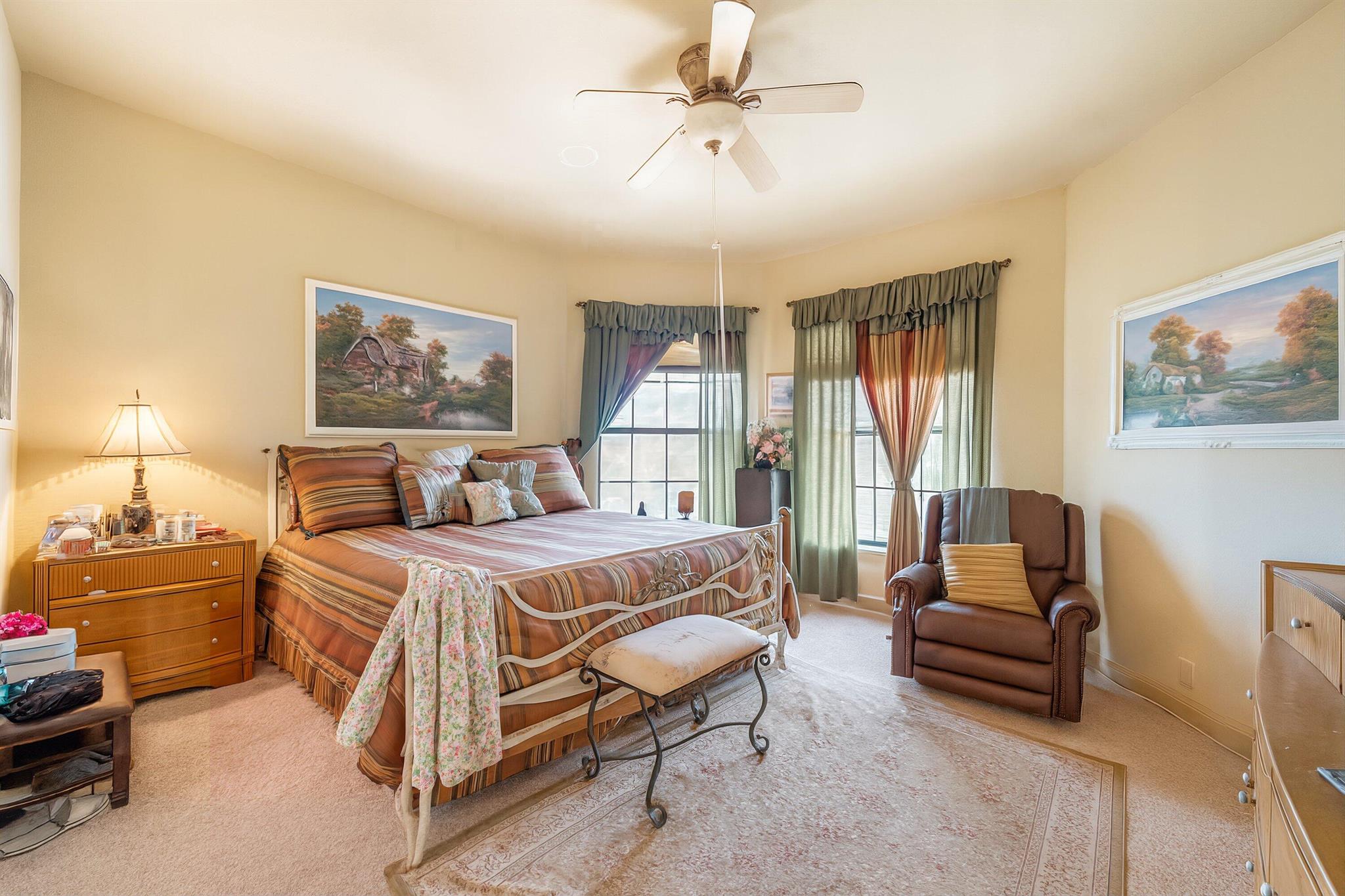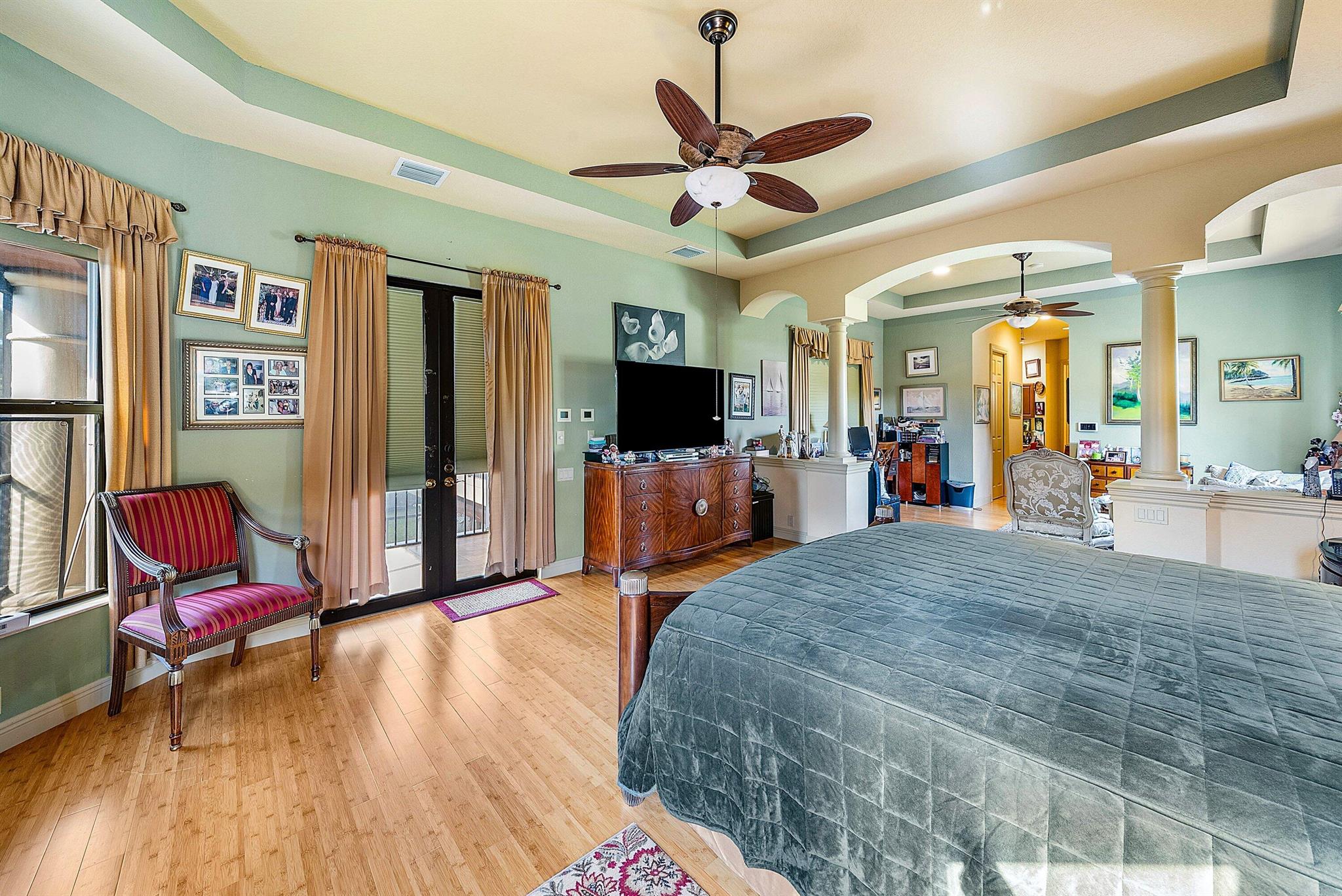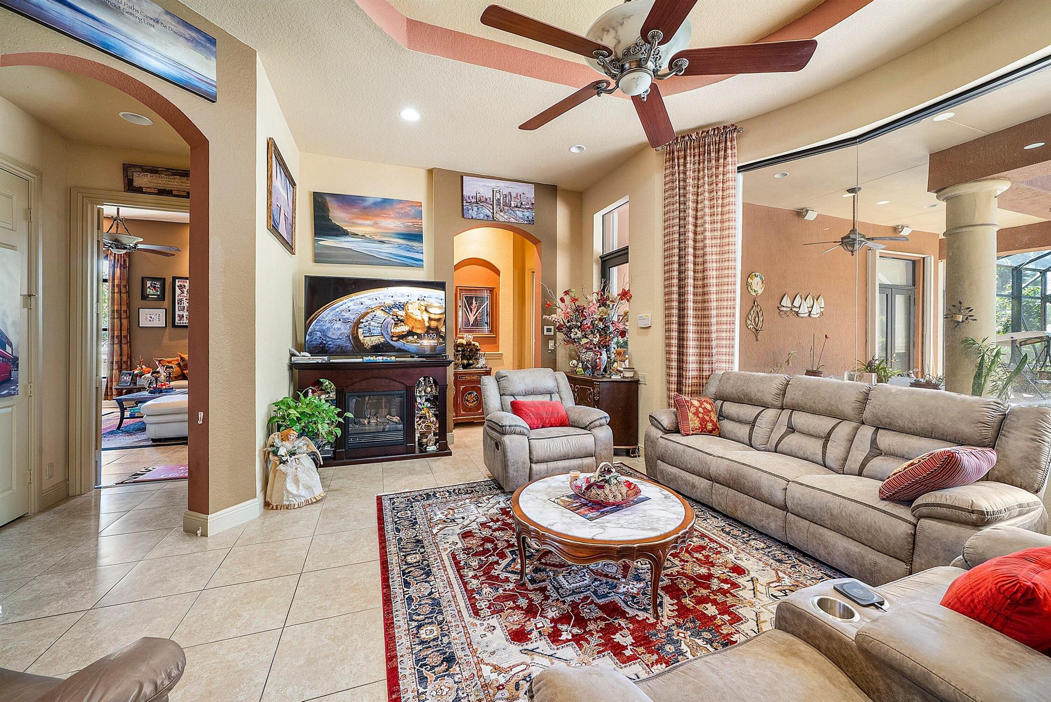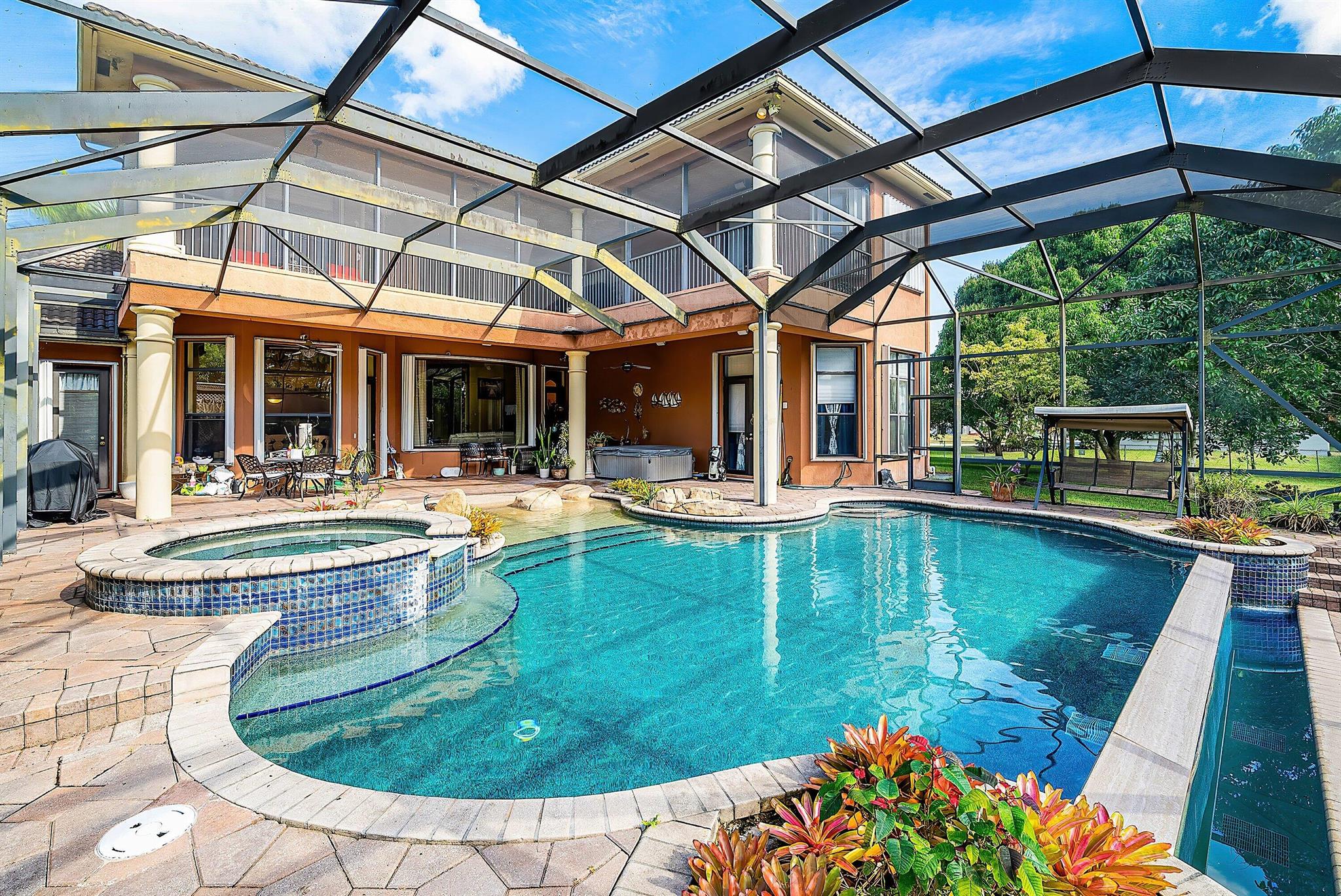 Sprawling estate on 1.15 ac of land available. Offered with 5 plentiful bedrooms plus media room, 5.5 bathrooms and covering over 5500 sf of living space. Featuring a serene zero entry pool within the screened patio, surrounded by lush landscaping and beautiful fruit trees.Step inside and follow the inviting walkway to the dining room, living room, and main living area. The home offers two exceptional primary suites--one upstairs and one downstairs. The first floor suite is adorned with peaceful garden views, two walk in closets and a generous bath with separate tub and shower. The living area also covers spans the back of the home offering effortless access to the fantastic patio.Upstairs, the expansive second primary suite showcases a large bedroom, generous sitting area, office