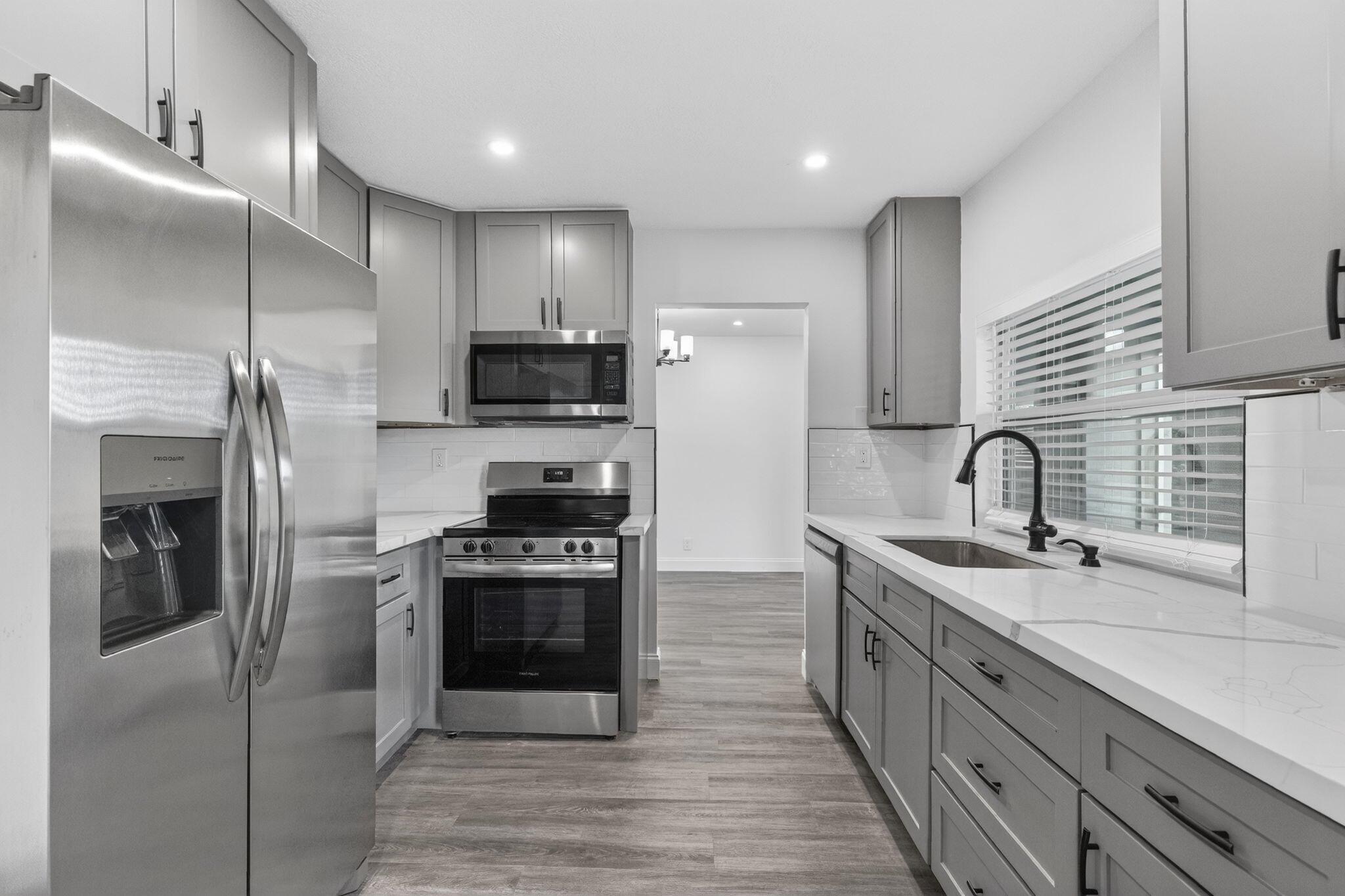 Located in a NON HOA community, this move in ready home is the best priced property for the level of renovations completed, offering exceptional value and comfort.Beautifully updated 2 bedroom 2 bathroom home featuring a new kitchen with modern finishes and updated bathrooms. Enjoy new vinyl flooring throughout, offering both durability and contemporary appeal. The roof was replaced in 2014 and the AC was serviced in 2025 for added peace of mind. Additional highlights include a new garage door and convenient washer and dryer hookups.