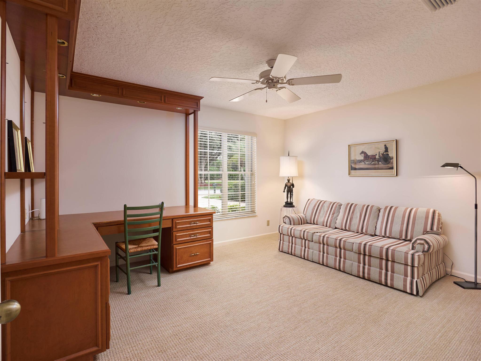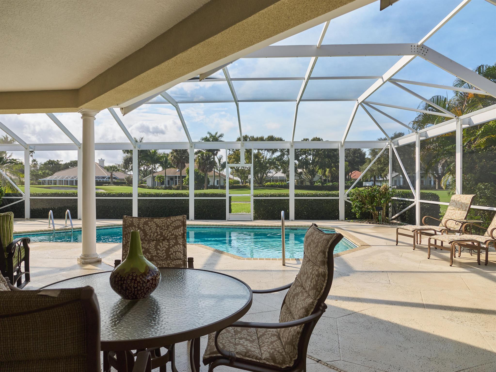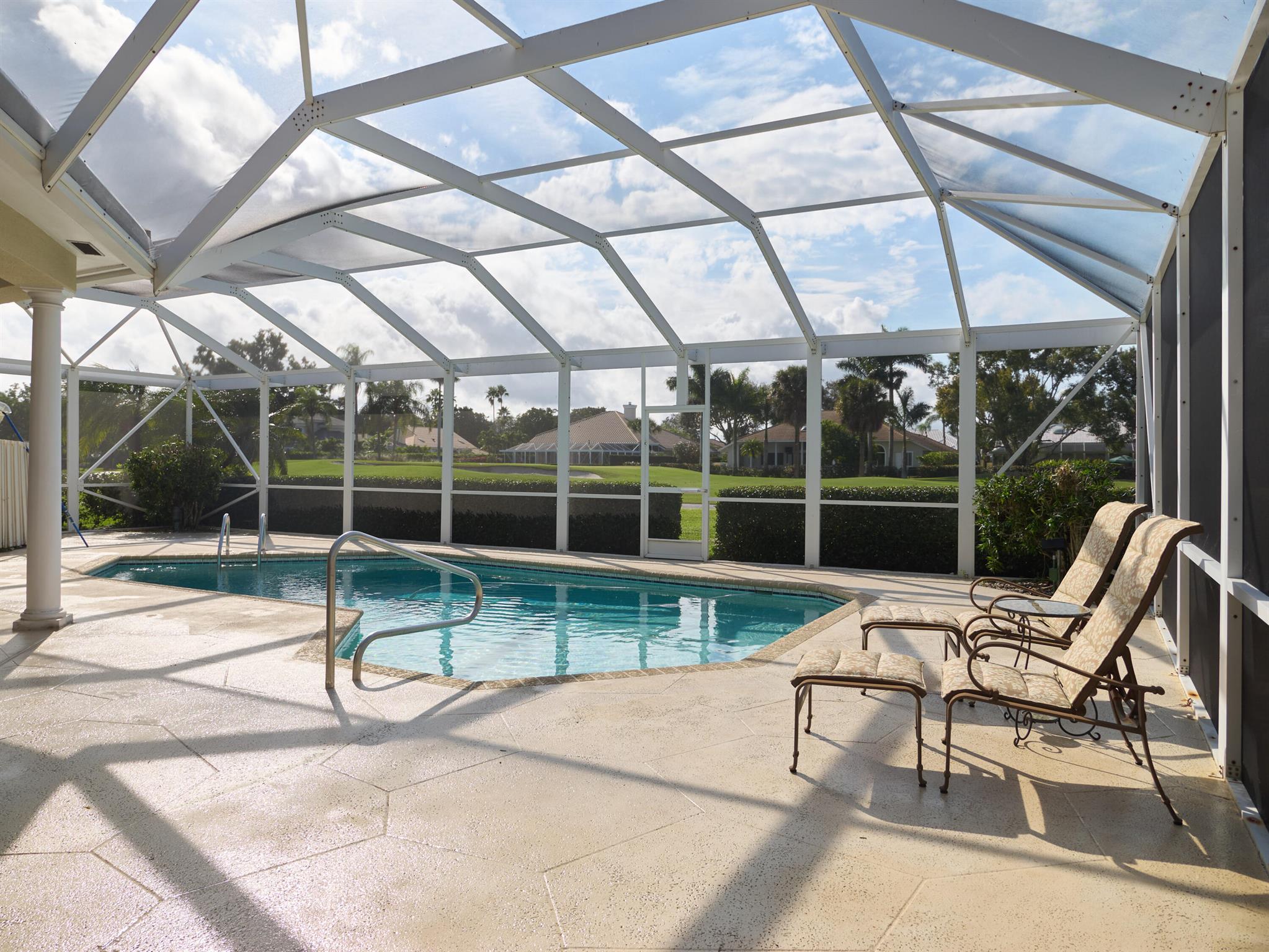 Located in the Preston neighborhood of PGA National, this 3-bedroom, 3-bath single-family residence offers 2,615 square feet of living space with a traditional, well-defined layout. Features include a 2-car garage, high ceilings, warm wood flooring, and an ivory-toned interior throughout. The home offers separate living and formal dining rooms, a kitchen with breakfast nook, and a flexible office/guest room. The expansive primary suite features patio access and an en-suite bath. Outdoors, enjoy a covered and screened patio with pool, privacy hedging, and serene views of the Palmer Golf Course. Additional highlights include a whole-house gas generator and accordion hurricane shutters. Situated on a peaceful cul-de-sac with green space across the street, this well-maintained home, owned by