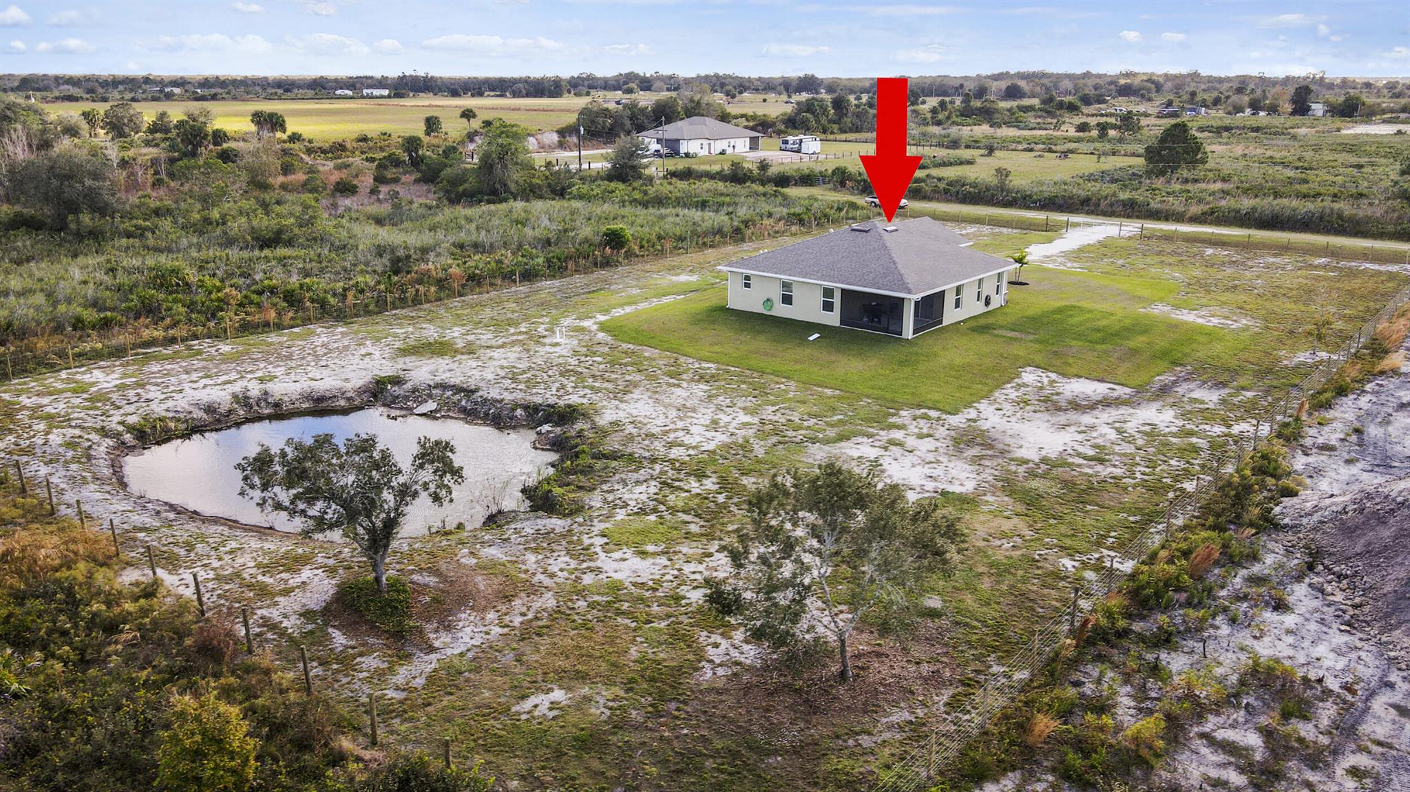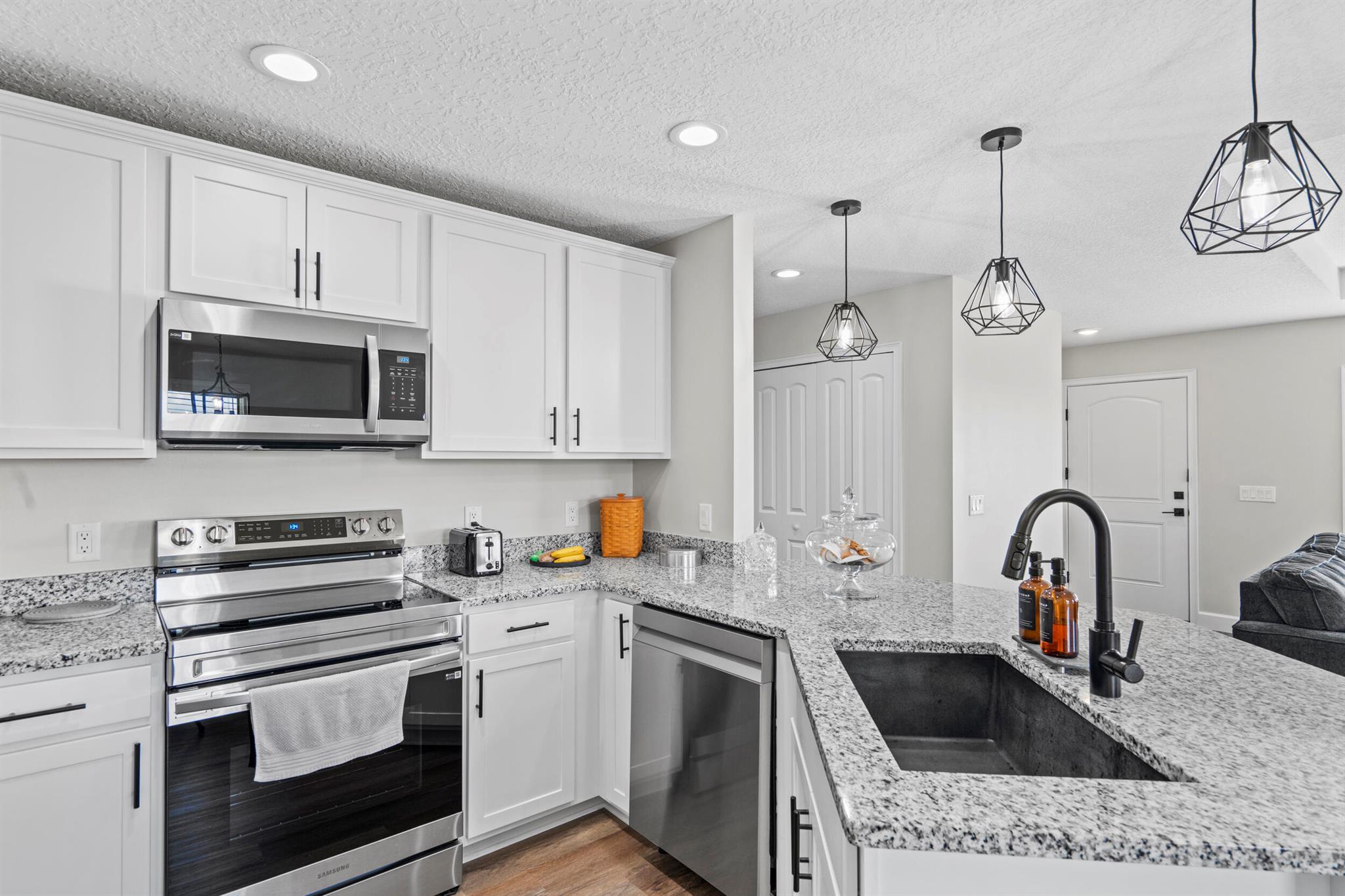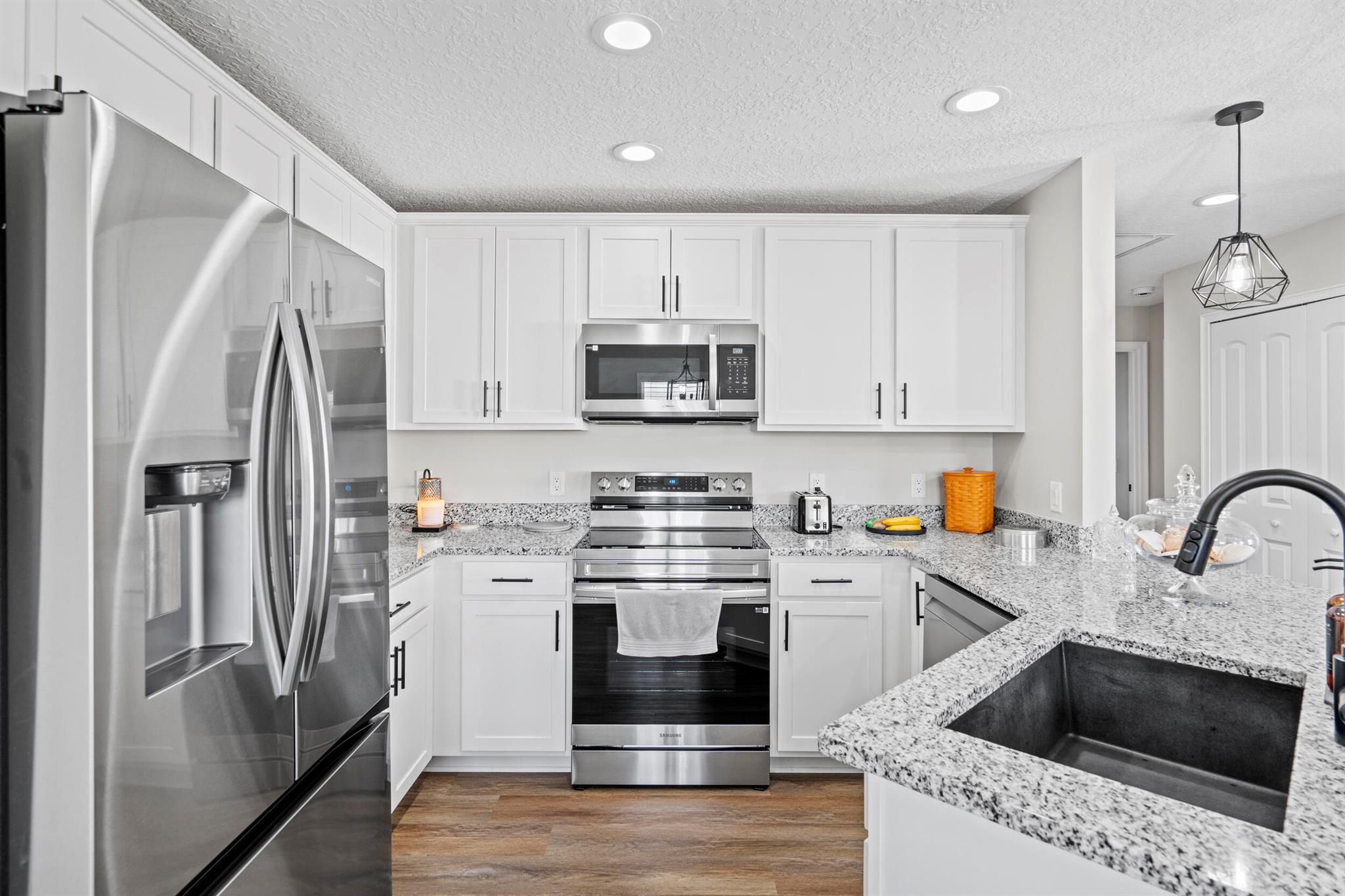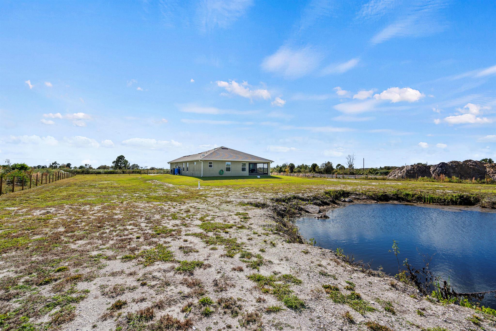 This beautifully appointed 3-bedroom, 2-bath residence with a 2-car garage sits on 1.25 acres and features a tranquil pond, offering both privacy and natural charm. With 2,141 total square feet and nearly 1,500 under air, the home showcases a stone-accented facade, durable laminate flooring throughout, and a cohesive blend of modern black fixtures for a sleek, contemporary aesthetic. The kitchen is outfitted with rich wood cabinetry, granite countertops, and stainless steel appliances, creating a functional and stylish culinary space. The expansive master suite includes dual sinks, wood cabinetry, a walk-in shower, and bold black hardware for a refined finish. Conveniently located just minutes from shopping and dining, this property combines comfort, style, and accessibility in a peaceful
